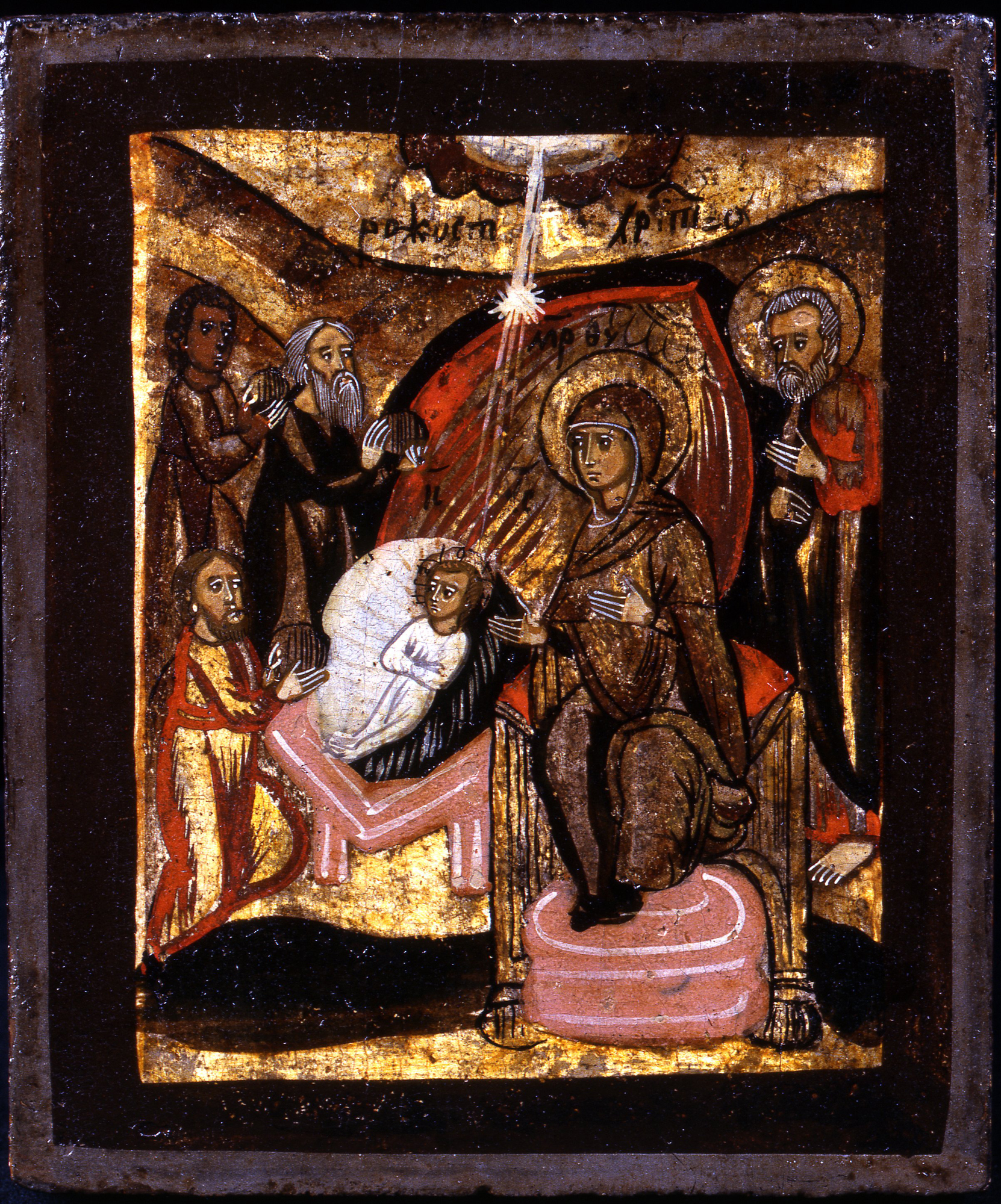 This icon focuses on a single image, the nativity of Jesus and the adoration of the Magi, in line with a tradition well established in the Byzantine and Russian areas, though the composition is greatly simplified in its narrative elements. The Child is laid in a bed of straw, before which kneel the three wise men who have come from the East guided by the Star of Bethlehem, shining high in the centre. The Virgin Mary is depicted seated, rather than lying down as in the Byzantine tradition. This element likely stems from Western European icon styles introduced to Russia mainly through prints. The seat resembles a throne, alluding to the royal dignity of the Virgin. Finishing off the composition is the elderly spouse Joseph, depicted in a somewhat removed position to the right. The scene takes place in front of a grotto that opens into a mountainous landscape. The icon, characterised by reduced narrative elements and the striking chiaroscuro contrasts used to define the bodily shape, has features similar to those in the icon of the Annunciation (inv. 1890 no. 9334), which may have been executed in the same provincial workshop in central Russia. The identical figures of the enthroned Virgin, even in size, appear to derive from the same model.