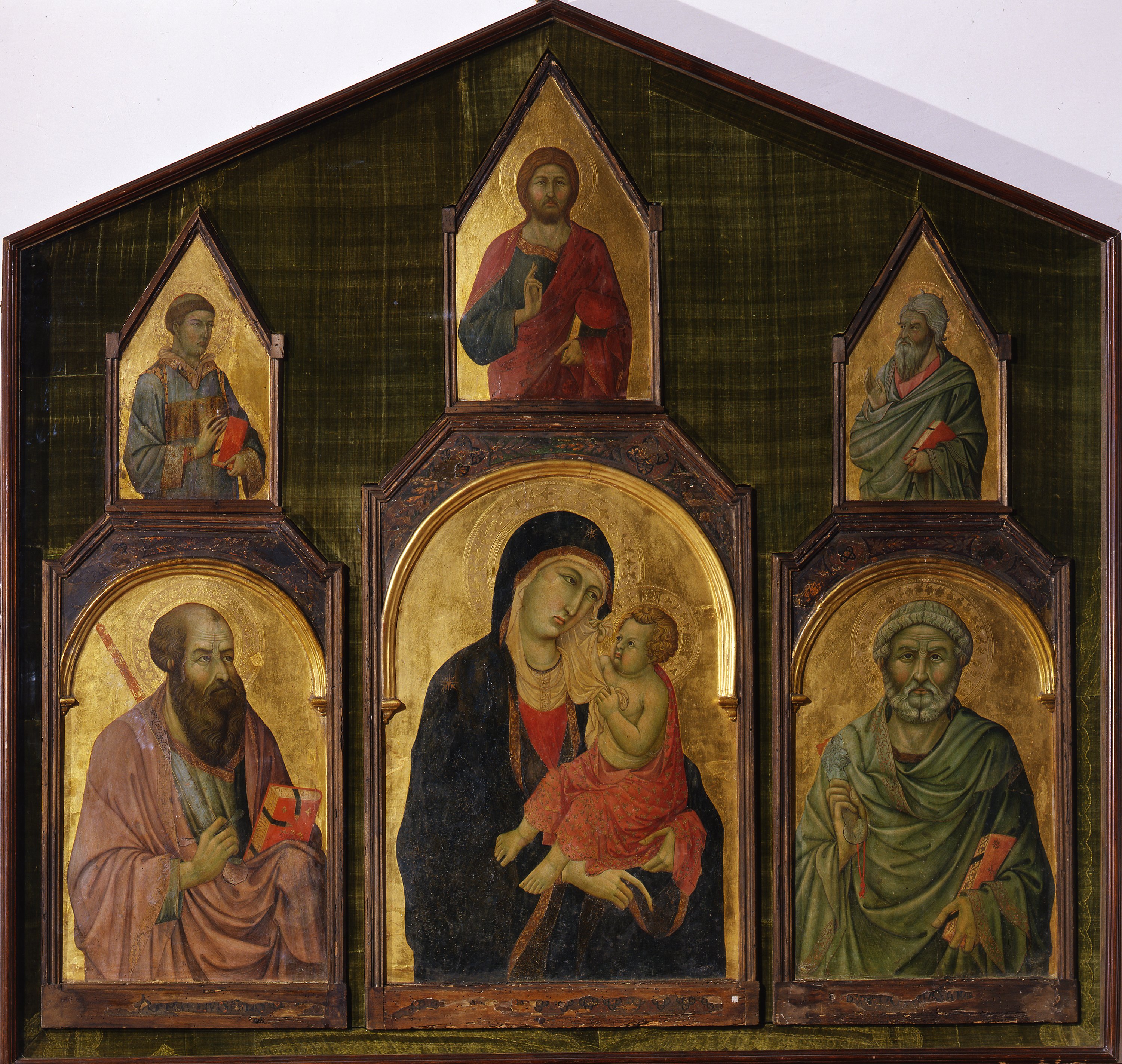 The triptych is attributed to Ugolino di Nerio, a faithful follower of the Sienese master Duccio di Boninsegna, who probably collaborated with a younger painter, Bartolomeo Bulgarini, to whom we owe the figures’ frowns and more marked expressions.