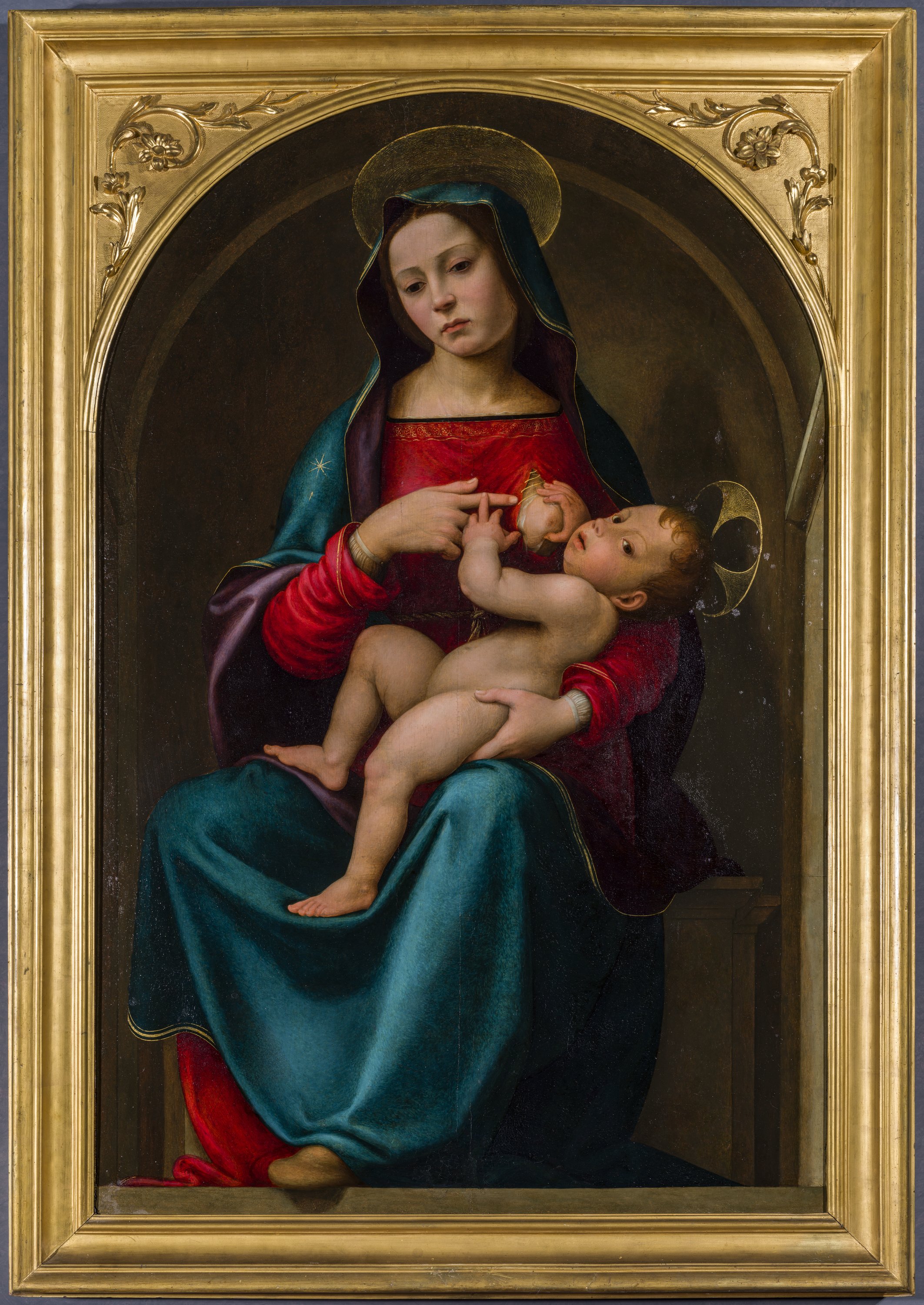 There are many illustrious models from the early sixteenth century that Bugiardini drew on for this tender maternity scene. The echoes of his early training in the forge of the Ghirlandaio brothers and Piero di Cosimo can still be glimpsed in the characteristic physiognomies - the small eyes set in regular faces with a rectangular forehead and a rounded chin - and in the luminous clarity of the painting, but those early teachings were overlaid by the simple and solemn spirituality of Fra Bartolomeo. In the calibrated use of shaded shadows to gradually define the volumes and articulation of the drapery, Bugiardini put his observation of Leonardo's Madonnas to good use. Just like the work of the master of Vinci, the panel, originally in San Michele a Castello in Florence, was purchased in 1780 and immediately exhibited at the Uffizi. In its place, a copy entrusted to Sante Pacini, an artist no stranger to the task of copying illustrious originals passed from time to time in Florentine collections, was placed in the original church.