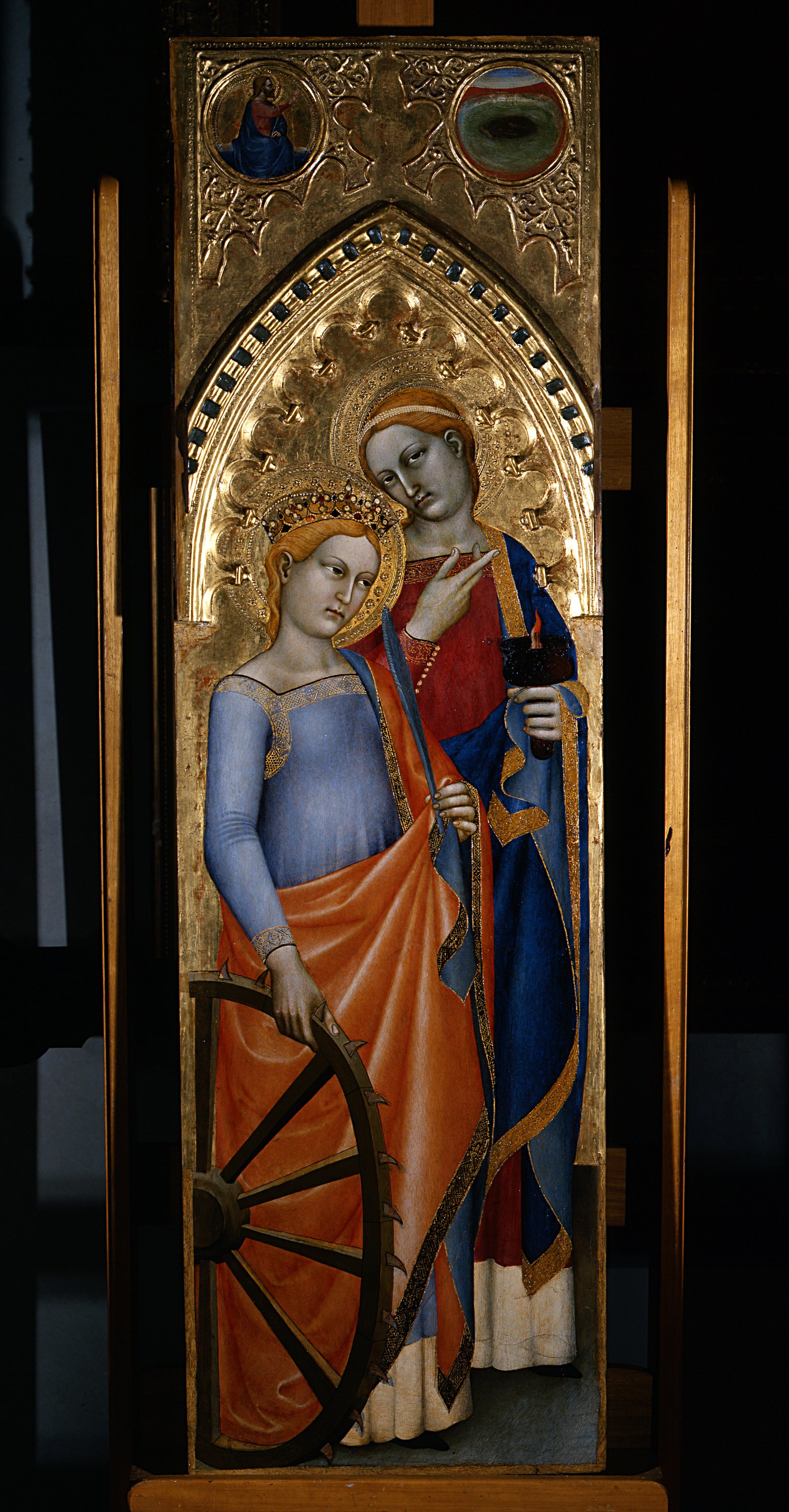 Having seen the work in the choir of the church of Ognissanti, Giorgio Vassari mentioned it in 1568, correctly attributing it to the artist from Lombardy, perhaps based on an inscription that was later lost. The structure of the entire work was designed to be very large and majestic and we can get an idea of what it would have looked like by comparing it with that of the polyptych kept in the Civic Museum of Prato, also painted by Giovanni da Milano in the same period. With the exception of a large empty space on the figure of the Virgin in the central compartment, the work in Prato has survived until the present day with the original carpentry almost intact.