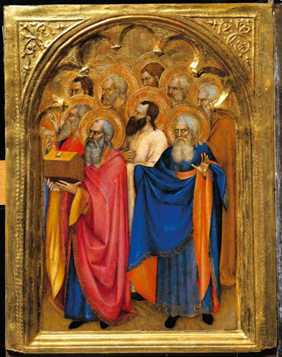 The five pieces of the predella enclose groups of smaller figures gathered together in choirs, each within a semi-circular arch: Virgins, Martyrs, Apostles, Patriarchs, Prophets.