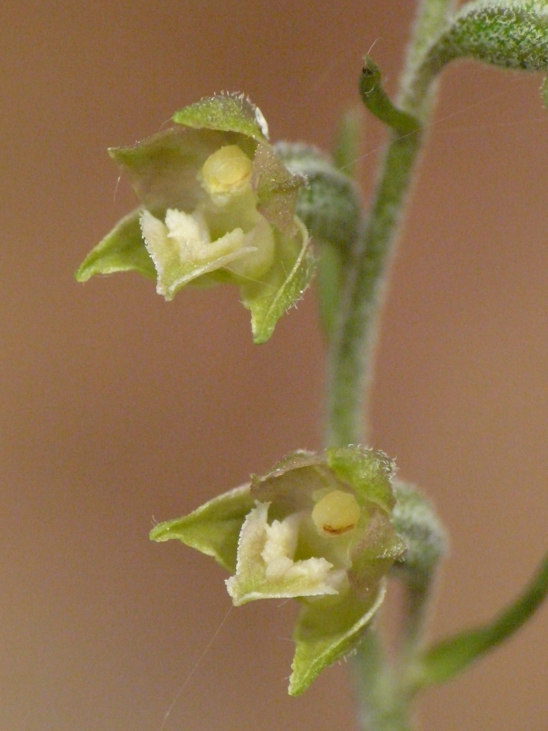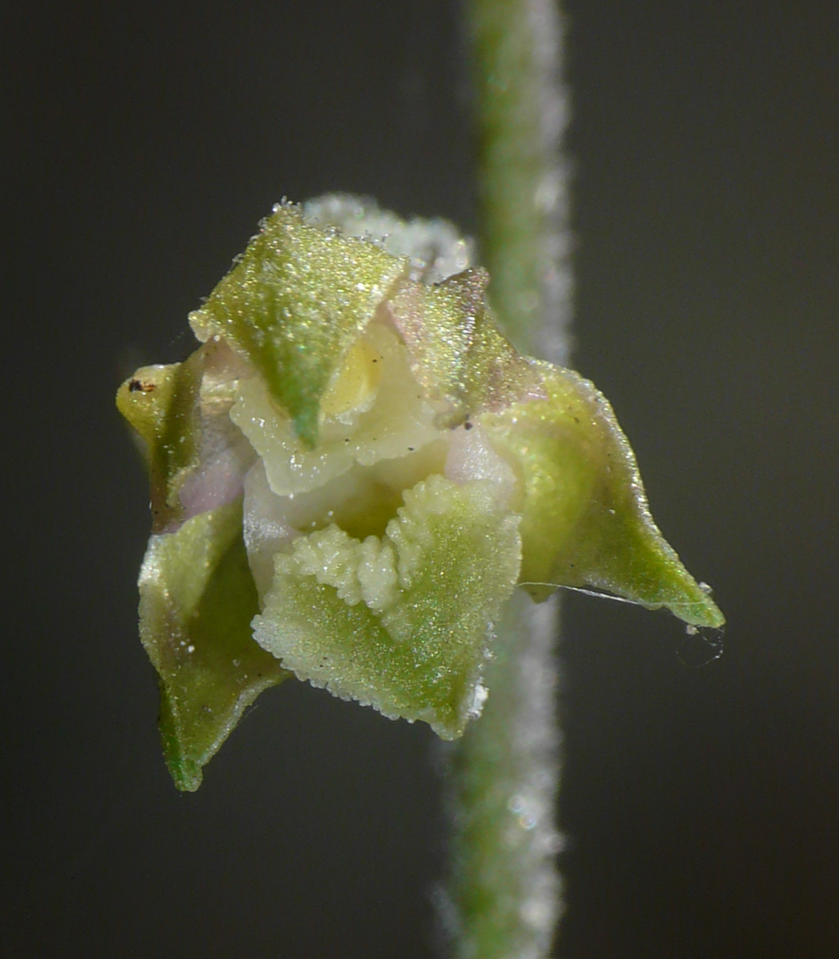 This frail-looking plant is 15 to 45 cm high, with greyish green stem, purplish at the bottom, and covered with bloom almost down to the base. The leaves may range from 3 to 9, are small, and of the same colour of the stem. The flowers are small, generally not very open, ranging between 4 and 30 in number. They release a slightly spicy fragrance. The labellum is shorter than sepals and petals, greenish in colour, at times suffused with pink, with a wavy-edged epichile and conspicuous rippling at the base.