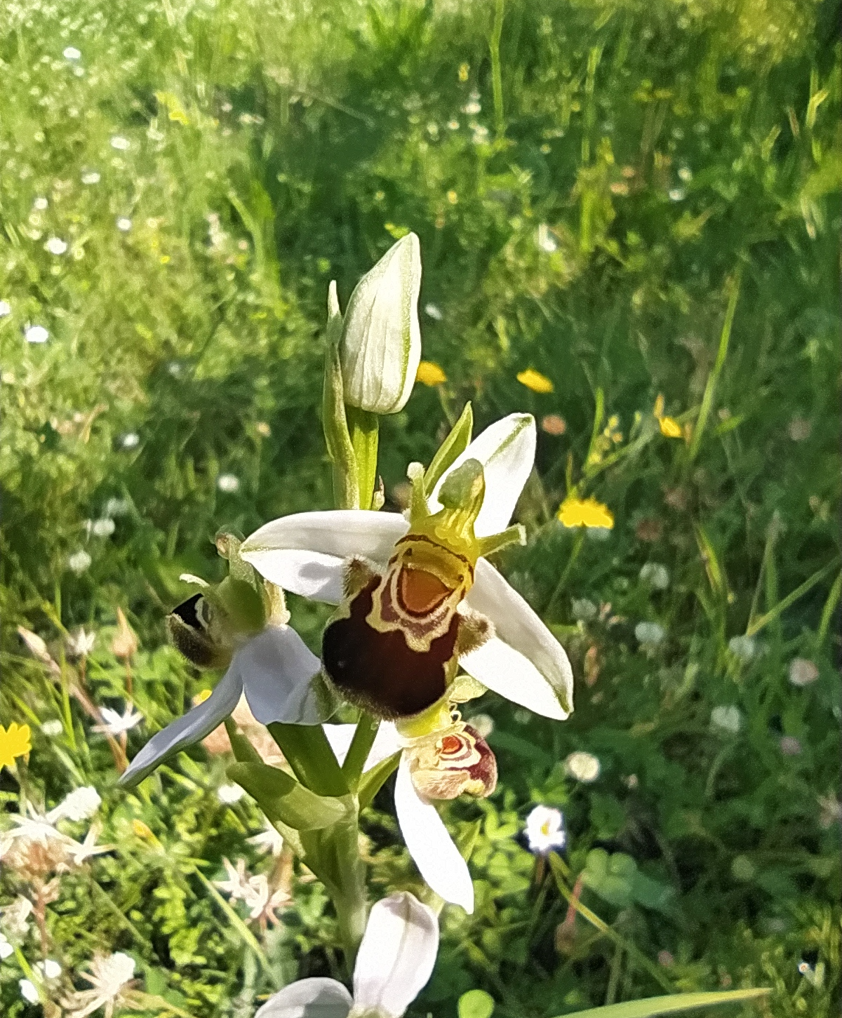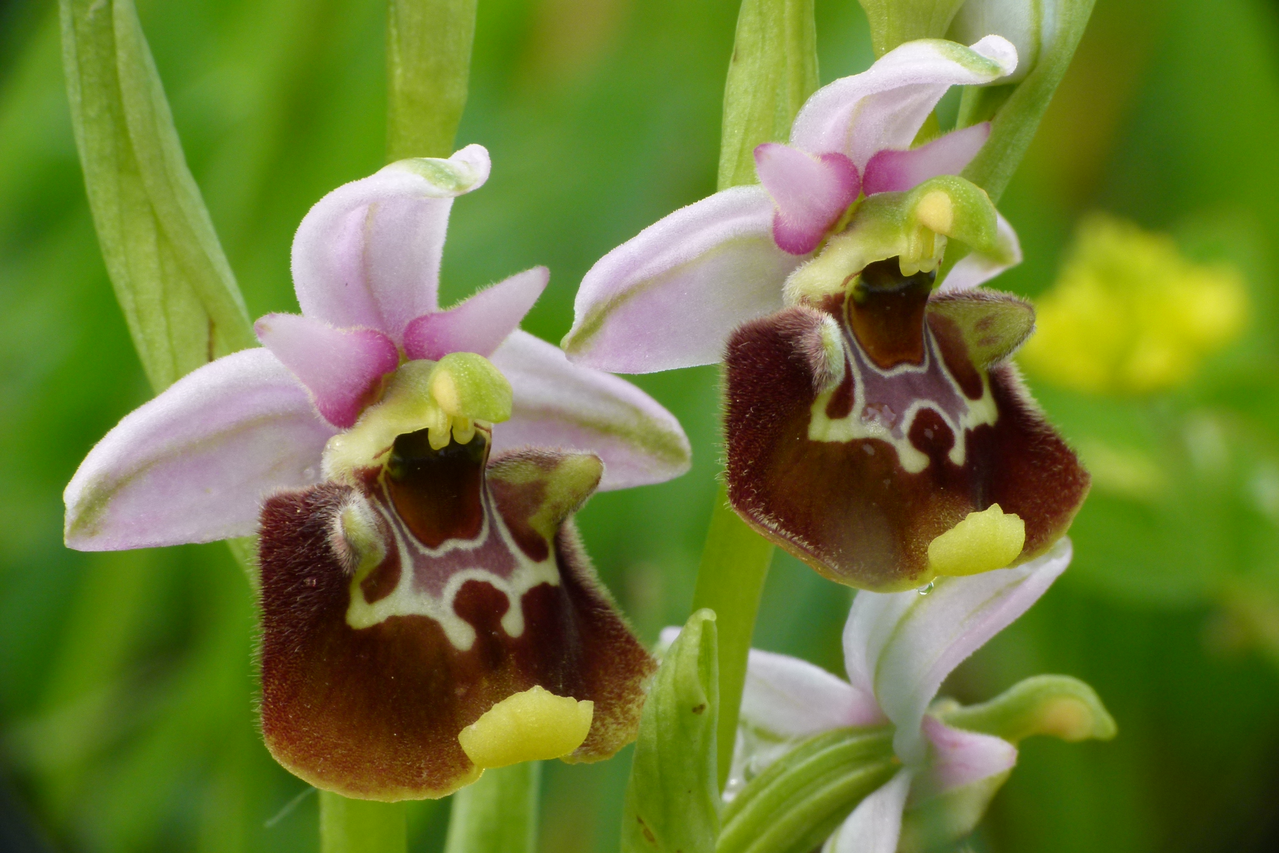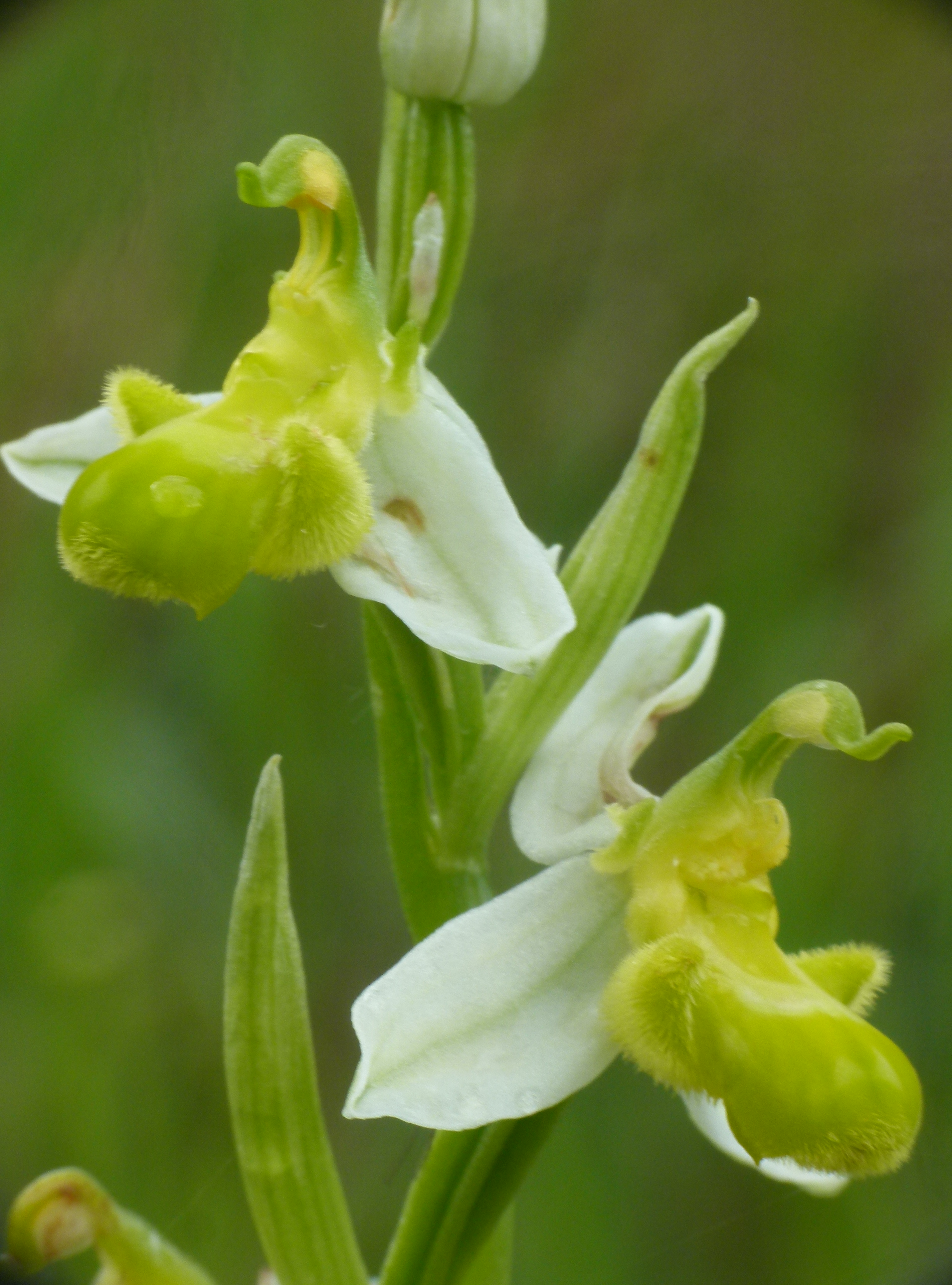 - Ophrys apifera var. chlorantha, with completely yellow labellum and white sepals.