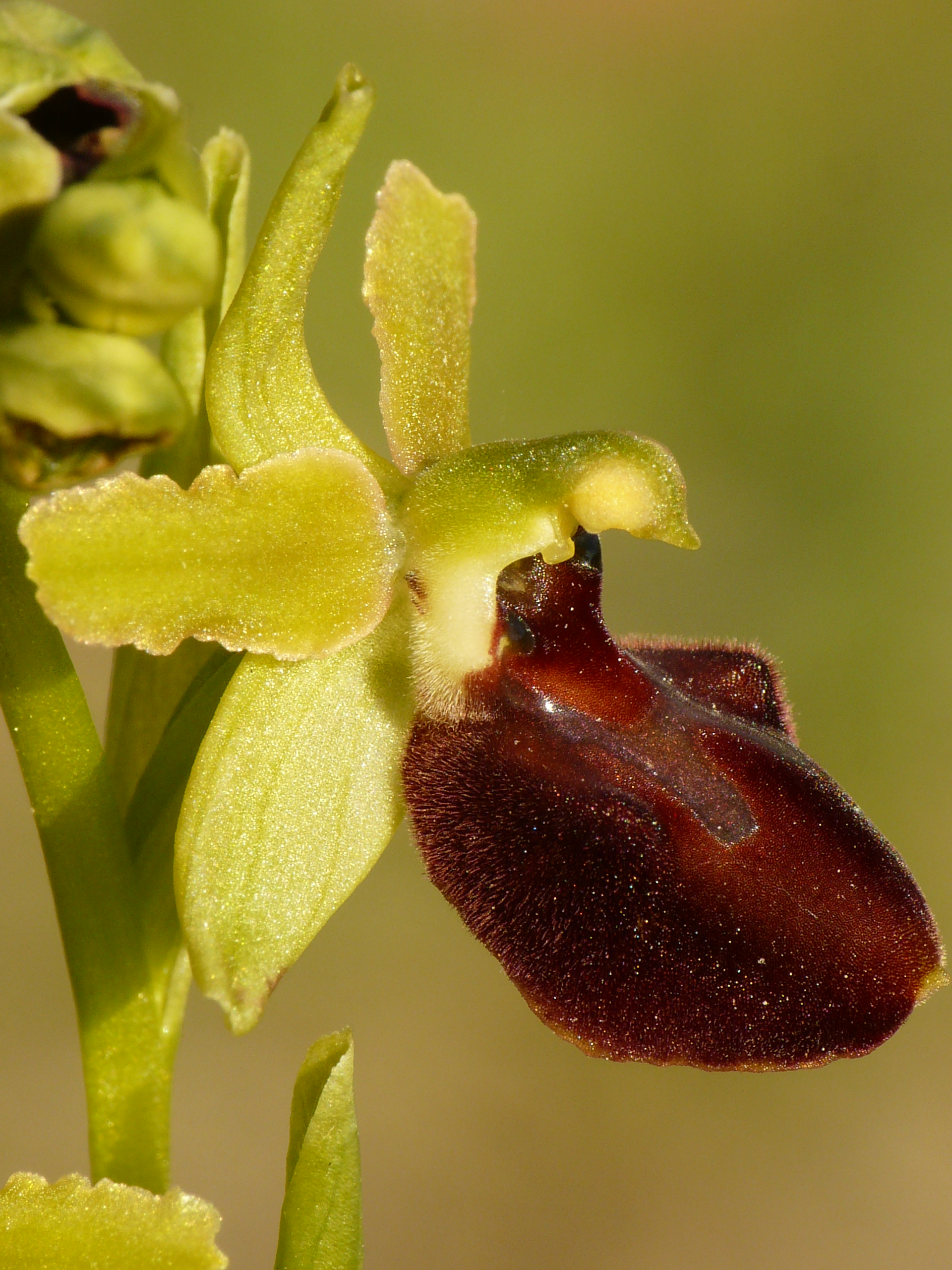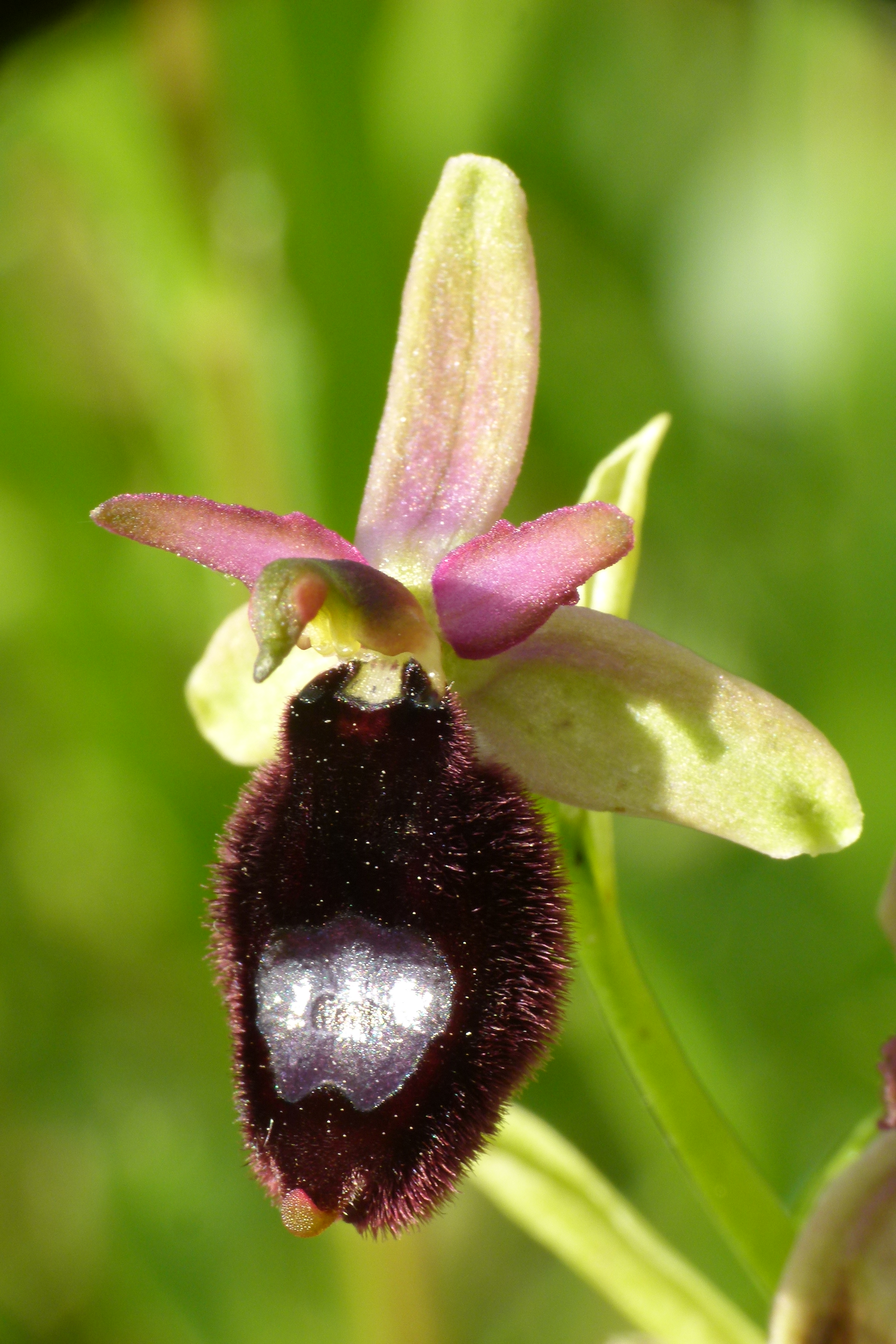 It is characterised by small to medium-sized dark flowers spaced along the stem, with green sepals and lateral petals, and with a longer than wide, convex labellum with three lobes, which is crossed by a longitudinal groove reaching down below the macula. The side lobes are folded downwards. The macula is large, dark, varying from blue to reddish. The hairiness of the labellum is very dense, reddish around the macula and darker (blackish) when descending towards the apex. The yellowish colouring of the edges is incospicuous.