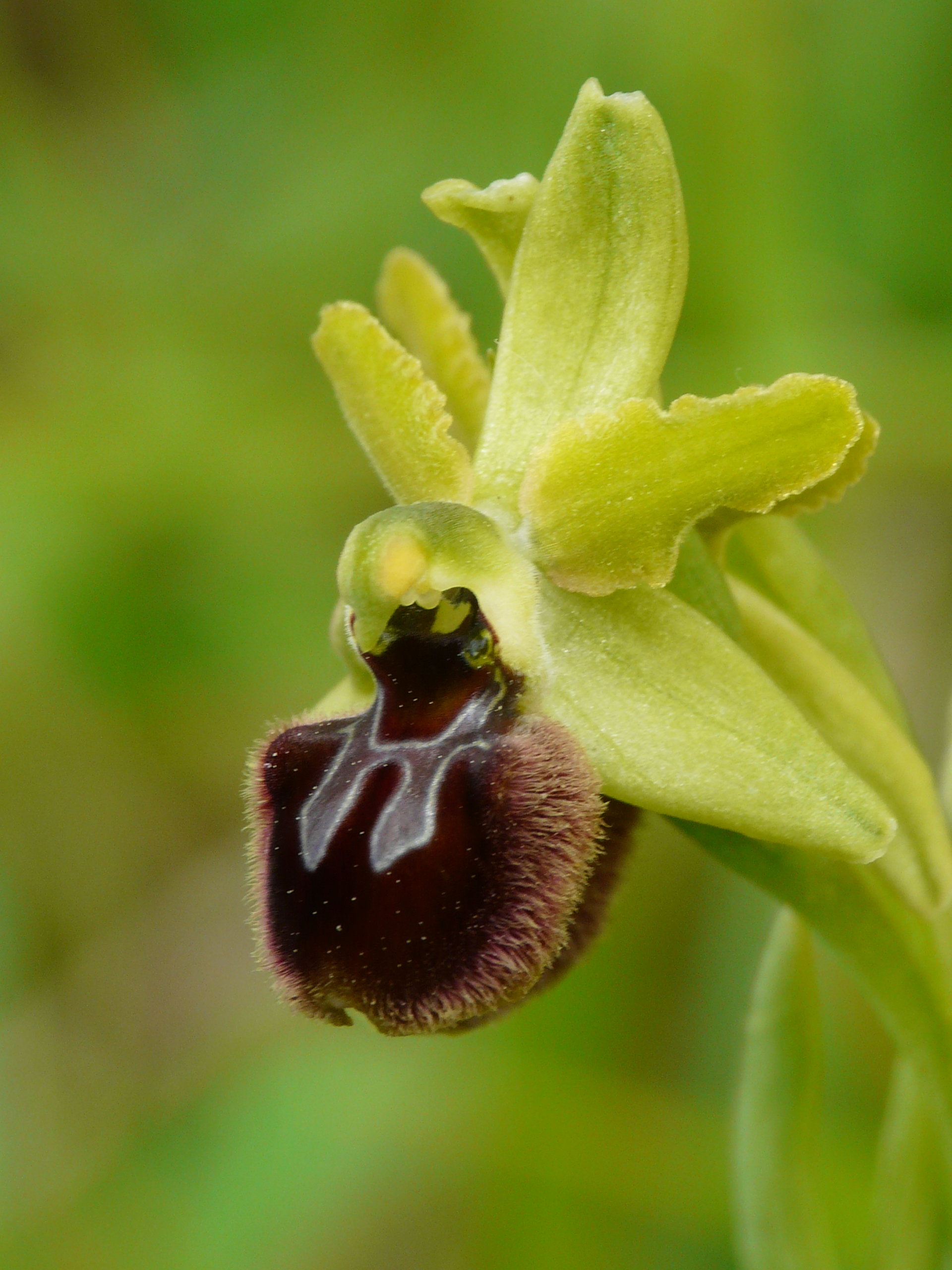 It is a slender plant with numerous, sparse flowers arranged at the top of the stem. The sepals are of a bright green or whitish green colour. The side petals are oblong, with parallel, wavy edges and truncated ends, of a brownish green colour and darker than the sepals. The labellum is square, very convex, brown, covered with a diffuse reddish-brown and yellowish hairiness at the edges; the macula presents a simple 'H' pattern. The gibbets are very pronounced, rounded, hairy on the outer side, while the apiculum is very small, yellowish green, pointing forward, and inserted in a small notch.