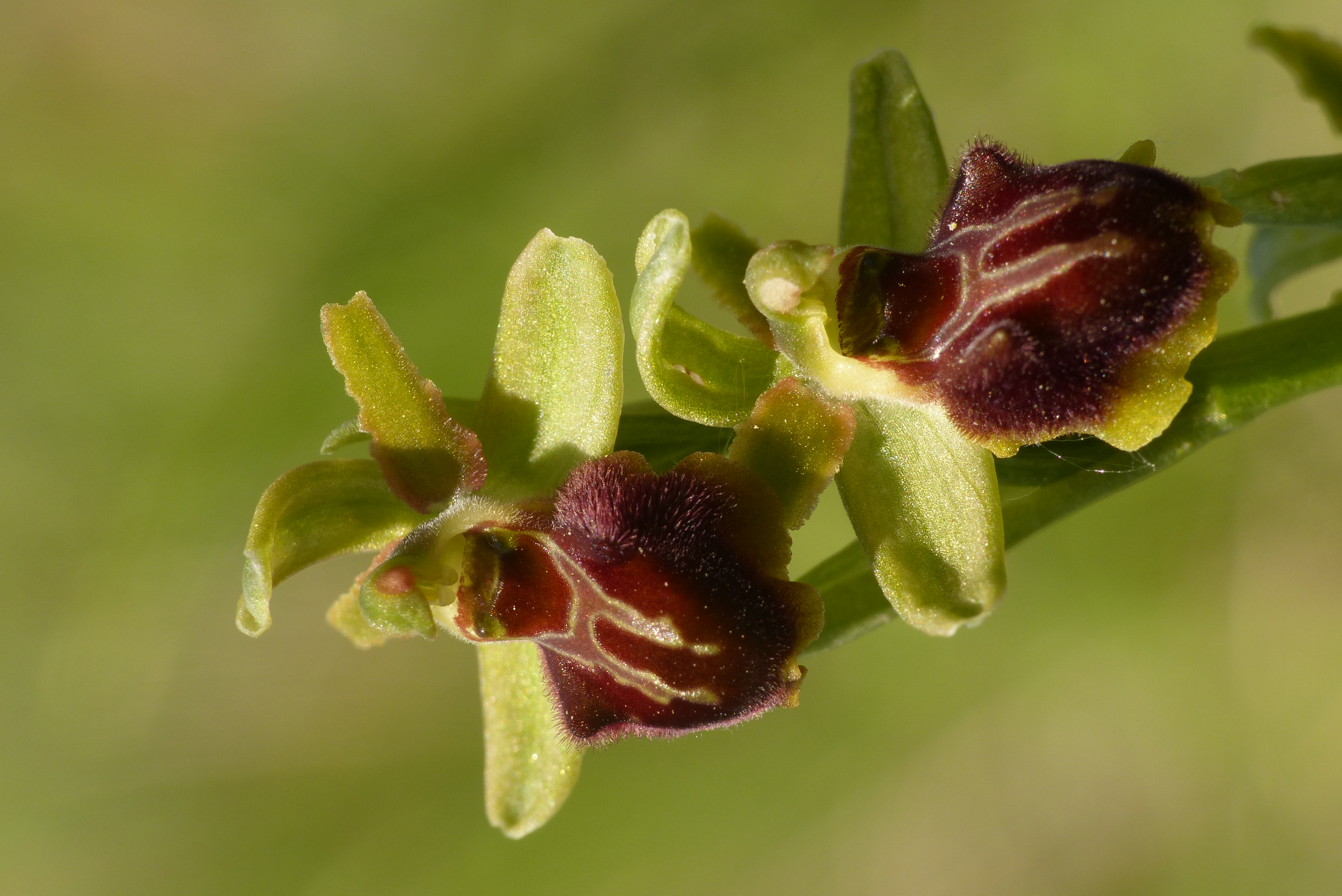 The flowers, which are located at the apex of the stem, are relatively sparse and rather large. The sepals are light green, with a darker central vein; the petals are oblong, rectangular, dark green, with parallel, wavy edges and truncated apex. The labellum is convex, oval, rounded and without gibbets, with clearly visible brown hairiness and a thin yellow edge. The pattern of the macula can be simple or very complex. The stigmatic cavity is small and narrow at the base. The gynostemium is inclined over the labellum. The pseudo-eyes are large and greenish.