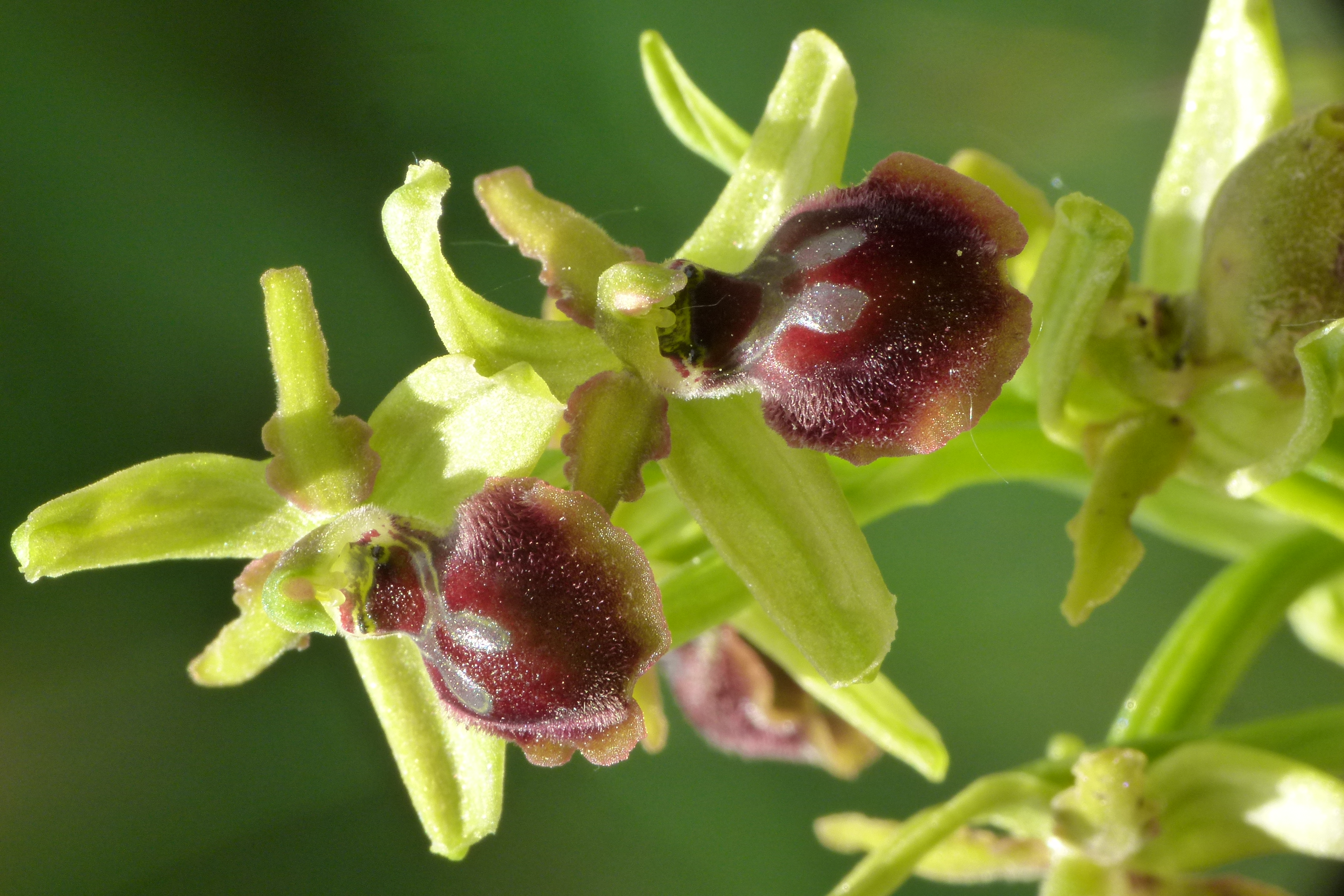 The formation of hybrids is a fairly frequent phenomenon in wild orchids, due to the use of pollinating insects to transfer gametes from one flower to another. For what concerns the genus Ophrys, to which belongs the hybrid under consideration, the flower resembles the shape of the female of the pollinating insect, which is also attracted by specific odour stimuli. The formation of hybrids is the result of a double “mistake” made by the male insect, which confuses the flowers of more than one species present in the area with its own female version.