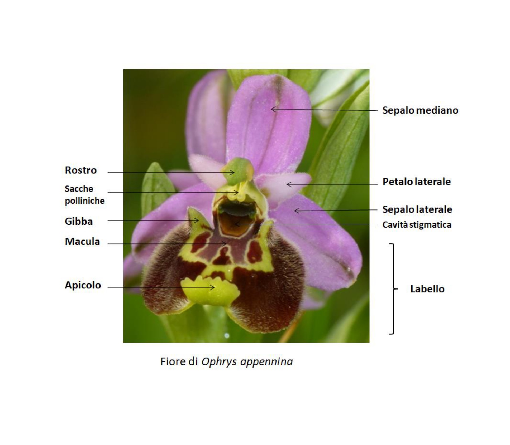 As in all Orchid species, the flowers have bilateral symmetry and are divided in six parts, three outer ones, called sepals, and three inner ones, called petals, which are arranged alternately. Ophrys have more or less elongated lateral petals, with smooth or variously rippled edge, while the petal placed in the lower position (labellum) is very developed and resembles the shape of the abdomen of a female insect, with velvety hairiness and a non-hairy pattern (macula or mirror), which can be more or less elaborate and is characteristic for each species. The attraction exerted by Ophrys on the pollinating insect is sexual and makes use of visual, olfactory and tactile stimuli. The labellum has important distinguishing features depending on the type of insect to be attracted, which also facilitate the classification of species, such as the presence or absence of a basal appendage, called apiculum, and two lateral outgrowths, called gibbets, which, when present, are more or less accentuated. On top of the labellum there are male and female reproductive organs, joined together to form the so-called gynostemium, which in turn is placed above an opening called stigmatic cavity. The area around the gynostemium resembles the head of the female, with the so-called pseudo-eyes placed on either side of the stigmatic cavity and with the basal field below it. The labellum serves as a landing field for the male insect. The male sticks its head inside the stigmatic cavity, which fits it perfectly, and in doing so removes the sticky pollen that hangs from the apex of the gynostemium itself, called rostrum.