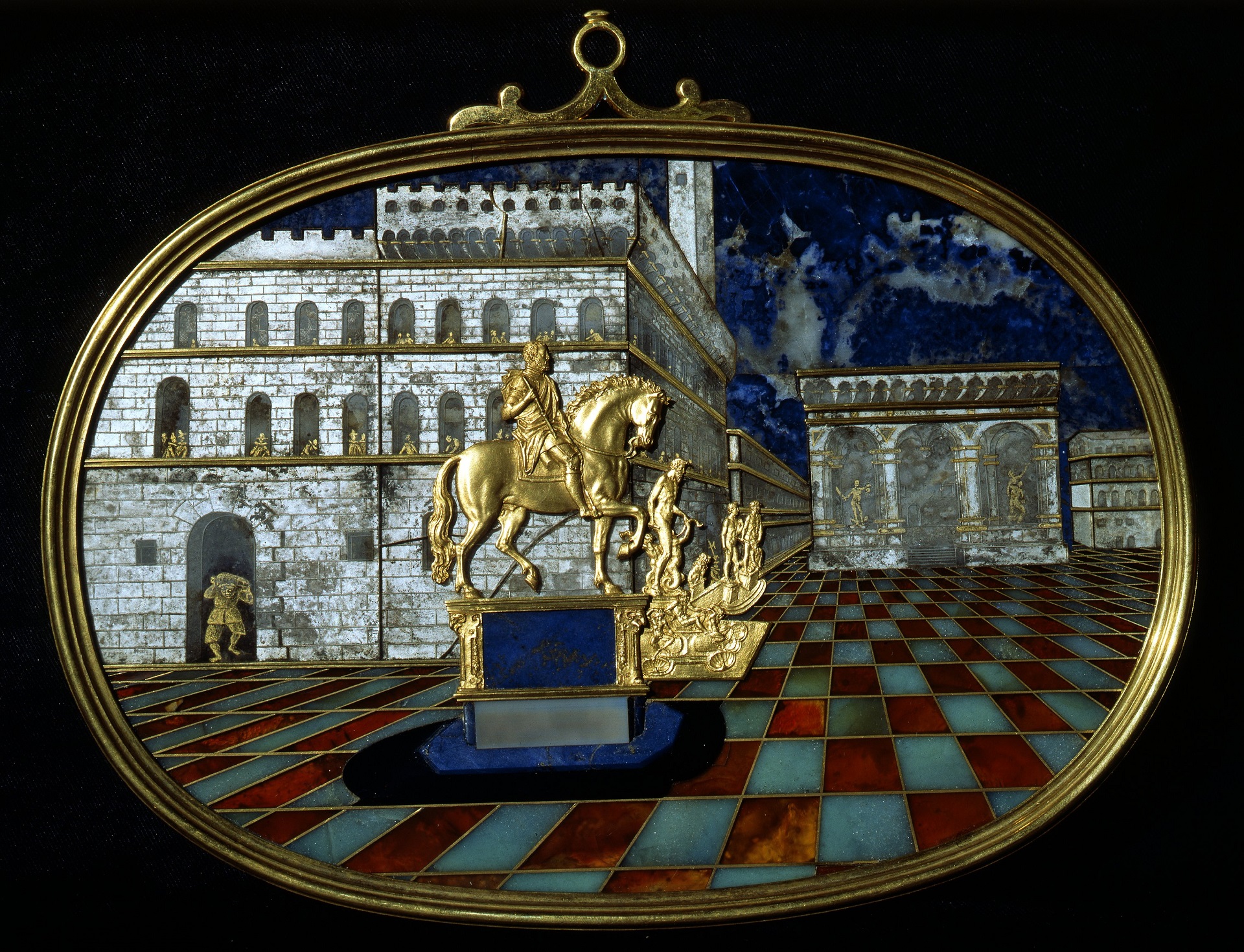 The oval was commissioned by Ferdinando I de’ Medici from two of the most gifted artists in his workshops. Bernardino Gaffuri (or Gaffurri), who came from a famous Milanese family of pietra dura engravers, called to Florence by Francesco I de’ Medici in 1575, and the court goldsmith Jacques Bylivelt, originally from Delft. In a contract dated 12 July 1599, Gaffuri was appointed to add the pietra dura parts of the plate, while Bylivelt was commissioned to create the embossed gold work, which he completed in early December 1600. For the view of the piazza, Gaffuri used a woodcut, published in a booklet from 1583, printed on the occasion of the unveiling of the Rape of the Sabine Women by Giambologna. Bilivelt added the gold relief work to the Equestrian Statue of Cosimo I, erected in May 1594.