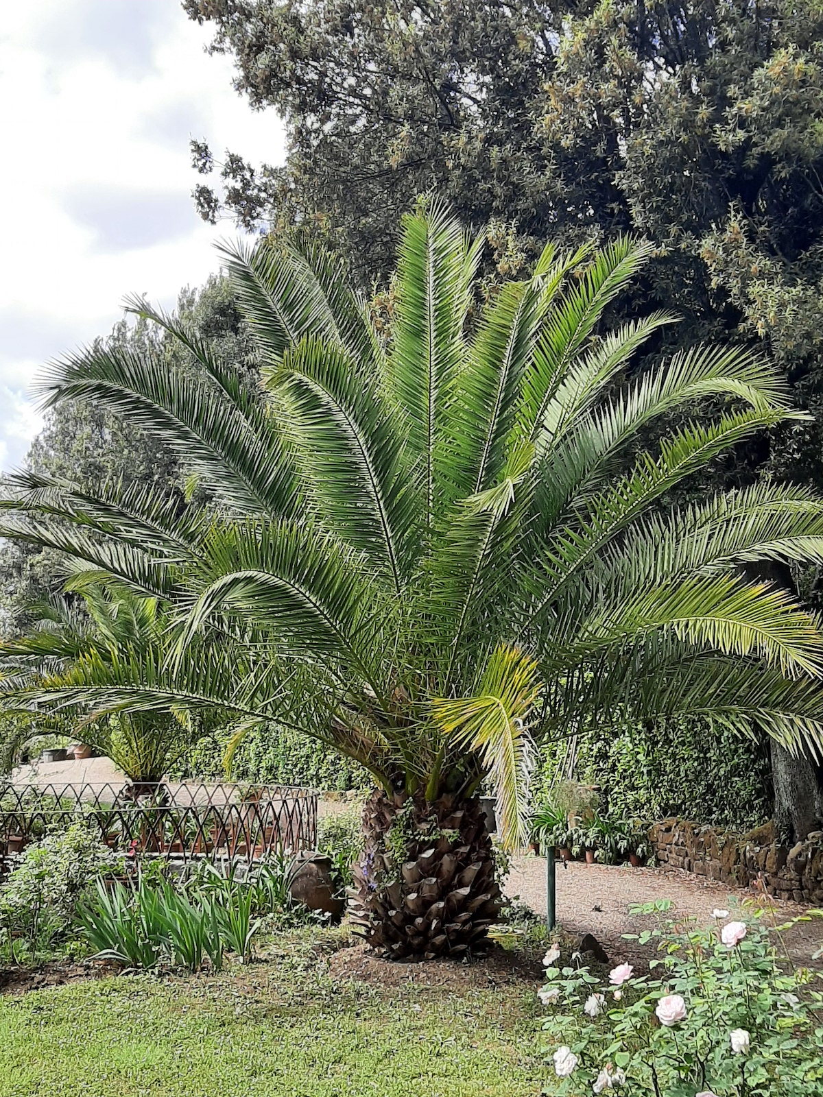 Native to the Canary Islands, it can be found in all islands where it is used to produce palm honey, a syrup obtained by boiling the sap extracted from incisions at the top of the trunk. It has an erect and robust trunk, of a dark brown or greyish colour, and can reach up to 15-20 m in height. The curved fronds, of a bright dark green colour, are very large and can grow up to 4-5 metres long; the petiole measures up to a metre in length and has numerous sharp spines. Canary Islands palms are dioecious plants (with male and female specimens). Their orange-brown flowers blossom in late spring among the fronds: those of female plants are longer and more showy, and in summer they are replaced by clusters of oval berries, yellow-orange in colour and about 2 cm long, edible but not particularly palatable. It is very popular as an ornamental plant in most Mediterranean regions and the subtropics, where temperatures do not fall below -10/-12 C. In Europe it is cultivated in every coast of the Mediterranean Sea.