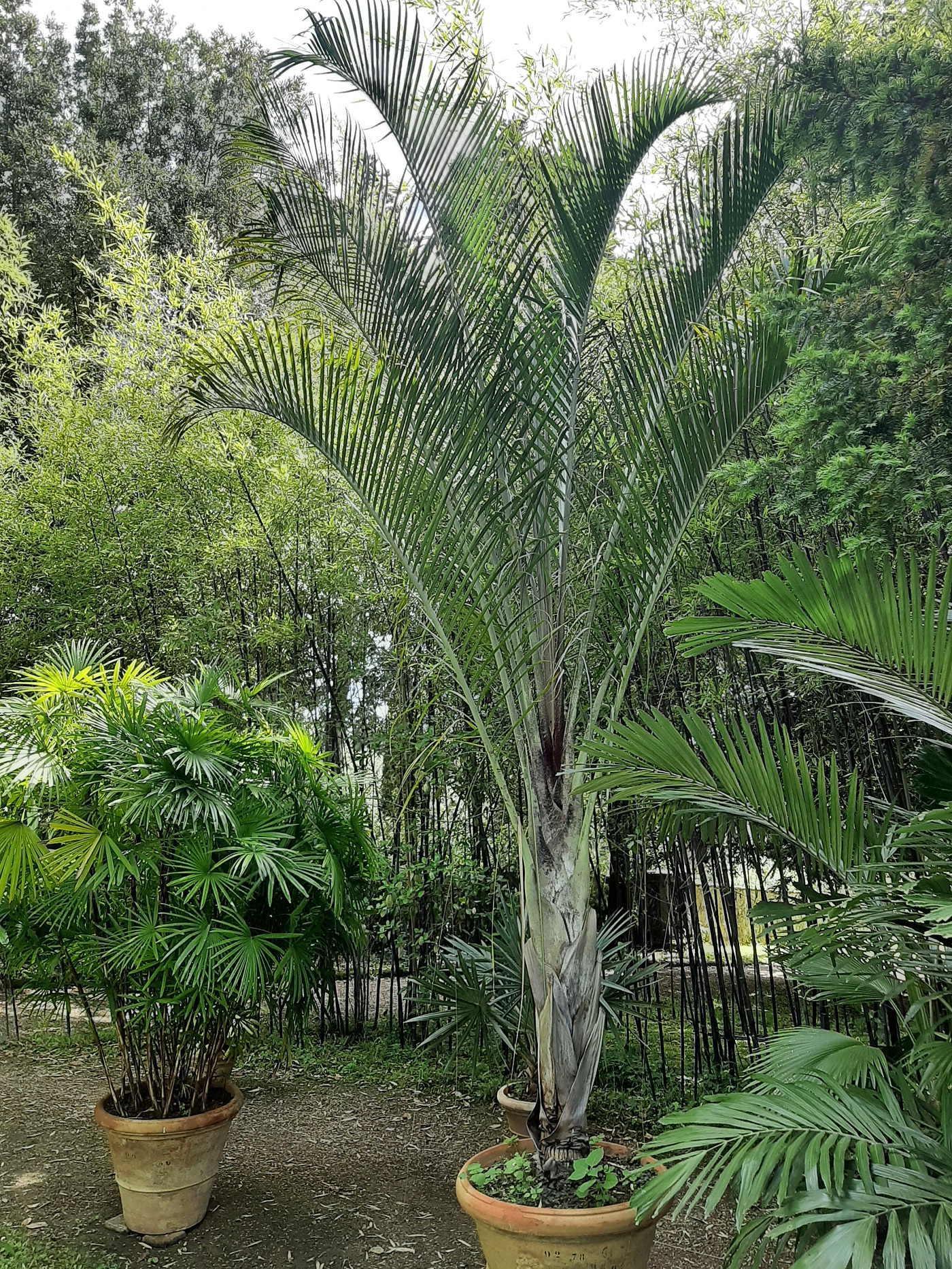 Commonly known as the triangle palm, it is indigenous to the Madagascan rainforest. Some specimens grow to about 15 metres tall in the wild, however, outside its native habitat it rarely reaches this size. Its leaves are about 2.5 metres long, growing almost vertically along the trunk, which measures about 25-35 cm. The stem is grey when mature and has widespread reddish pubescence (hairs) on its petioles and the bases of its leaf blades. It produces flowers gathered in inflorescences sprouting from the crown and an oval or subglobose fruit with a fibrous endocarp. It prefers full sun, though adapts to partial shade, and requires a substrate with excellent drainage as it cannot tolerate water stagnation or too high a relative humidity. It cannot withstand temperatures below -2°C. It is rare both in its natural environment and in cultivation.