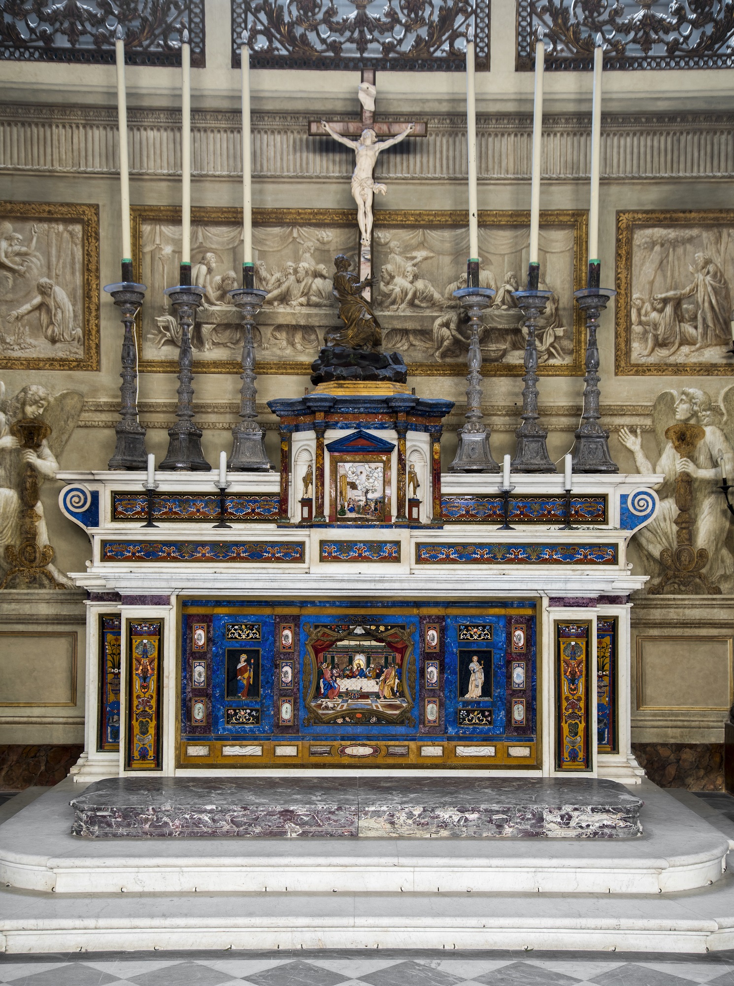 Pacini designed a structure of linear simplicity for the altar of the Palatine Chapel to give prominence to the precious panels in semi-precious stones, among which the pilasters decorated with grotesques on a yellow jasper background and the antependium stand out. The latter, covered in lapis lazuli, has a central panel with the Last Supper in semi-precious stone inlays executed in 1604-1606, based on a drawing by the painter Ludovico Cardi, known as Cigoli. Two other seventeenth-century panels depict Charity and Faith, made with semi-precious stone inlays executed in relief. The same sophisticated technique distinguishes the Adoration of the Magi mounted as the door of the tabernacle, whose appearance resembles a small temple surmounted by a tympanum of lapis lazuli and red jasper from Cyprus. The small structure is characterised by two niches at the sides, inside which are placed the statues of Saints Athanasius and John Chrysostom, carved in semi-precious stones in the round and originally part of two reliquaries made for Cosimo III de’ Medici. To the same Grand Duchy also belonged the ivory and gilded bronze group of the crucified Christ with Mary Magdalene placed at the top of the altar, donated in 1693 by Cardinal Flavio Chigi.