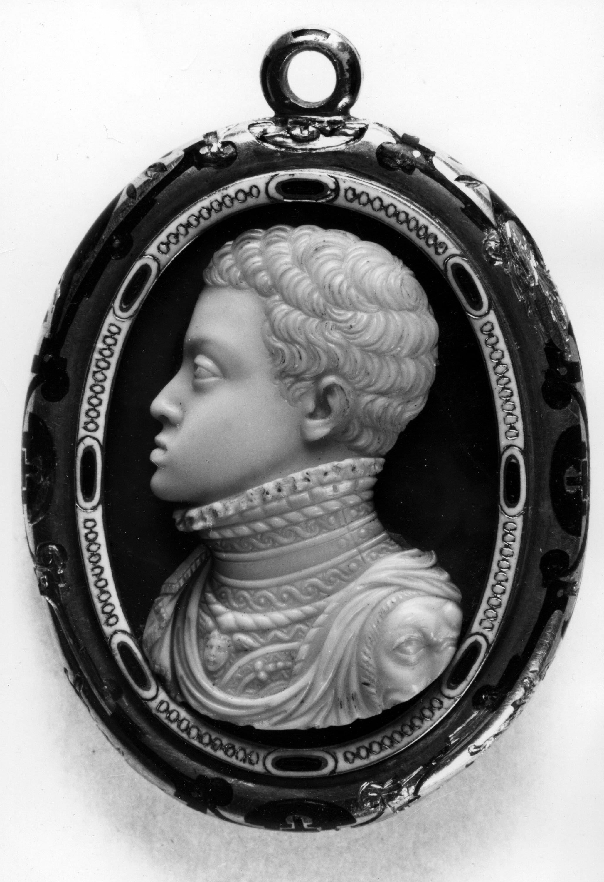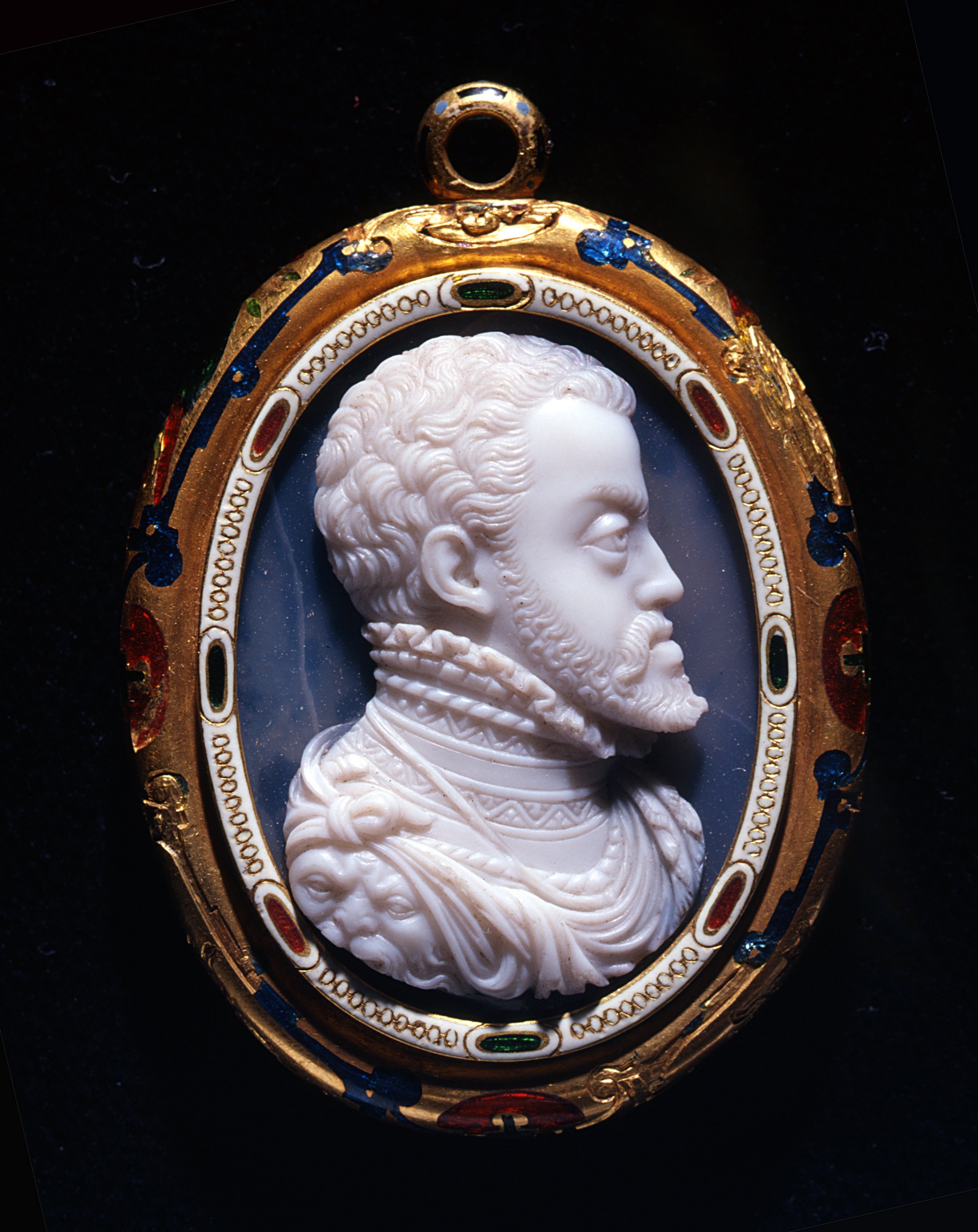 Until the final decade of the 18th century, critics associated the work with the famous sculptor, medalist and engraver of pietre dure, Jacopo Nizzola da Trezzo, in the service of the Spanish court from 1559. The portrait of Philip II is very similar to the style of the artist and a medal depicting the sovereign in particular, made by Nizzola in 1555. However, the onyx profile of the beardless Don Carlos, the unfortunate oldest child of Philip II shows a notable similarity to the medal of Pompeo Leoni, son of the more famous sculptor, Leone Leoni. The two cameos date back to between 1555, the year in which the medal of Philip II was coined, and 1562, the year in which the Duchess Eleanor purchased the pendant.