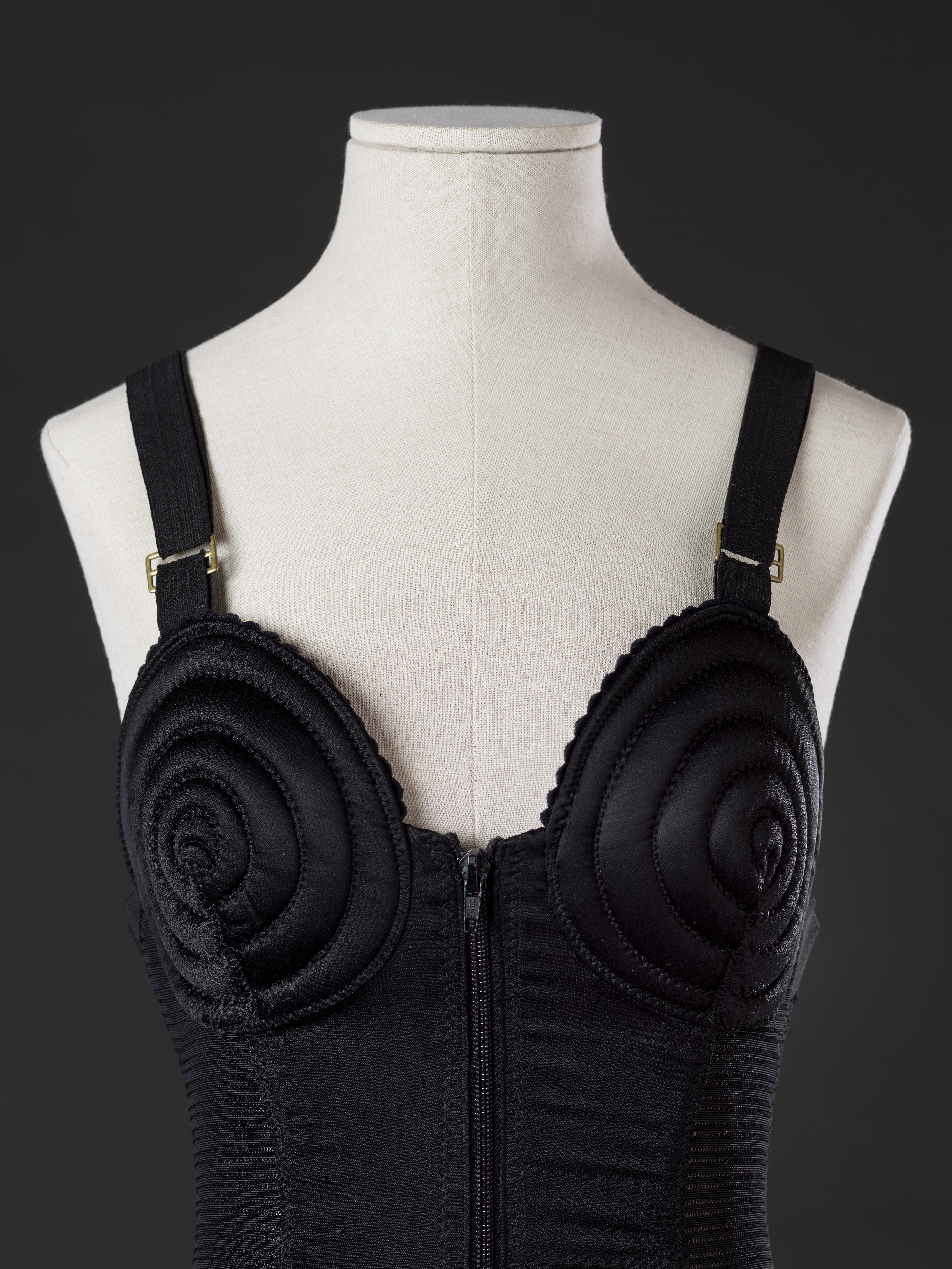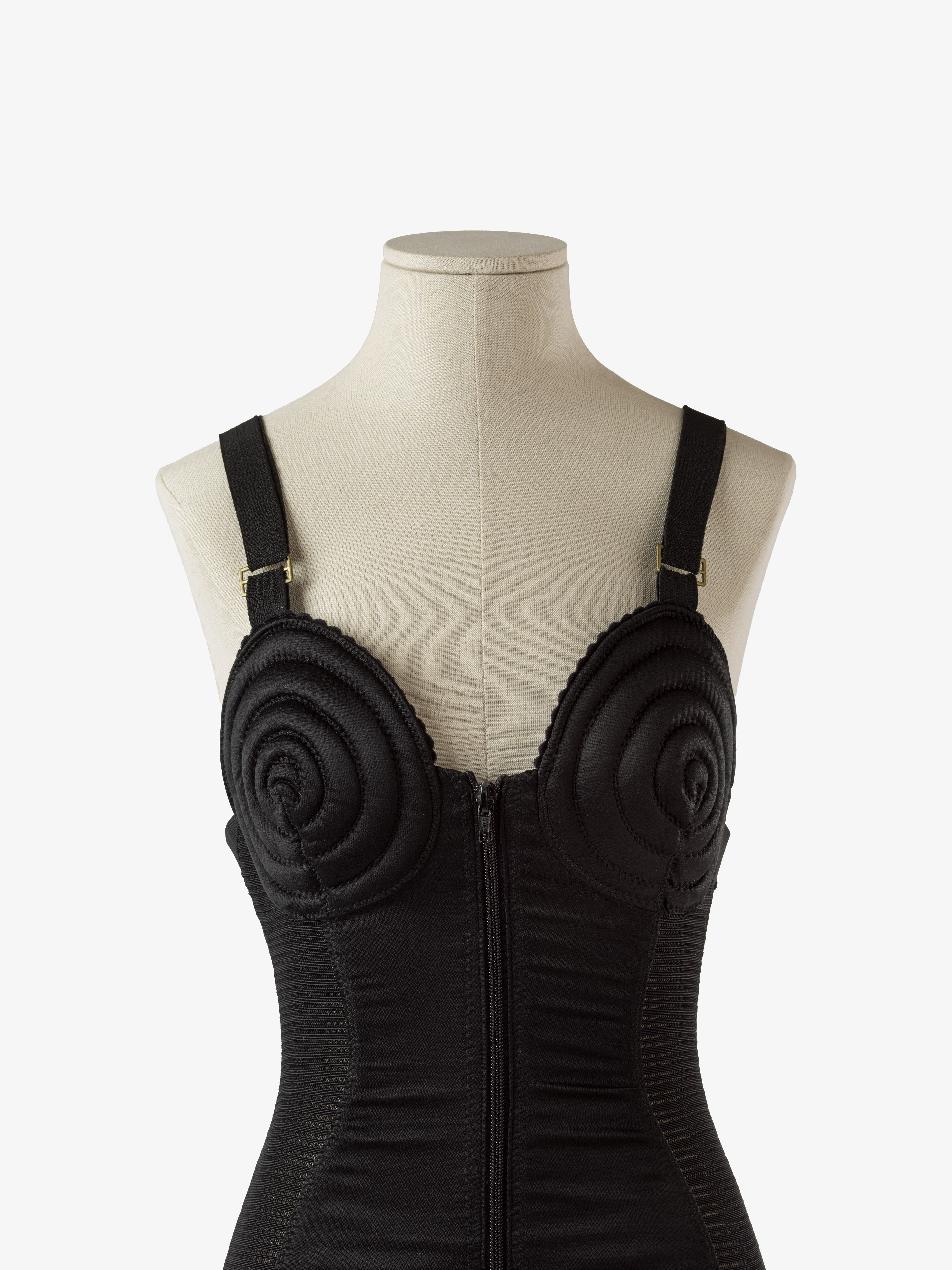 Elasticised black satin sheath petticoat dress. Donated by the Centro per la Moda Italiana, 2003
