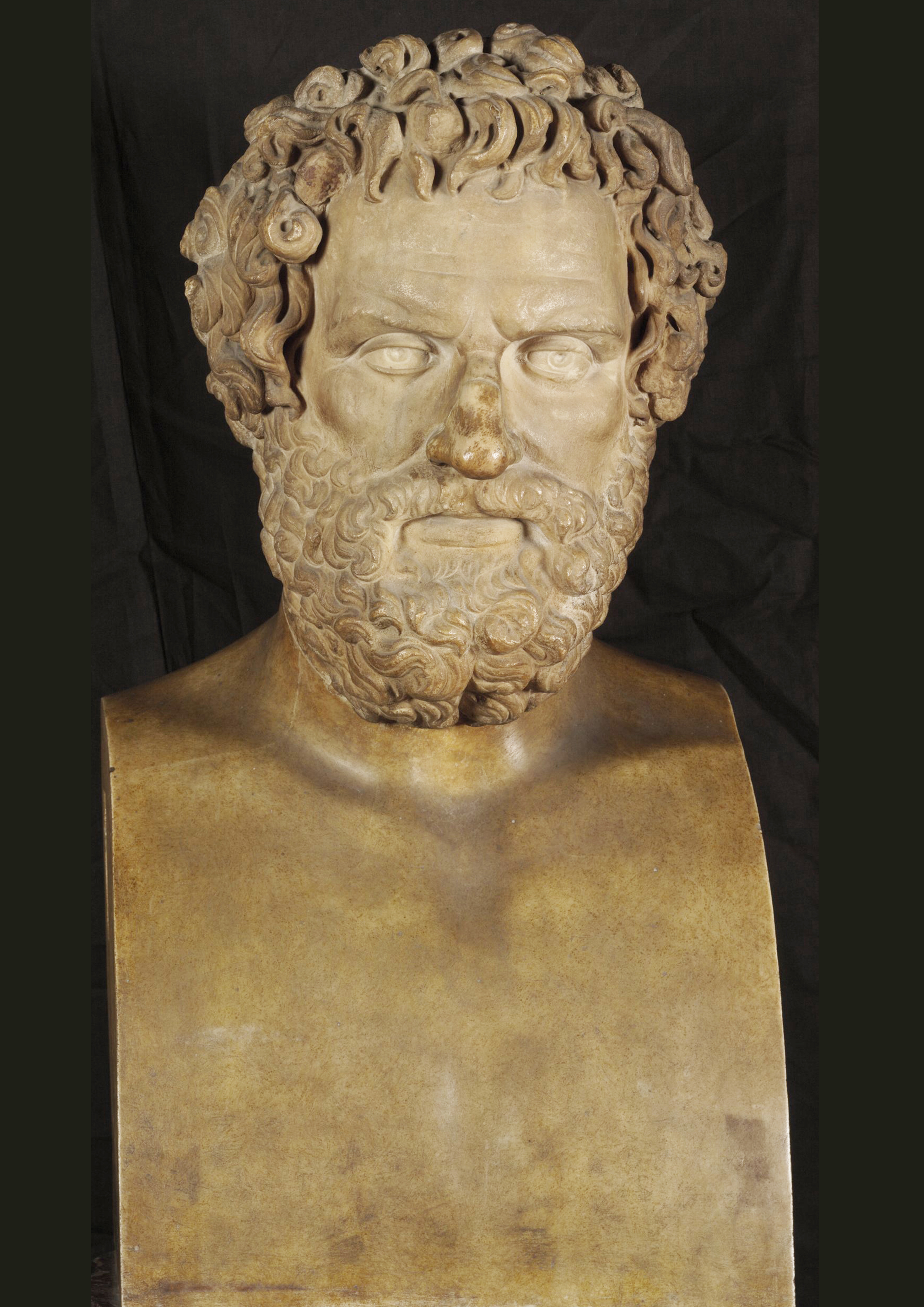 This head, which is original down to the neck, is mounted on a modern herma bearing the inscription SOPHOCLES on its right side. Apart from the herma, only the nose is the result of an integration.