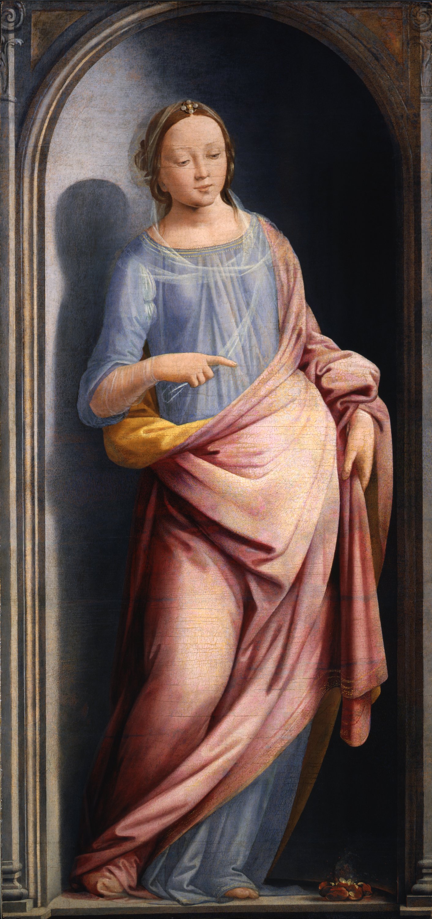 Baccio della Porta portrays her isolated as a painted statue, in a grey stone niche bordered by pilasters with plant ornaments. The light movement of the left leg evokes a charming sway, balanced by the gesture of her hand raised to show the pile of burning embers. Portia wears no ornaments, except for the pearl hair clip pinned to the top of her head to hold the transparent veil that covers her shoulders and is draped delicately along her bust. Her gentle expression and lowered gaze in a recollected and meditative attitude make her a kind of lay virgin who would originally have been accompanied by other female figures in a larger cycle dedicated to the virtues, of which only another panel depicting Minerva survives, now in the Louvre (RF 1945 9). Baccio created these paintings a few years before taking his vows and dedicating himself exclusively to sacred subjects. The painting is therefore an important testimony when it comes to understanding the beginnings of the painter, who at that time still fully belonged the late fifteenth century tradition and was faithful to the ways of his first masters, from Ghirlandaio to Piero di Cosimo, from Lorenzo di Credi to the Flemish painters whose works were present in Florence (such as Roger van der Weyden, Hugo van del Goes, Hans Memling, Petrus Christus), from whom he had acquired the sensitivity for a lucid and clear painting that chisels colour and defines a perspective field.