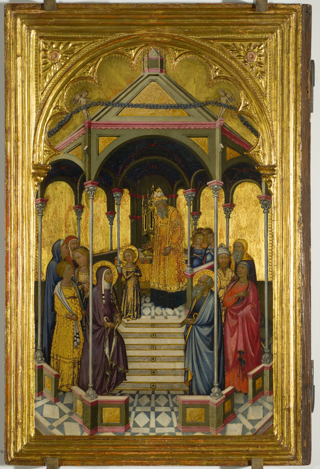 One time the painting was part of a more complex cycle dedicated to episodes from the life of the Virgin, and there are two other elements, now in the National Gallery in London and the Metropolitan Museum in New York. We do not know how the panels were originally set out, but considering the easily handled dimensions and the general precision of the decoration, we can suppose that they were conceived in the style of doors, to be visible on both sides. No one knows the period in which the paintings were divided and nor is it known where they were first hung, although the critics would seem to opt for a Sienese context, taking into account that Buonaccorso was only recorded in the city of his birth and that Mary was considered an extraordinarily fortunate subject in Siena. Before arriving at the Uffizi, the Presentation of the Virgin was in the Hospital of Santa Maria Nuova in Florence in the latter part of the 19th century.