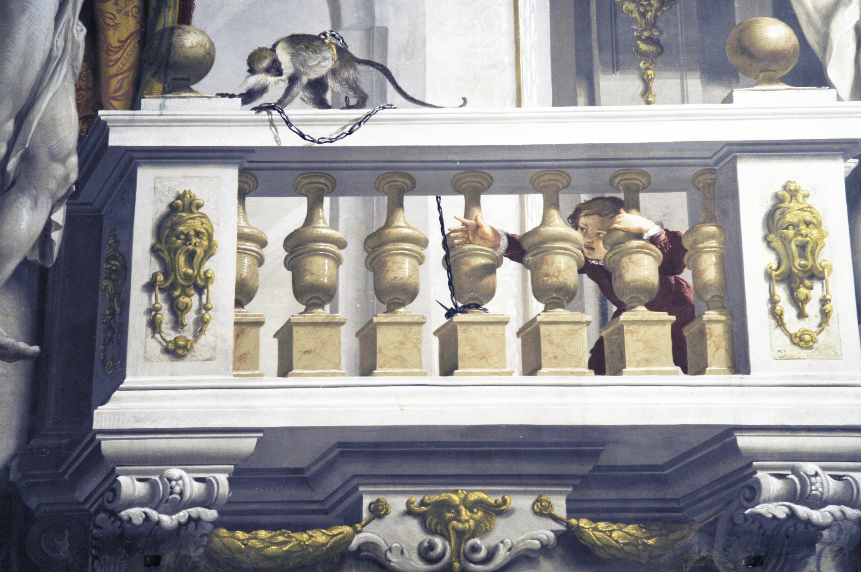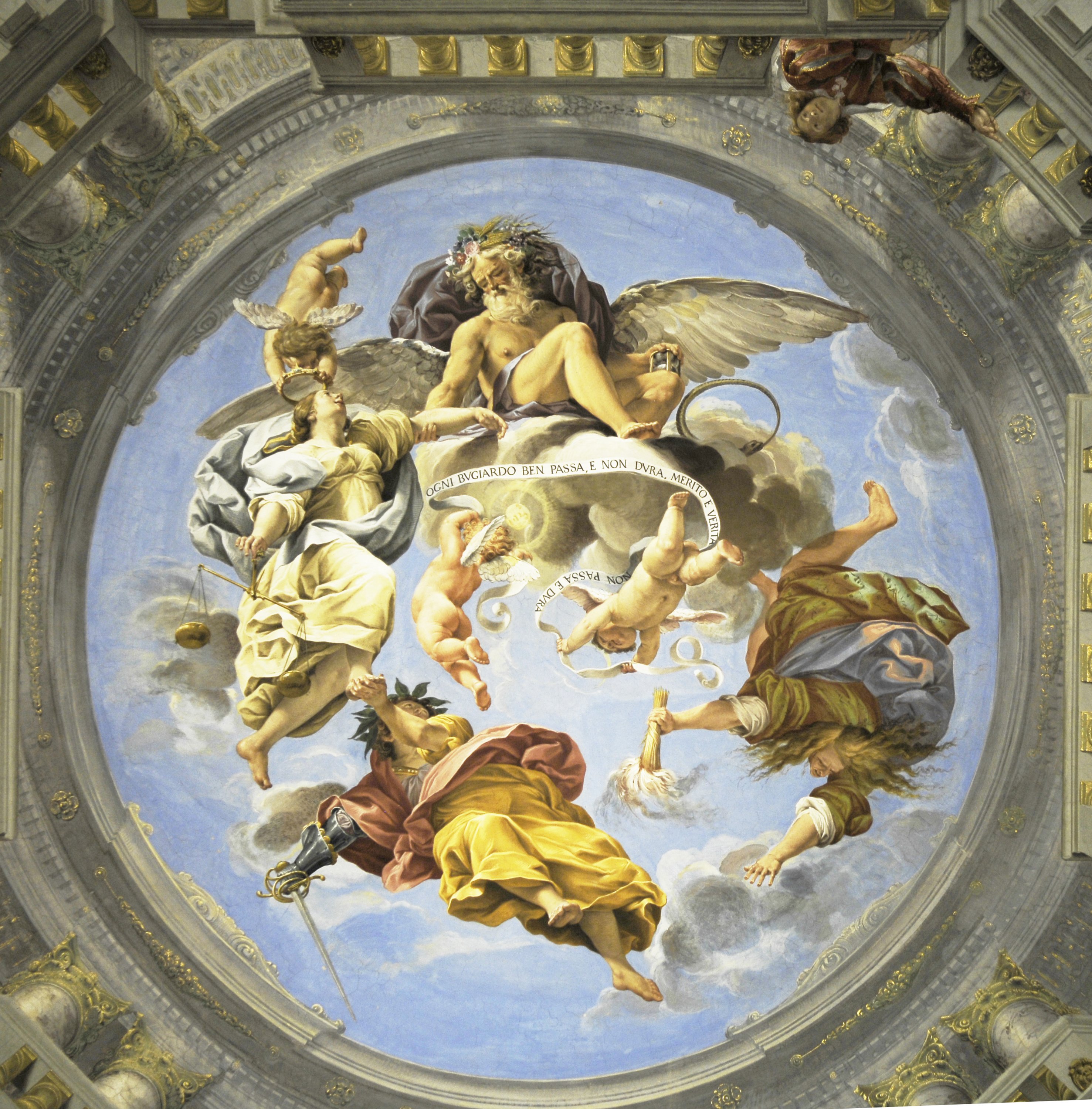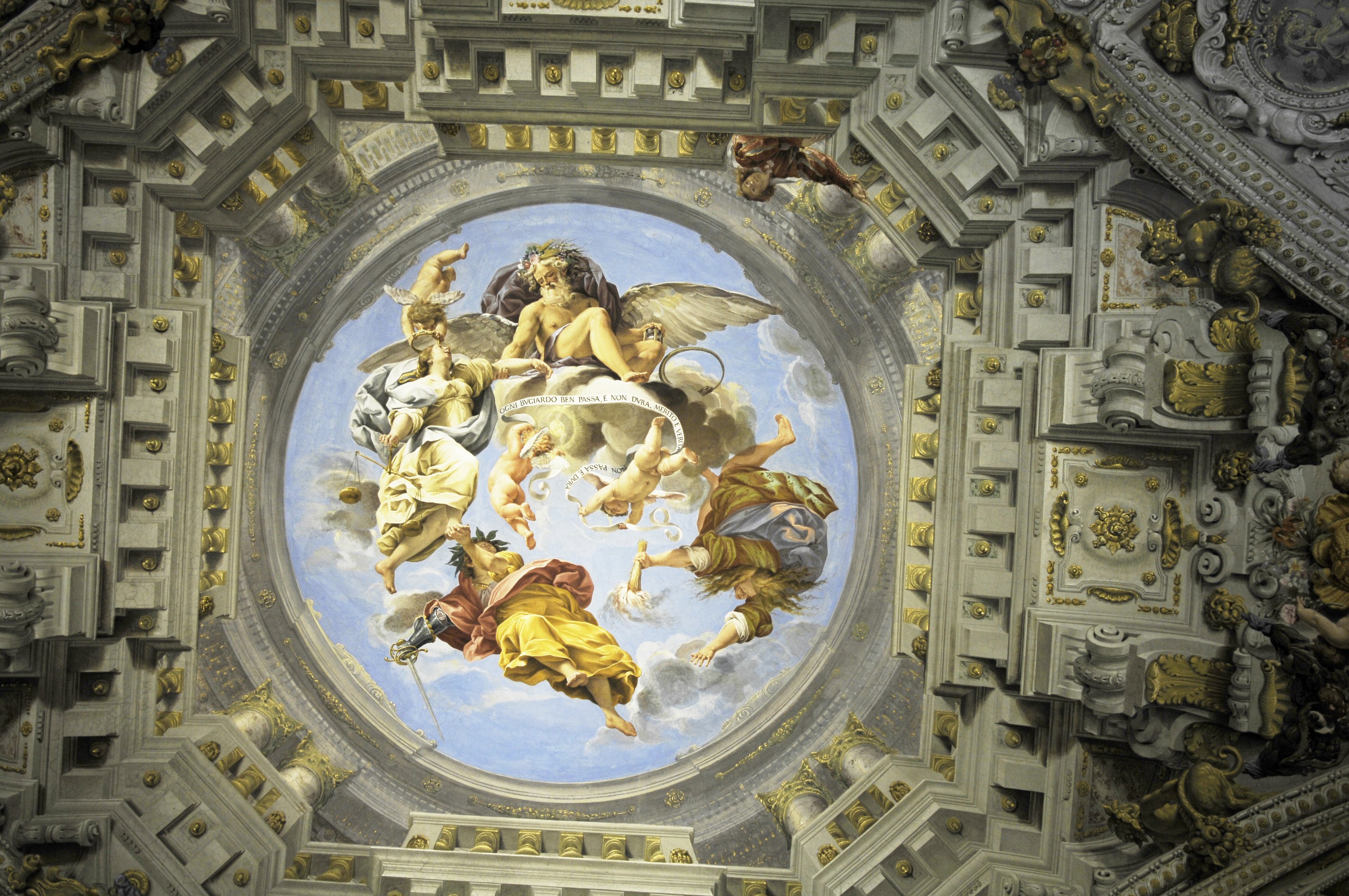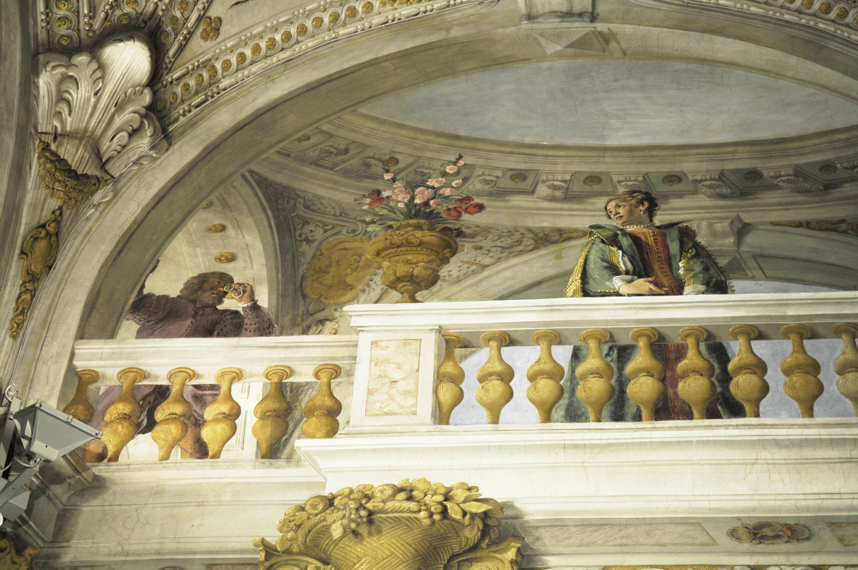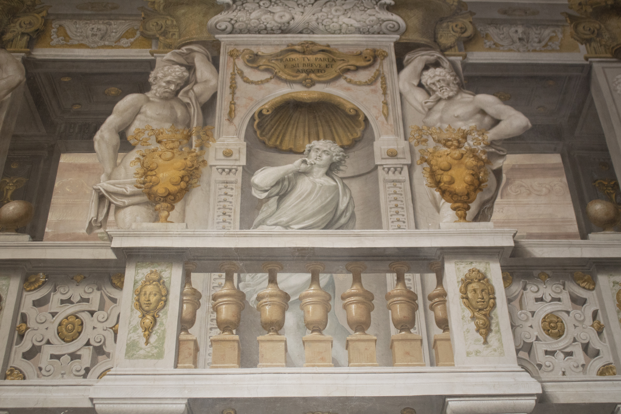 The first of the three reception rooms in the Grand Dukes summer apartment strikes for its impressive painted scenery exposed on the walls. Two masters of Bolognese perspective painting, Angelo Michele Colonna and Agostino Mitelli, were called in to create it. Ferdinando II de' Medici wanted them at his service to show off a space that could amaze all those visitors who were about to be received in audience. The hall gives the illusion of enlargement thanks to fake architectures breaking through the walls: staircases, balustrades, boxes and balconies welcome the various characters of court life, as ladies, children and chamberlains appear to be conversing - like in an imaginary theatre - with the bystanders being received. The inscription “Radu tu parla e sii breve et arguto” (Rarely speak and be brief and witty) alludes precisely to the purpose of the room. If the decorative perspective layout, with gigantic telamon and canephore figures supporting the wide balustrade, recalls the decoration of the Sala Grande of Palazzo Spada in Rome, the painted figures seem to be inspired by those of Veronese inside the Villa di Maser (Treviso). The allegory with the Triumph of Time stands at the centre of the vault, initially entrusted to Francesco Albani, and later commissioned to Colonna. Reality and fiction are the themes of this evocative space, animated by backlighting effects and luminous contrasts. The identification of Mitelli's or Colonna's contribution has been much debated: critics generally tend to attribute the conception of the perspectives to the former and to the latter much of their realization in fresco.