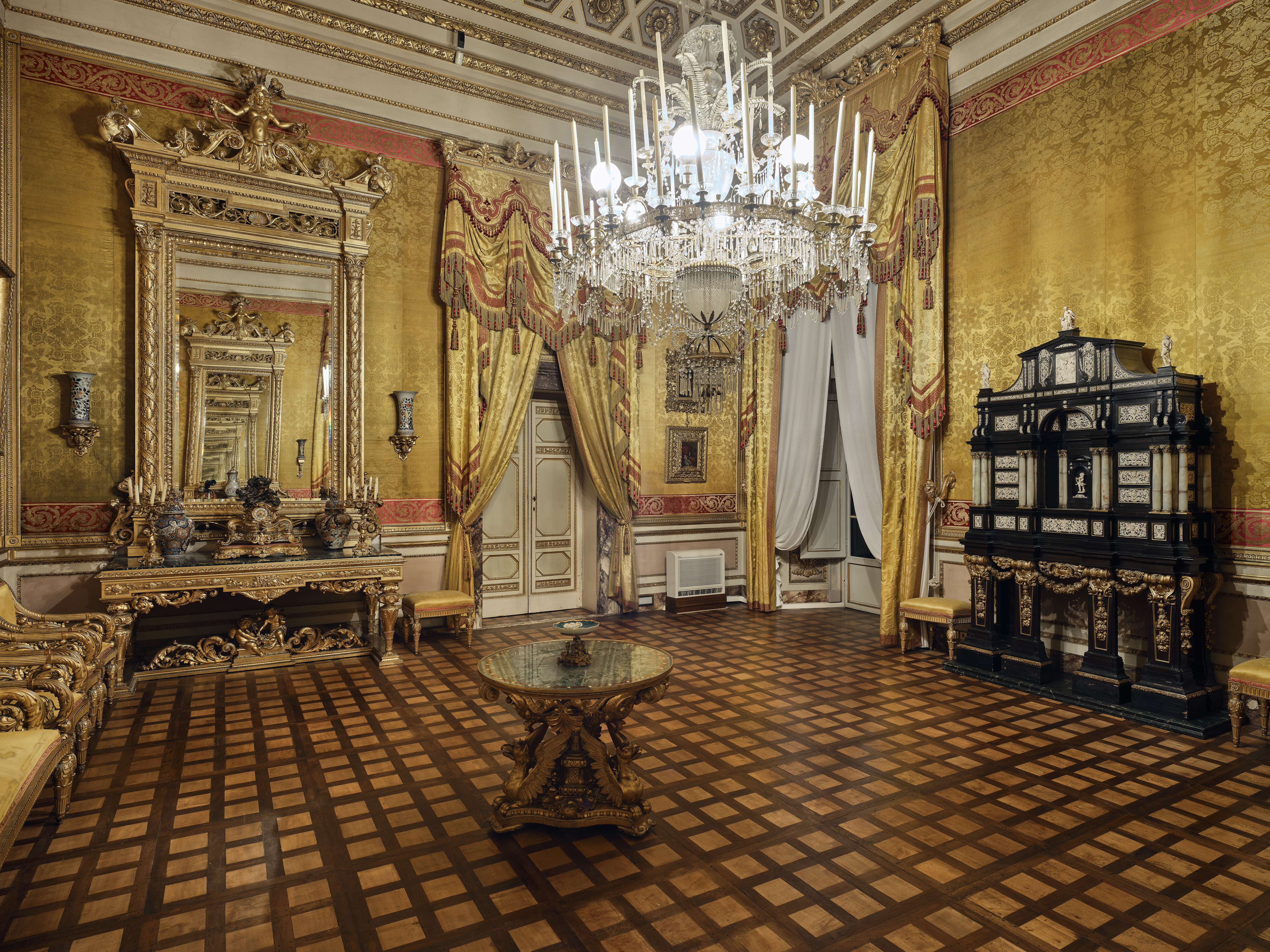 Lastly, among the objects, the enormous candelabrum dating back to the middle of the same century stands out. Originally placed in the Throne Room, it was evidently appreciated for the exotic taste of the oriental porcelain mounted in bronze with neo-baroque pomp.