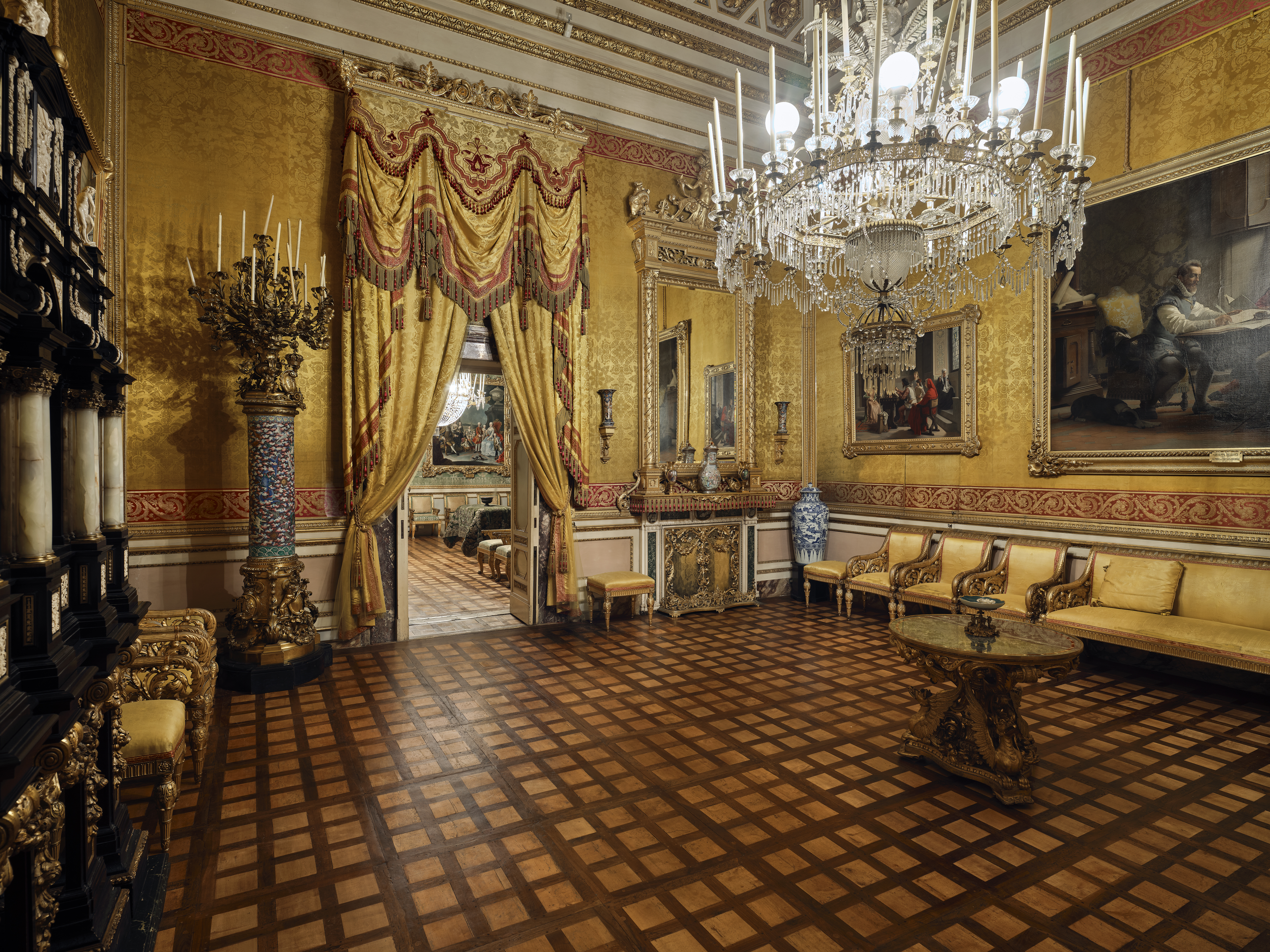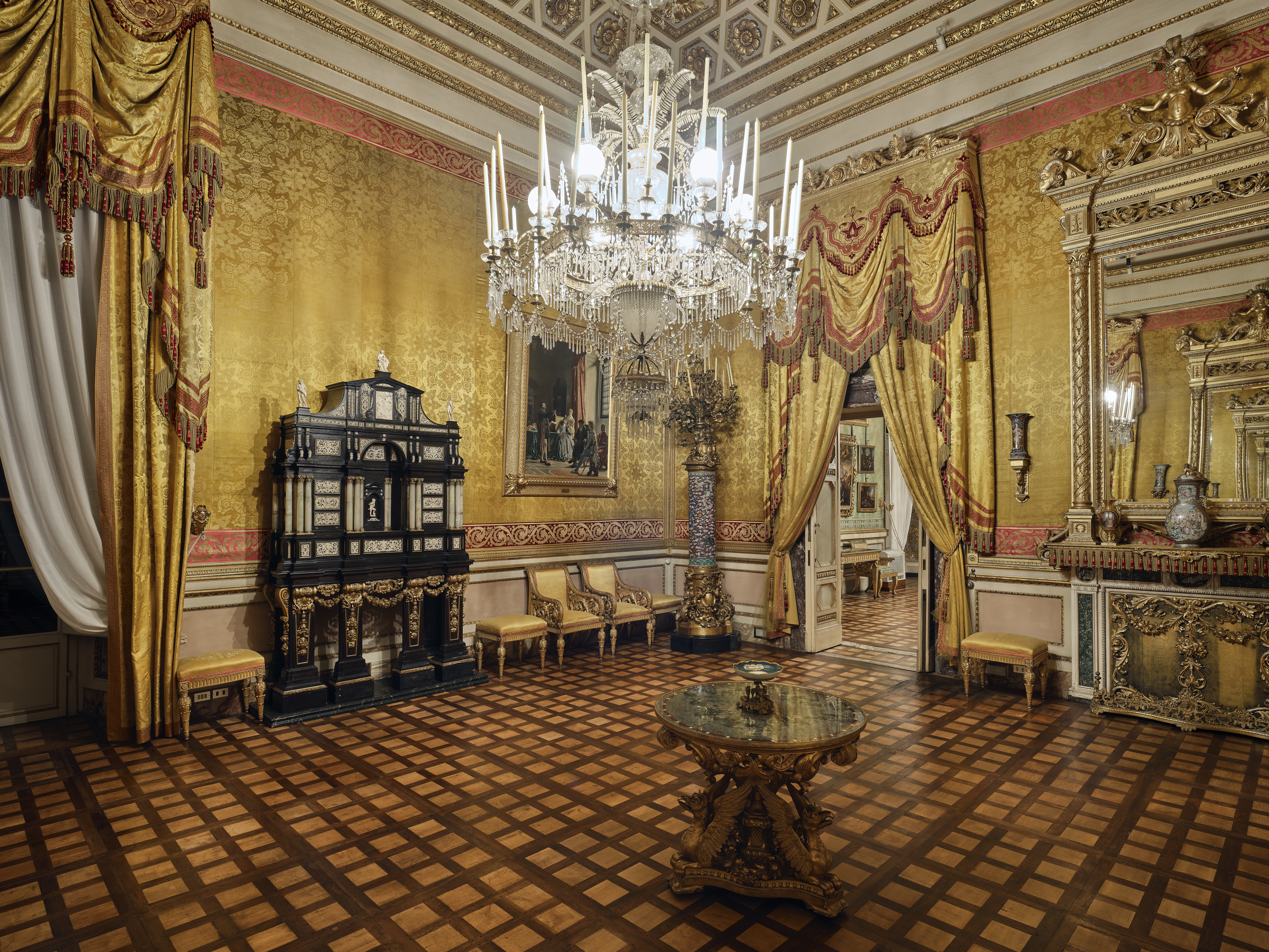 This is the first room in the Queen's apartments, also known as the Yellow Salon because of the colour of the wallpaper, which was originally white but was dyed yellow and adapted to the room in 1844. The silk was probably part of the group of tapestries that arrived at the palace with the return of Ferdinand III in 1814, at the time of the Restoration, and therefore dates to around 1810. The large carpet with the decorative motif of the sixteen imperial cohorts with the cross of the Legion of Honour at its centre, instituted in 1802 by Napoleon, dates to around the same period. This motif was taken from a carpet that the Emperor had made for the Grand Cabinet of the Château de Saint-Cloud.