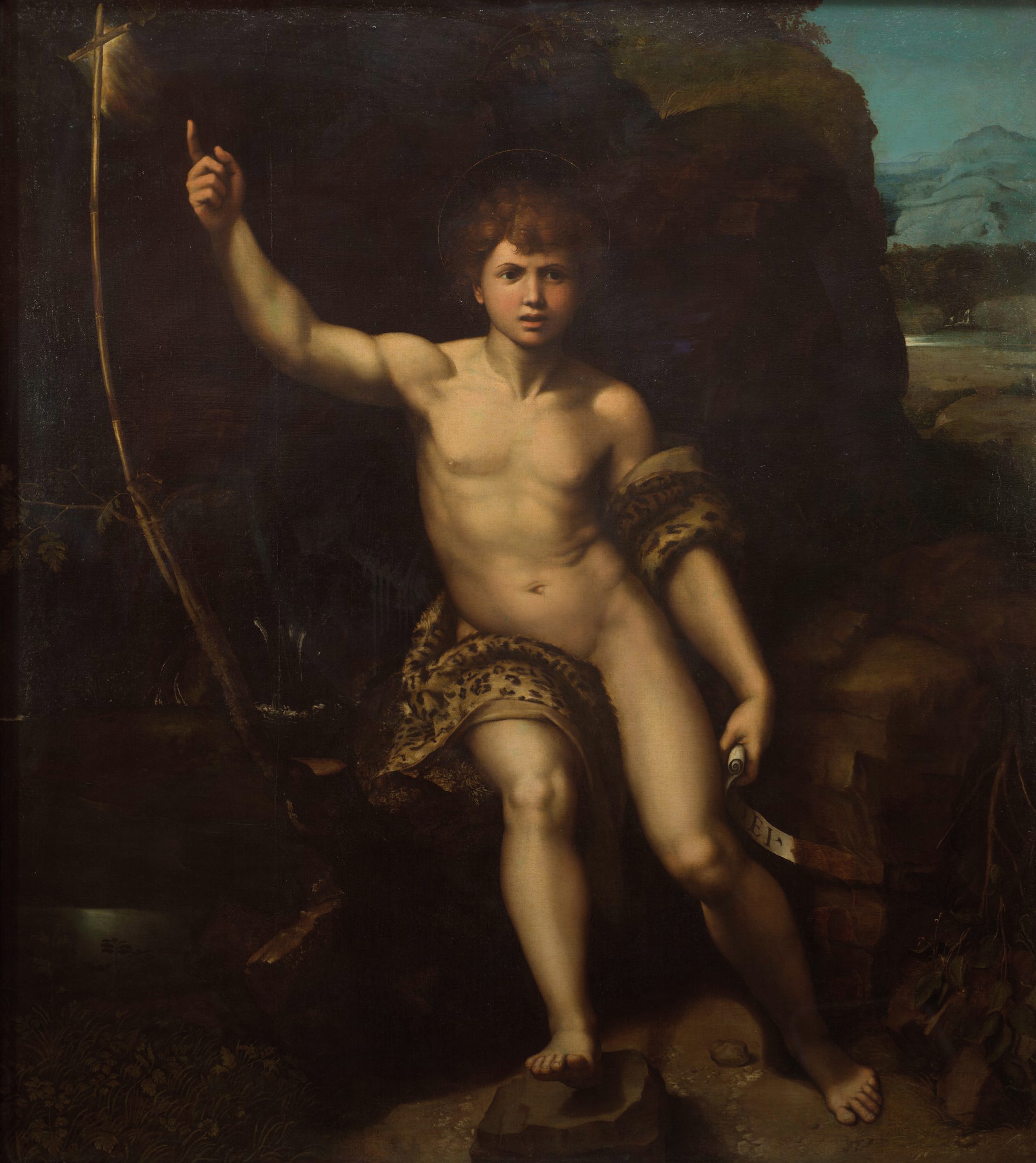 The painting's warm colours highlight the boy’s agile and muscular body, with his pale skin contrasting with the dark rock in a way which echoes an earlier work by Leonardo da Vinci. It is precisely the latter's John the Baptist (now in the Louvre in Paris), which he painted in Florence at the end of the last decade of the 16th century, which inspired Raphael and especially the emotional power of the gesture in the direction of the cross. The nude pose, with the slight juxtaposition of the left leg slightly forward and the foot resting on the stone, reflects Raphael's study of the great ancient world models from Laocoön and the Ciampolini Zeus.