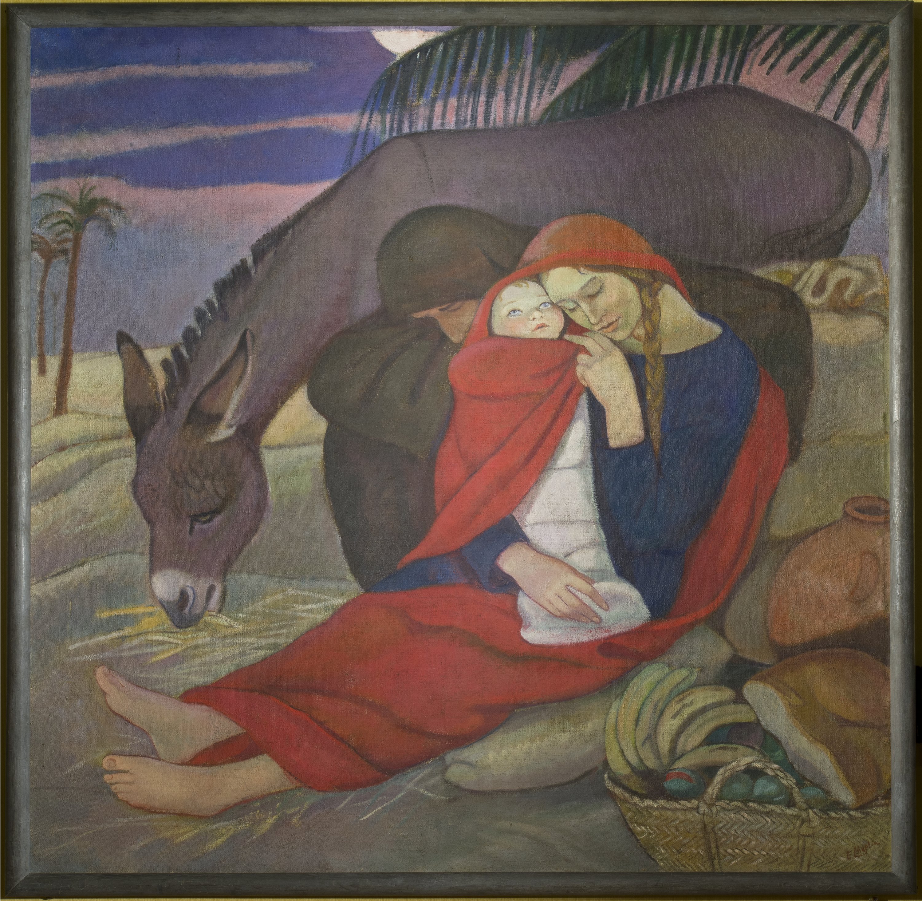 French by birth and naturalized Florentine, Elisabeth Chaplin grew in a prolific cultural milieu: her grandfather and uncle were painters and her mother a poetess and sculptor, as well as a friend of Maurice Denis and the symbolist painters. From the 1920s, Chaplin began to combine hints of paganism and late-mediaeval references with formal synthetism and symbolist tones to arrive at a personal interpretation of religious themes with respect to iconographic tradition. This painting, an example of this current, was presented at the Salon d’Automne in 1924 with the unconventional title of “Oasis”. The figures of the Holy Family, as if wrapped in an embrace, huddle together in the peaceful intimacy of a moment of rest. The elements taken from the symbolist vocabulary are the artist’s use of color, applied in large, vividly even expanses, and the shape of the composition, set out within a harmonious twisting movement that, from the outside, converges onto the focus of the image, where the heads of Mary and the Child are gently touching. As well as the title, other details contribute to the unconventional interpretation of the subject (to the extent that the work was contested on account of the irreverence shown by the artist): the desert palms that stand out against the pink desert sunset and the still life created with the basket of bananas and figs in close up.