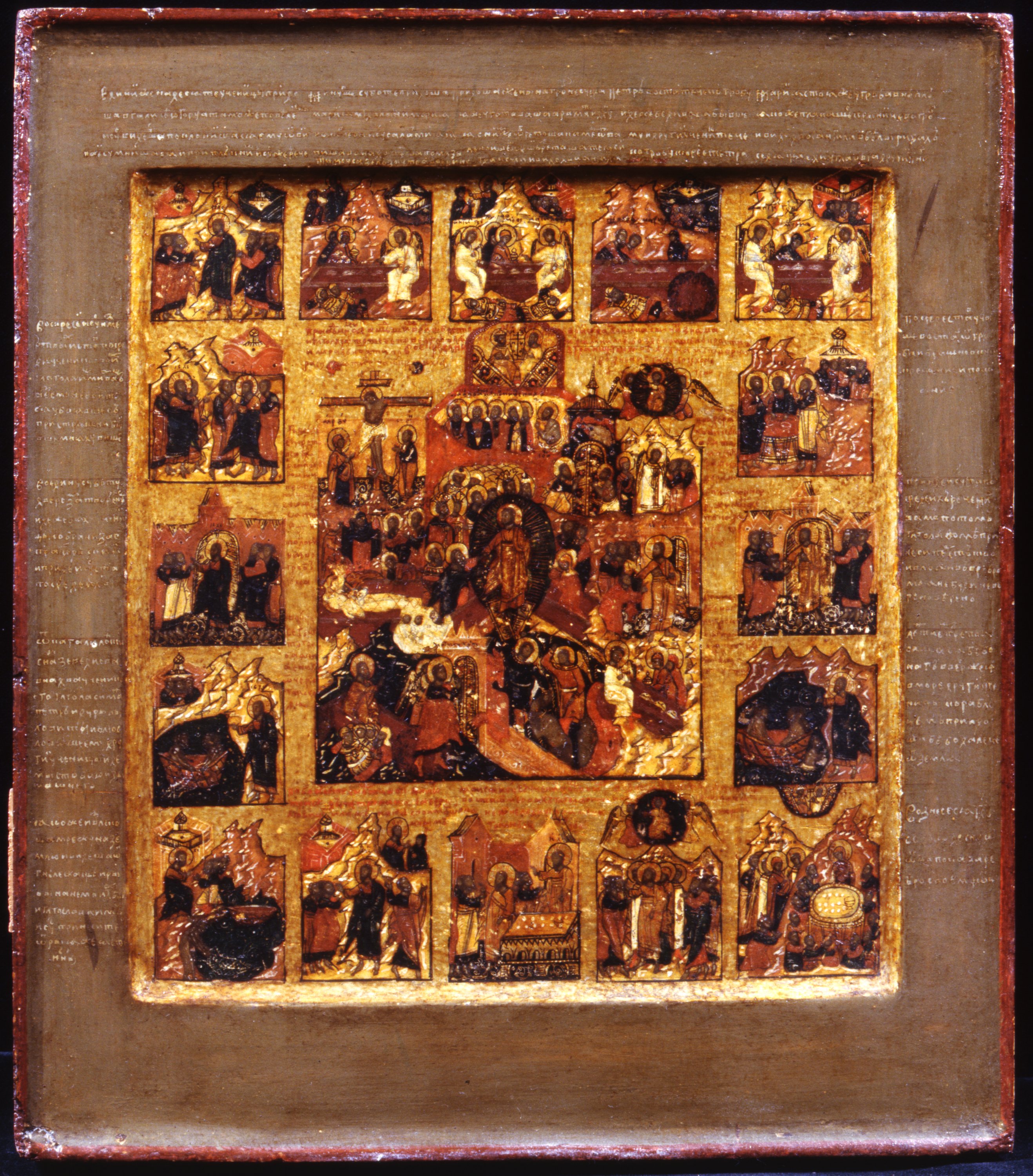 The fulcrum of the icon is the image, in the middle of the central panel, of the risen Christ descending to the underworld to free Adam, Eve and the Righteous, according to the narration of an apocryphal text, the Gospel of Nicodemus. The scene includes numerous other episodes illustrating the story of Christ, from the Crucifixion to the representation of the Redeemer enthroned with God the Father and the Holy Spirit. In the sixteen panels arranged around the perimeter of the icon, sixteen post-mortem stories of Christ are illustrated. They are depicted, in horizontal registers from left to right, starting at the top: Appearance of Christ to the disciples in Galilee; Appearance of angels to the pious women (subject repeated twice); Peter, John and Mary Magdalene at the Lord's tomb; Appearance of two angels to Mary Magdalene; Appearance of Christ to the apostles; Sharing of bread with the disciples; Appearance of Christ to the apostles; Thomas’ Disbelief; Appearance of Christ to the apostles at the Sea of Galilee (subject repeated three times); Proclamation of St. Peter's mission (subject repeated twice); Ascension of the Lord; Return of the Mother of God and the apostles from the Mount of Olives. For these scenes the sources of inspiration are the canonical Gospels and the Acts of the Apostles, although the selection and sequence depends on the interpretation offered by various liturgical texts. When the same episode is narrated by several evangelists, the subject is repeated in the icon.