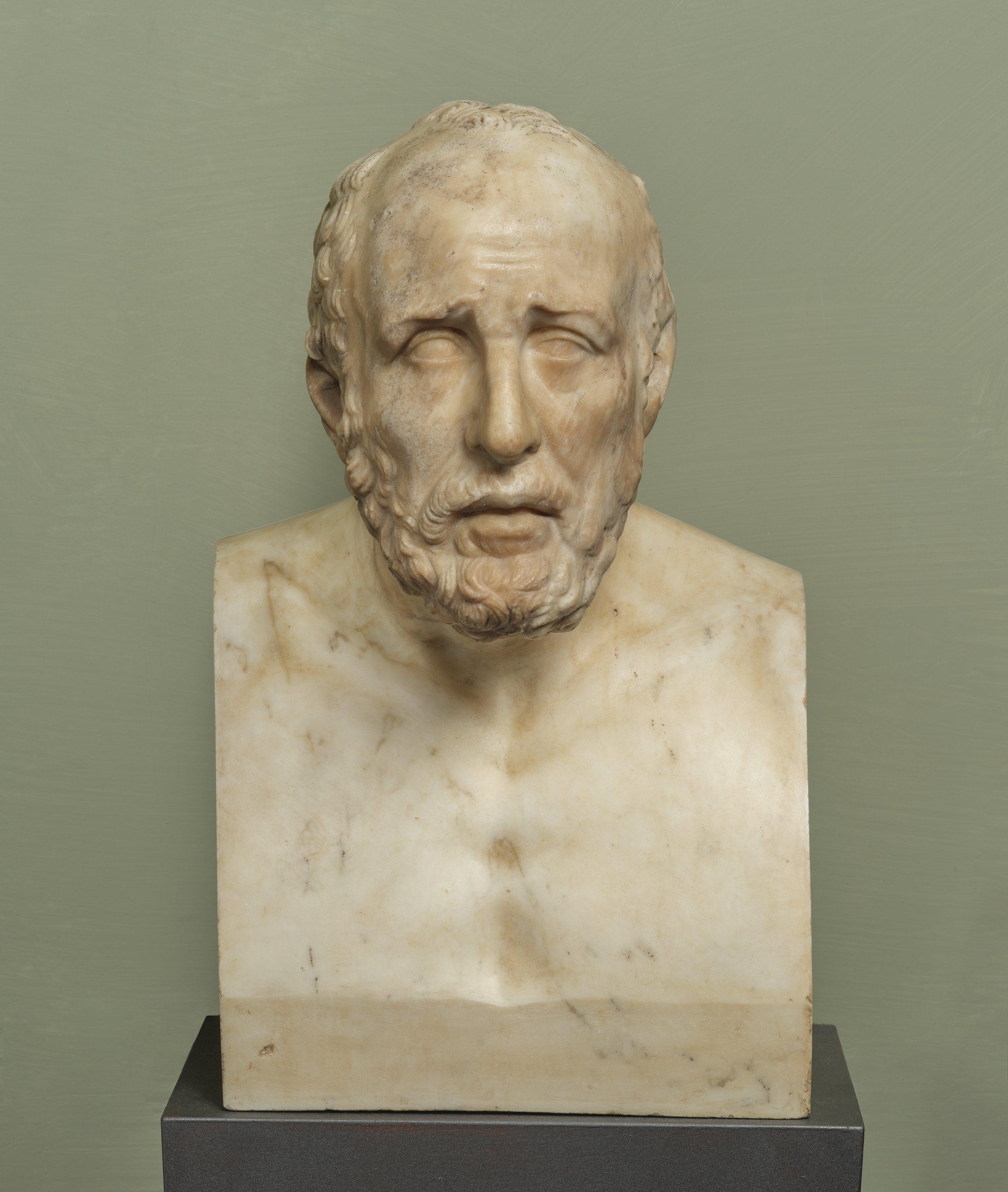 This sculpture first appeared in the Gallery's inventories in 1704 (inv. 1704 no. 27), being displayed in the Hall before the Corridor. After being moved to the East corridor and identified with Diogenes (inv. 1769, no. 180), in 1825 it was displayed in the Hall of Ancient Inscriptions, identifying the protagonist with the early Hellenistic poet Aratus (inv. 1825, no. 200). Mansuelli is credited for associating the portrait with the head of the philosopher from the 3rd century B.C., Chrysippus. The portrait was remodelled several times: the upper part of the hair and the beard are very flattened, probably because they were adapted to the reworking of the face; similarly, the forehead is short, the brow ridge is thinned and the right ear is smaller and more adherent to the head compared to the left one.