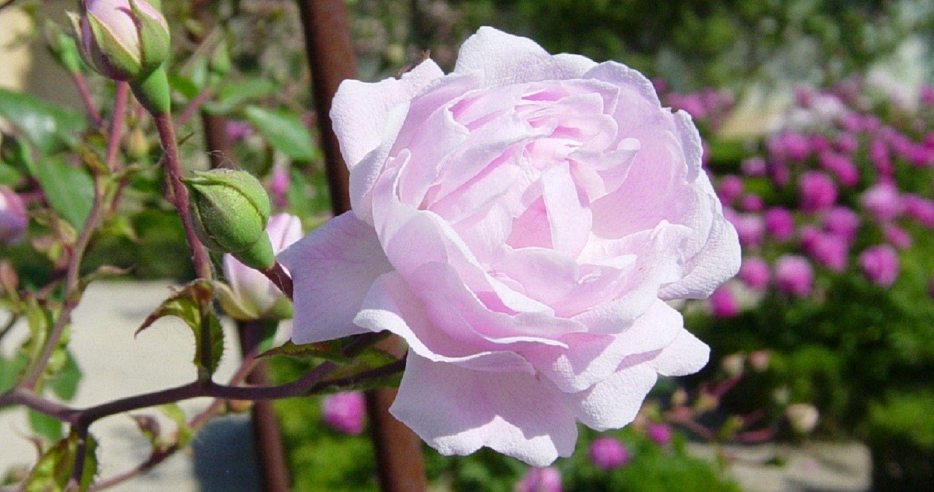 Climbing Rosa wichuraiana Rambler, suitable for covering archways and pillars. It is often positioned next to Blue Magenta for the splendid feast for eyes created by their bloom.