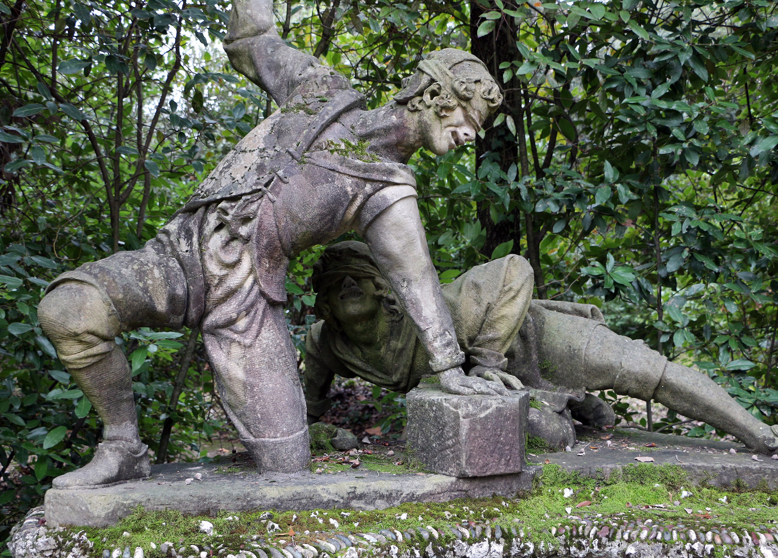 The sculpture vividly illustrates this ancient Florentine game, which represents the fight between two contenders, both blindfolded, one of whom had to hit the other with a knotted cloth - although the boy on the left has lost his - without detaching the hand from a set point usually consisting of a rock. The conception of the sculptural group belongs to Orazio Mochi, who, according to what Filippo Baldinucci reports, sketched the work in wax first, and then in full size, presumably around 1614-1615, obtaining a disappointing result, however. Baldinucci also recalls a bronze statuette by the same author, copies of which still exist, depicting two peasants caught in the moment of the Gioco del Saccomazzone which instead achieved great success, so much so that the sculptor created various versions in bronze, wax and plaster. Giulio Parigi, the architect who supervised the rearrangement of the Boboli Gardens, requested a life-size stone replica to adorn the Medici park. However, Mochi, remembered in the sources for his skill as a modeller, was not equally esteemed as a sculptor, which is why the execution of the assembly was entrusted to Romolo Ferrucci known as del Tadda. The presence of the Gioco del Saccomazzone, located at the end of the Viottolone in the space in front of the island, has been recorded since 1622 and acts as a counterpart to the sculptural group depicting the Gioco della Pentolaccia.