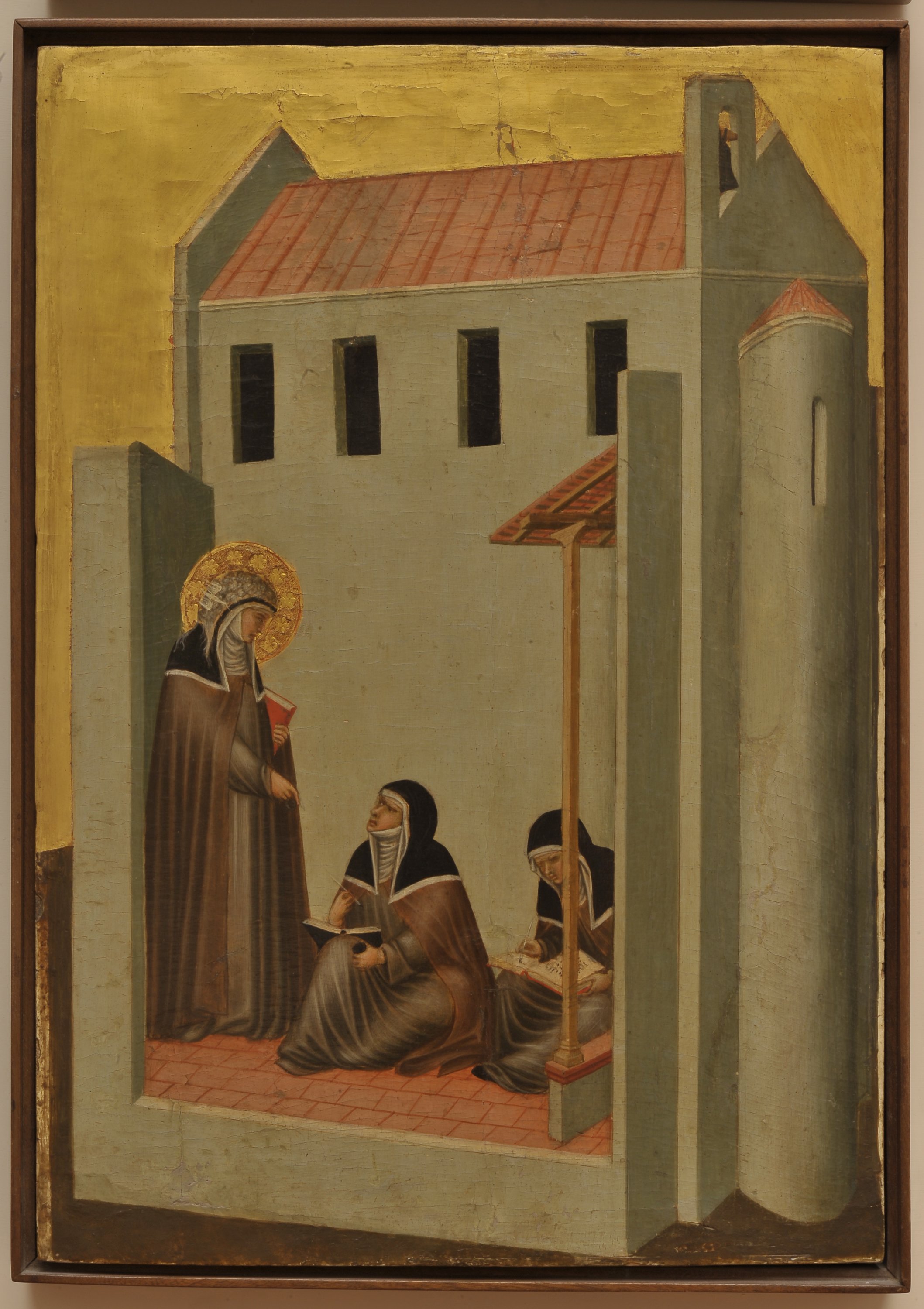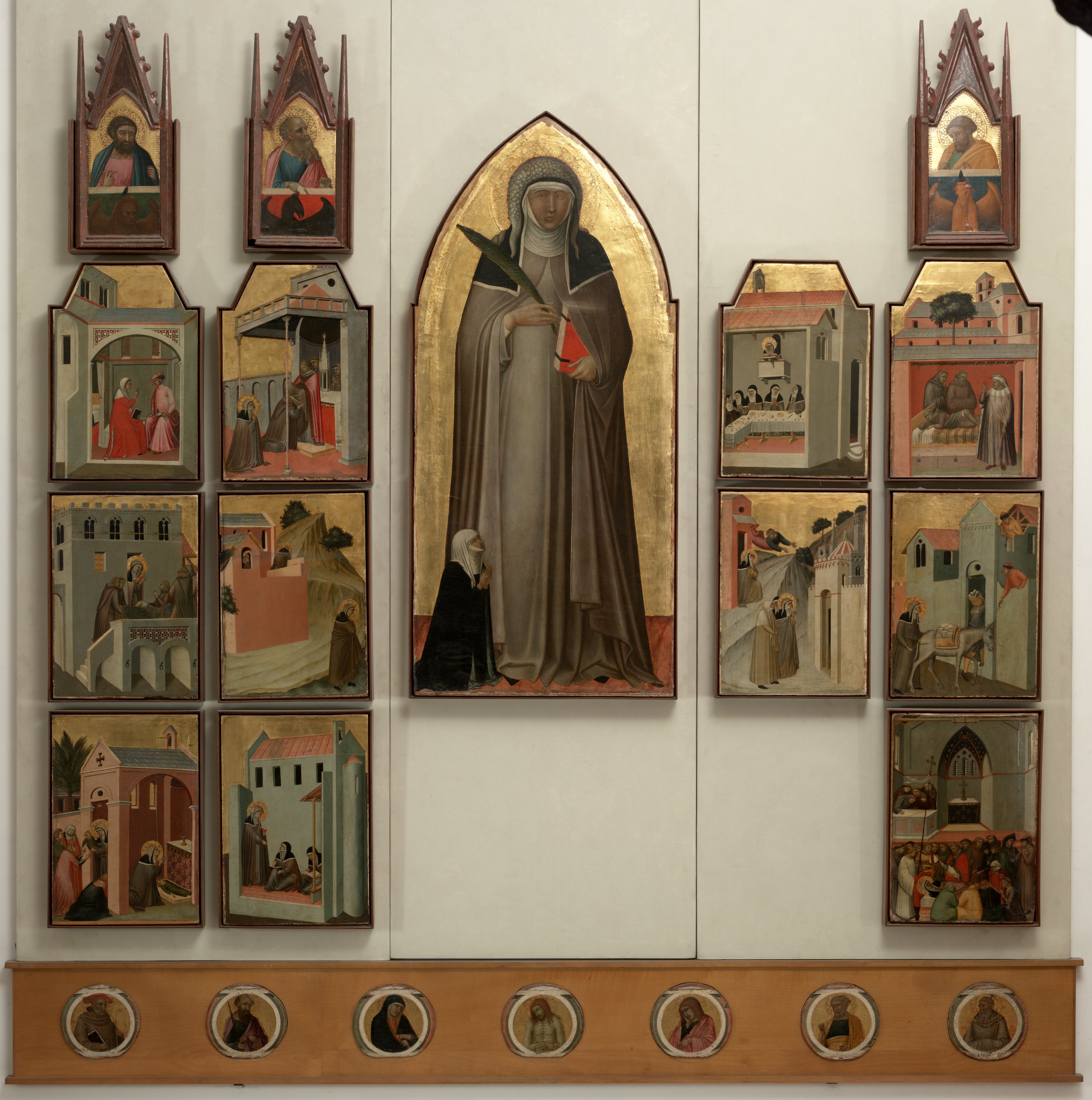 The altarpiece is a hagiographic icon, a style of reredos in use until the thirteenth century which featured an image showing a full-length portrait of a saint or the Virgin Mary surrounded by a frame illustrating the stories of the featured person. This polyptych by Sienese artist Pietro Lorenzetti illustrates the life of Saint Humility (1226-1310), a noblewoman from Faenza who became a nun late in life and traveled to Florence to found a Vallumbrosan monastery. The saint is pictured wearing the habit of her religious order, holding a book and a palm leaf, a symbol of glory; her head is covered with sheepskin, an emblem of humility and an iconographic characteristic typical of Saint Humility. At the bottom left a woman is knelt in prayer, most likely representing the customer who commissioned the work. The stories surrounding the central image recount Saint Humility's life, from the moment she chooses to don the religious habit before her conversion, to the miracles she worked in the convent in Faenza, to her journey to Florence where, in 1282, she founded the monastery of San Giovanni Evangelista just outside the city wall's, until her death and funeral service presided over by the priest. The lively narrative of the scenes, set in architectural environments and landscapes which abound with realistic details, is clear and informative, reiterating the educational purpose that images played in an era when literacy was a skill known only to the few. The altarpiece has been broken up into parts and is currently missing the frame, two pinnacles and two of the story panels, the latter of which are exhibited in Berlin (Staatliche Museen, Gemäldegalerie). The piece remained in the church of San Giovanni Evangelista until around 1529, when the nuns had to abandon the convent while Florence was under siege by imperial troops. After moving numerous times, the Women of Faenza, as they were known, reached the monastery of San Salvi, bringing with them the most treasured furnishings of their original home; these included this representation of Saint Humility painted by Pietro Lorenzetti.
