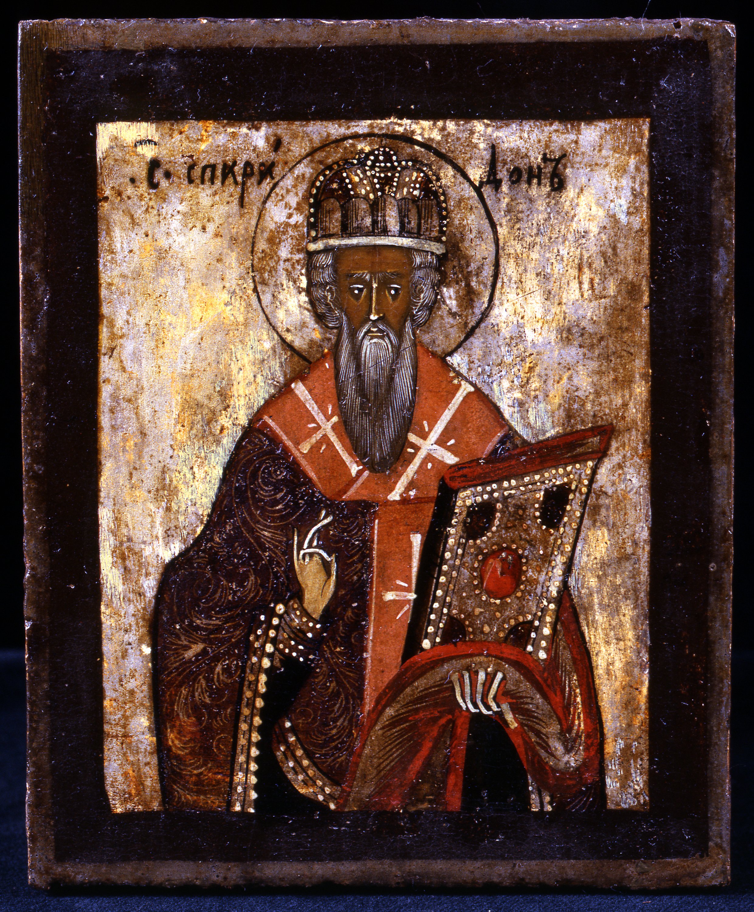 Spyridion, one of the most venerated bishop saints in the Orthodox Church, who lived between the third and fourth centuries, wears a dark robe topped by a precious phelonion, a mantle-shaped liturgical vestment typical of the Byzantine tradition. The bishop’s insignia are the omophorion, a long stole decorated here with large white crosses, and the mitre, placed on his head. Saint Spyridon, identified by the inscription on the sides of his nimbus (“С(ВЯТИТЕЛЬ) СПИРИДОНЪ”, i.e., Bishop Spyridon), is depicted in the act of blessing, while in his left hand he holds the preciously ornamented book of the Holy Scriptures.