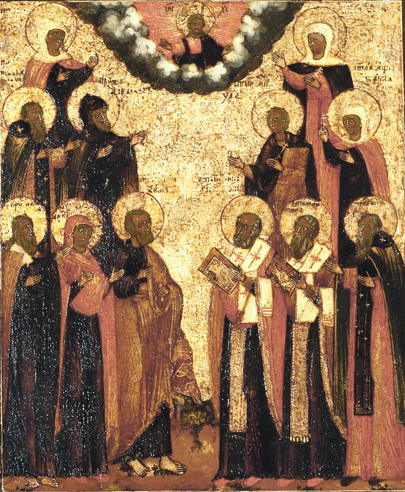 Arranged on three registers, some saints turn in prayer to Christ in Glory, who blesses with both hands as the High Priest, that is, the head of the Church. Pictured below, from the left, are the prophet Elijah, Joachim and Anna, a holy monk, perhaps Dimitrij of Prilukij, the martyr Antipas, and Bishop Nicholas of Myra. In the second register, on the left are portrayed in monastic robes Isaac Dalmatian and Prince Alexander Nevskij, while on the right are the martyrs Juliana and Uar. It is not possible, however, to identify the two saints at the top of the icon, whose names originally inscribed next to the halo are now rubbed off.