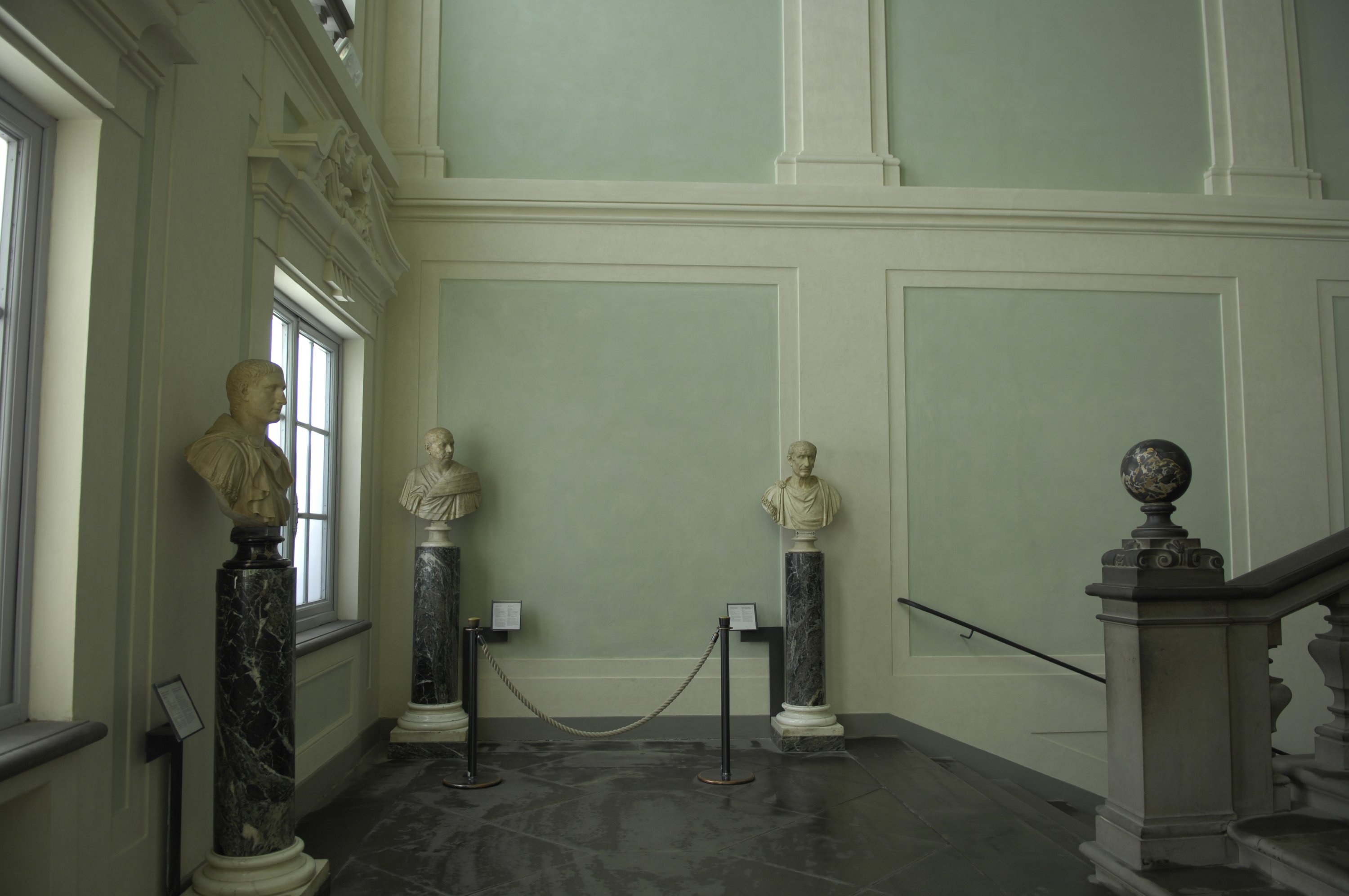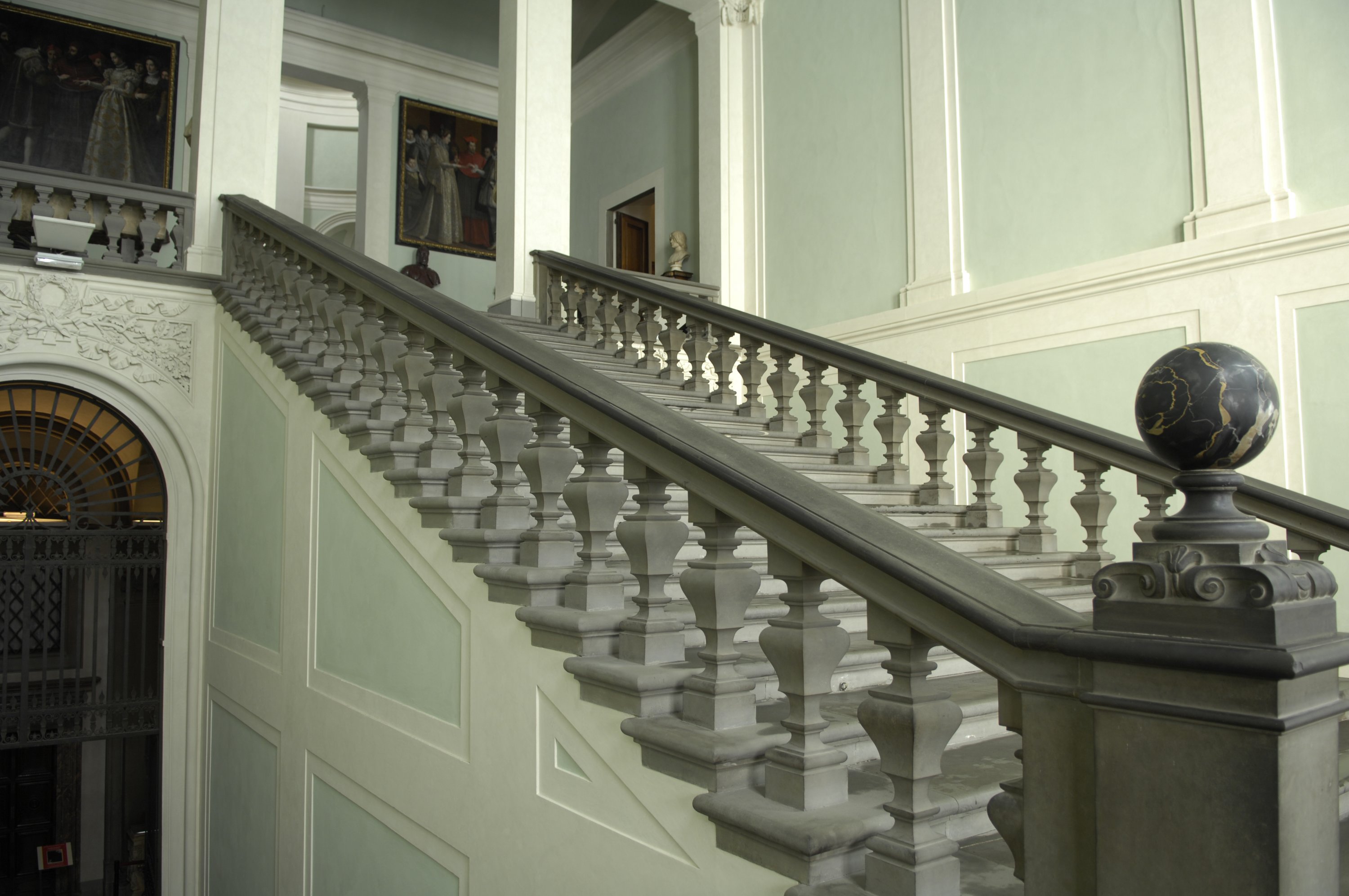 The Gallery on the final floor of the palace is accessed by a grand staircase (as well as the rather outdated but operational lifts) divided into two parts characterized by very different architectural styles. The first flight which leads to the piano nobile was designed by Vasari in Florentine Renaissance style, with heavy use of ‘pietra serena’ sandstone for the various framings on the white lime plaster. According to Vasari's plans, this first set of stairs led to the great assembly hall of the Magistrates who resided below the porticoes of the Uffizi; later, with the help of architect Bernardo Buontalenti, Grand Duke Francesco I, son of Cosimo I, transformed the hall into the Medici theater, of which only the marble and stone archways leading onto the staircase’s landing remain. The second flight of stairs leads to the floor of the Gallery itself, entered via an elliptical vestibule. In the early 1790s, Pietro Leopoldo commissioned Zanobi del Rosso, who trained under both F. Fuga and L. Vanvitelli, to construct the stairs and the vestibule. This staircase and entry hall in elegant neoclassical shapes in pastel green tones (Lorraine green) are reminiscent of the bright contemporary interiors of European capital cities such as Vienna or Saint Petersburg, a tribute to the happy period of enlightenment when the young Grand Duke chose to open the private Gallery previously reserved to certain dignitaries to the general public.