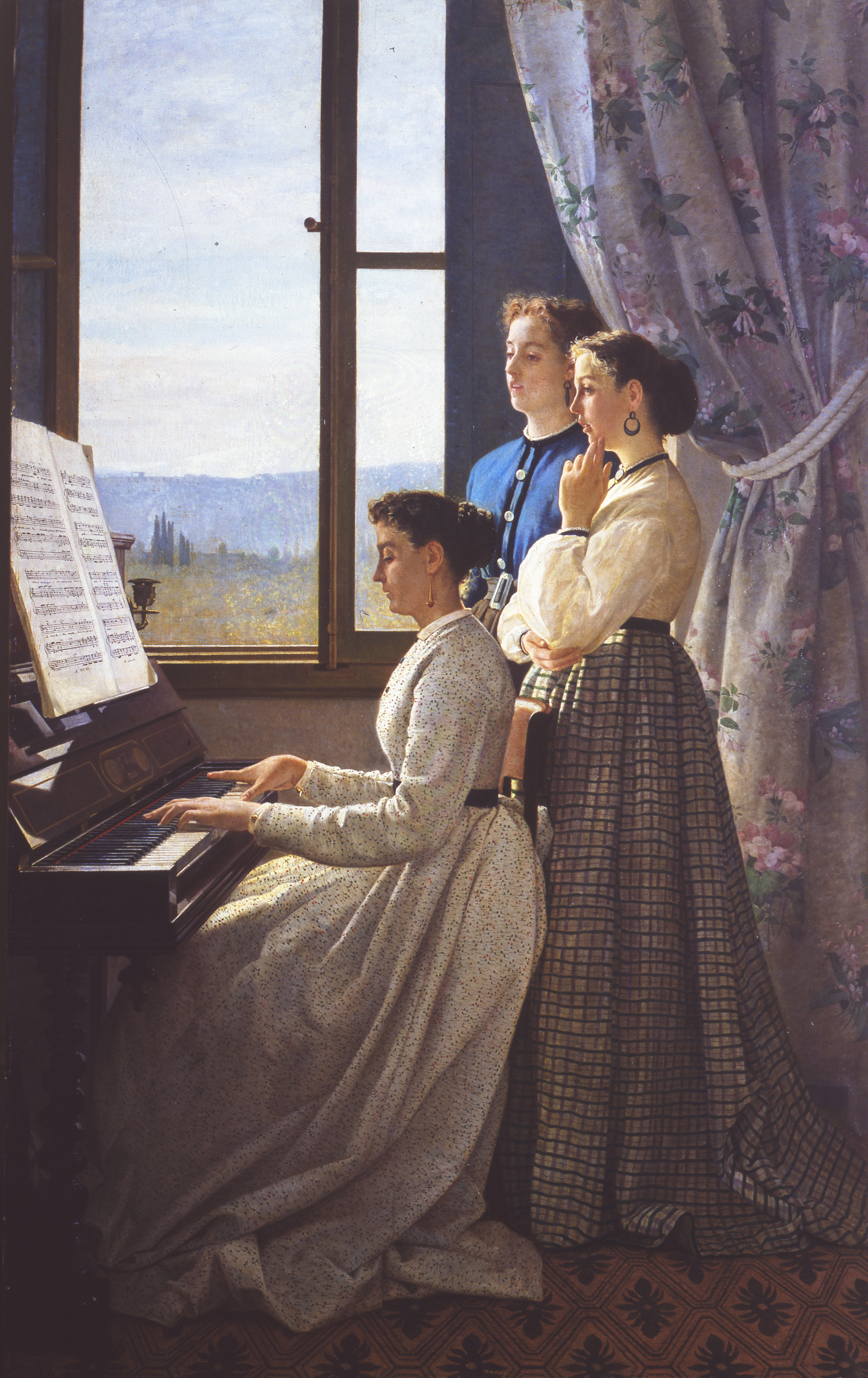 Three young women on a summer afternoon are enjoying piano music in a country cottage. In the room, skilfully reproduced with almost photographic precision, a window opens onto a landscape characterized by cultivated fields and distant hills, a sort of picture within the picture, from which a soft natural light penetrates to illuminate the interior and exterior in equal measure.