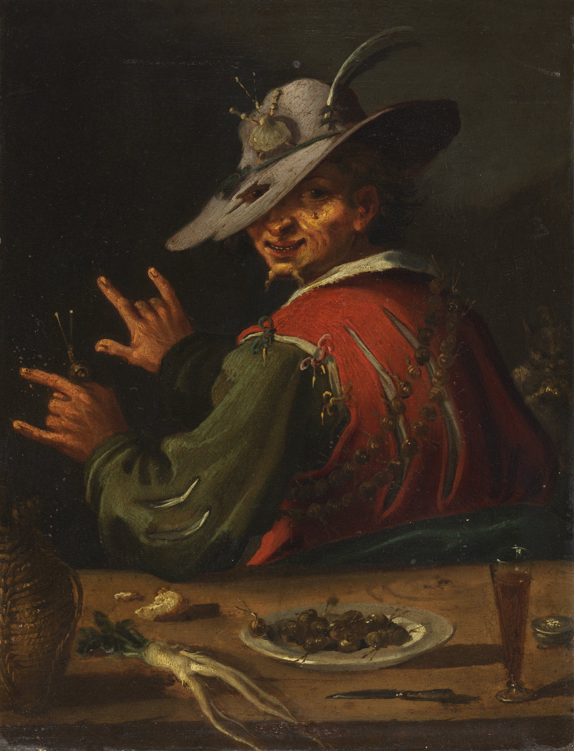 On the table we recognise a morsel of bread, a trifurcated root (perhaps a mandrake), a stuffed wine flask, a conical goblet filled with wine, a small knife and a small box that could be a salt shaker. In the centre, a ceramic plate contains snails, small molluscs whose antennae protrude from their shells. The young man, turned three-quarters, raised his hands in the scaramantic and well-wishing gesture of the horns.