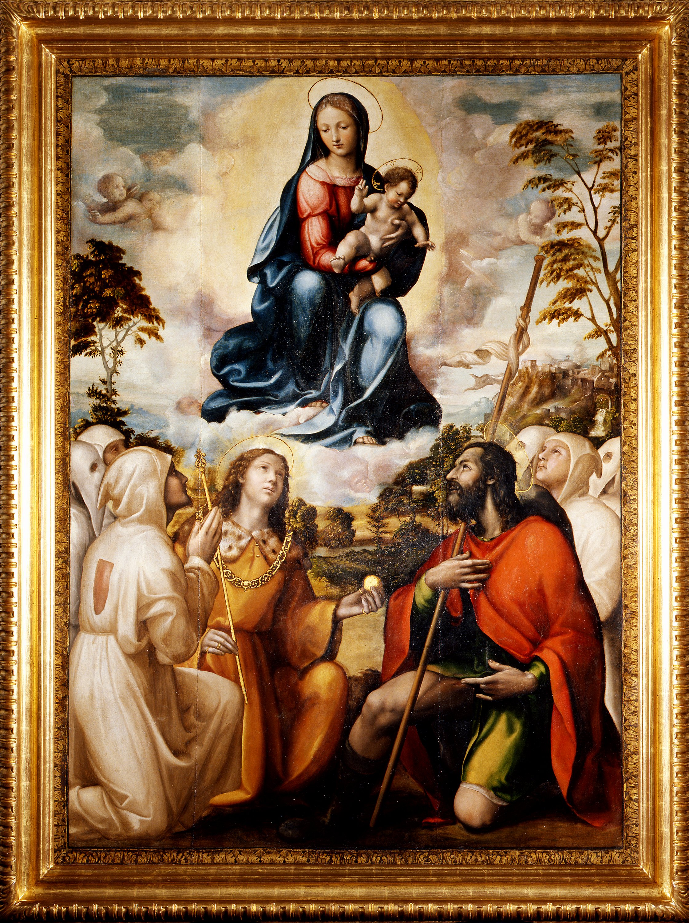 Painted on both sides, in relation to the use for which the work was destined, which required it to be visible from both the front and the rear, the processional gonfalon was ordered to Sodoma in 1525 by the members of the company of St Sebastian, one of the many associations of compassion and assistance for the sick formed in the area of Porta Camollia in Siena. Traditionally, Sebastian, praetorian of the Roman army, a man of Christian faith who was sentenced to death by Diocletian, was assigned the role of protector from epidemic illnesses. For many centuries, and in particular between the 14th and 18th centuries, these illnesses repeatedly scourged the lands of Europe. The passion of the saint, who was led to the Palatine hill, tied to a tree, and shot with arrows, is defined in the iconography from the Renaissance on. In this context, Sebastian embodies an ideal of strong, youthful beauty, victorious even in the face of the most cruel torments, such as those inflicted by illnesses that were unknown and fatal in those centuries, but with which man had learned to coexist, by surrounding himself with a network of social solidarity, such as the brotherhoods. Sodoma places the protagonist in the foreground, painting him in a bright light with delicate chiaroscuro shading against a background of landscape studded with ancient ruins, of the kind he had learned about in Rome, by observing the example set by Raphael and his pupils. The legend of the saint, defined by the hagiographers as “athleta Christi”, coincided - especially in Renaissance sensitivity - with the reference to a perfect, athletic body, twisted with pain and following the shape of the tree trunk to which he is bound. Sodoma, like his peers, had access to a vast range of ancient Greek and Roman statues, a never-ending supply of models and shapes that he used to pinpoint the right level of formal perfection and at the same time to personify the expression of the drama. His greatest inspiration came from the most celebrated and copied sculpture in Rome in the 16th century: Laocoön and his sons, a group of marble statues found on the Oppian Hill and immediately invested with a formidable, long-lasting iconographic popularity. The icon of the saint, weak and suffering, with tears streaming down his beautiful face as he receives the crown of martyrdom from the angel, was the first to appear to the faithful during the processions, arousing the most emotional senses of compassion and faith. But the function of the standard and its message are completed in the scene depicted on the back, a more solemn and official image, celebrating the Virgin, protector of Siena, whose glance rests on the group of devotees kneeling at the bottom of the painting. St Sigismondo and St Rocco feature in the centre of these. Joint leaders of the company, they too were among the first Christian martyrs. In particular, San Rocco (Montepellier 1345/1350- Angera?, Varese 1376/79) is another figure traditionally linked to the context of the healings for his role as protector from the plague. Legend has it that Rocco, during a pilgrimage to Rome, having donated all his belongings to the poor, stopped at Acquapendente, near Viterbo, dedicating himself to aiding the sick and working miraculous healings that spread his fame far and wide. He himself caught the plague and fell ill but recovered and soon set off again on his way, continuing his charitable work. Rocco is said to have died in prison, having been arrested near Angera by some soldiers, as a suspicious person. His cult became extremely widespread throughout northern Italy, especially in Lombardy. Sodoma portrays the Saint with the walking stick of a pilgrim and the angel with the traditional attributes, while indicating on his right leg the ‘boil’, the puffy swollen mark left by the terrible black plague. The brothers of Porta Camolia are positioned alongside Sigismondo and Rocco, dressed in white tunics and hoods, dispensers of that moral and bodily comfort they felt a civic duty to administer, traces of which still survive today in the traditional Tuscan care-giving ethos.