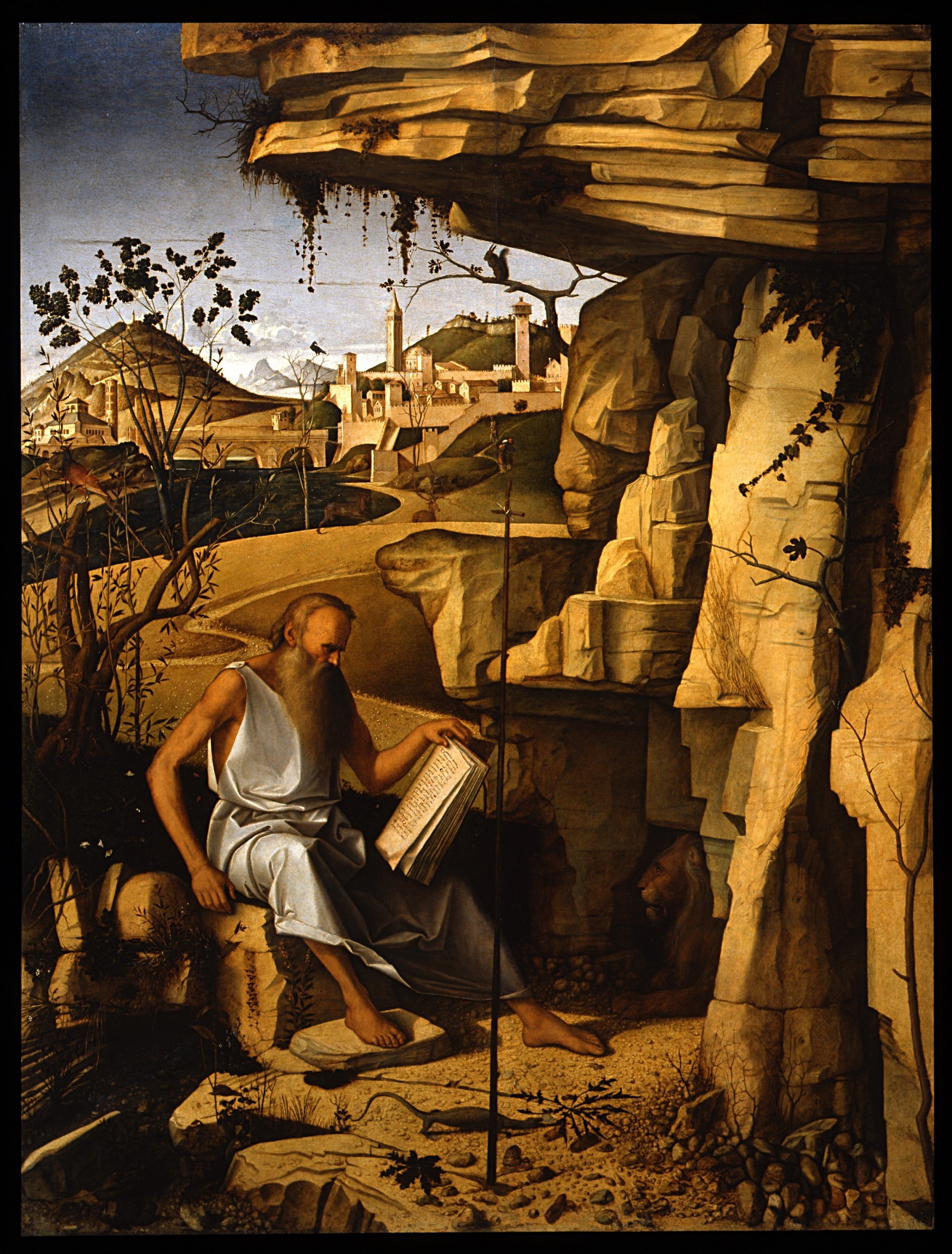 St Jerome is portrayed in the dual role of penitent hermit in the wilderness, and humanist, intent on reading. He is sitting in a wild, desert landscape with a city in the background that signifies the contrast between nature and civilisation. A lion, hidden in its den, from whose paw Jerome is said to have removed a thorn, is keeping him company. In the foreground, a thin cross stands in the ground, while a lizard crawls behind it. This animal traditionally symbolised death and the resurrection, given its ability to hibernate. The multifaceted figure of St Jerome (347 – 419/420), hermit, penitent, cardinal and outstanding humanist, who had translated the Bible from Greek into Latin, was an extremely popular subject in 15th and 16th century paintings in Veneto, as a supreme example of the harmony between Classical knowledge and Christian virtue. He was therefore a subject favored by a refined, educated public and was commonly depicted in smaller works used for private worship. The landscape, with the desert and city, may have represented hope for a return to a harmony between nature and humanity. In Giovanni Bellini’s works, the depiction of the landscape takes on an essential role: castles, mountains, rocks, trees and clouds have the same importance as the main subjects depicted, whether holy or profane. The city that stands out in the background is imaginary, although it consists of real – albeit not Venetian - architecture: the church of San Vitale and the Mausoleum of Theodoric in Ravenna, the Bridge of Tiberius in Rimini, and the bell tower of Sant’Anastasia in Verona, all buildings that Bellini had probably been able to draw and then use in his compositions.