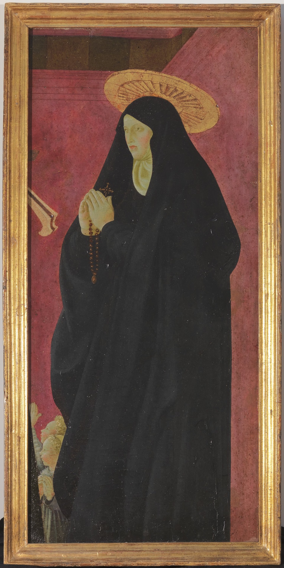 This fragment is all that remains of a composition showing what is perhaps Mary and Child, surrounded by various saints, a subject known as the Holy Conversation. The holy theme was set within an architecture where it is possible to see the perspective flight of the architrave above. The saint is usually thought to be Monica (331-387), mother of the philosopher and theologist, St Augustine who, through her love and prayers, converted to Christianity. Her black robes, together with the white wimple that covers her head and neck, are like those of a nun, but they were also usually worn by widows, as Monica was. The worship of this saint increased notably in Italy after the moving of her remains from Ostia to Rome in 1430. Monica is holding a small cross, a circulum precatorium, a string of beads used when praying. At her feet, two children are praying with their hands together. The object on the left may be the handle of a musical instrument held by an angel, or a fragment of the attribute identifying another saint, perhaps the knife with which St Peter Martyr (1202-1252) was killed. The dark robe, a part of which can be seen in the bottom left side, may perhaps be identified with the iconography of St Peter Martyr, a Dominican friar.