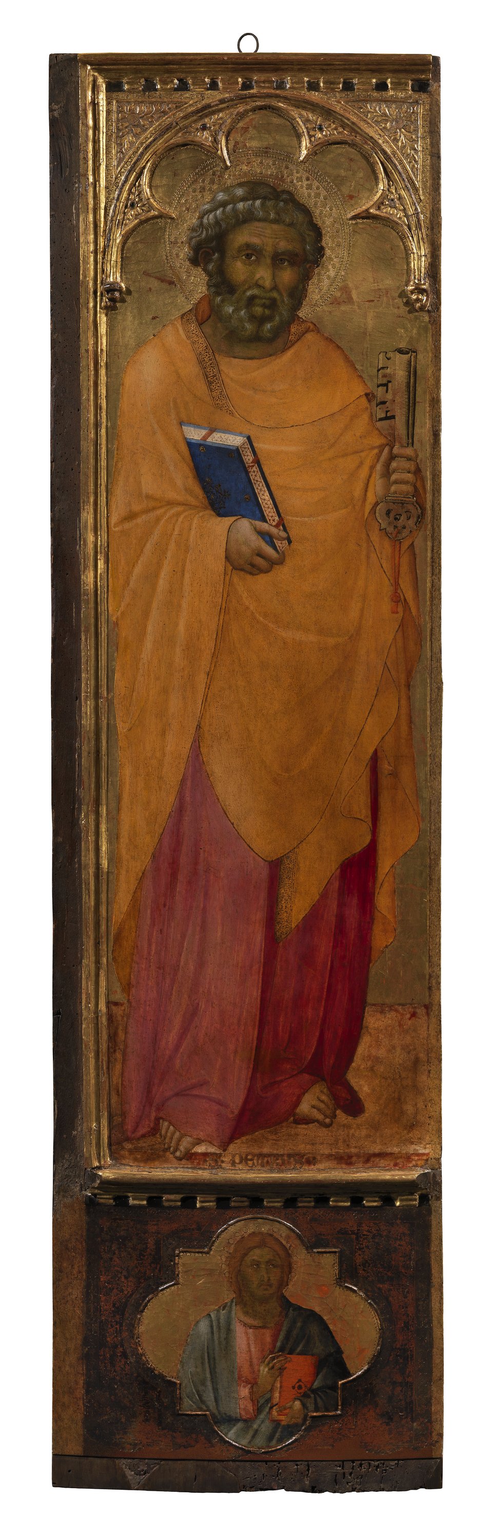 Alongside the panel featuring Saint John the Baptist (inv. 1890 no. 6137), this panel was part of a now dismantled altarpiece of which other fragments are preserved in the Pinacoteca Nazionale Museum in Siena depicting the Madonna and Child Enthroned (inv. no. 76), St. Gregory the Great (inv. no. 59) and St. John the Evangelist, (inv. no. 75). It must have been a polyptych with at least five sections and a sort of predella at the bottom composed of the doctrine of half-length saints, finished with several cymatium at the top, which have been lost.