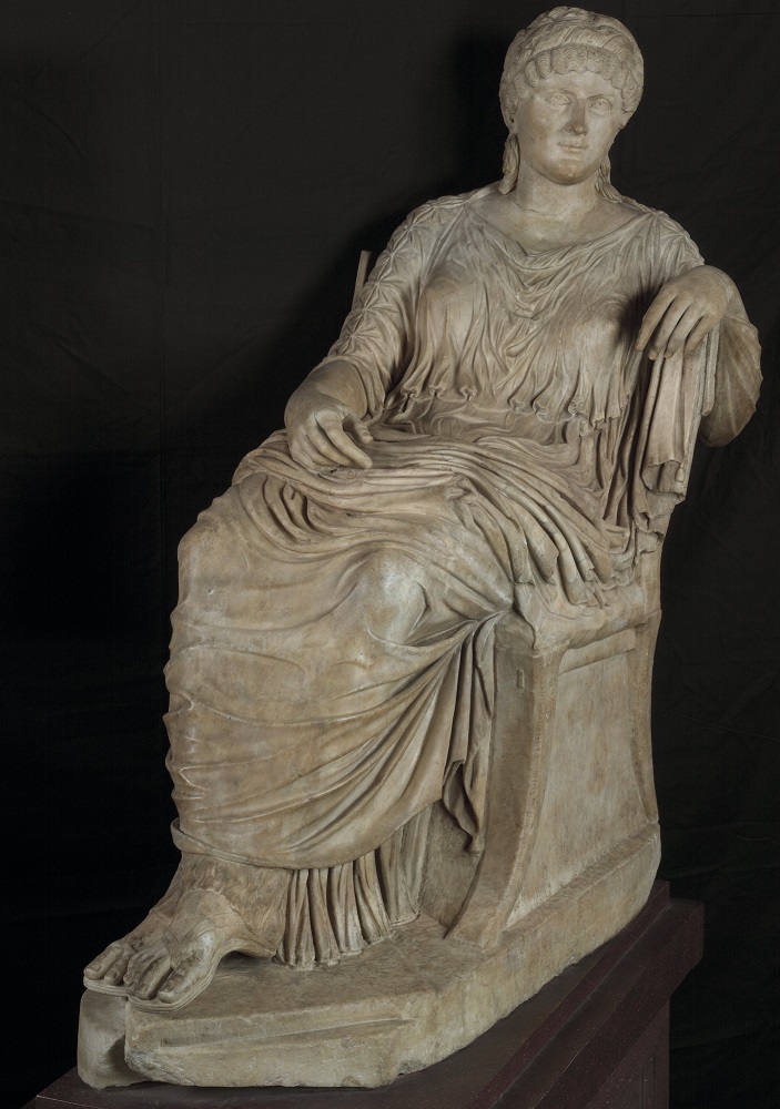 This work, probably owned by Cardinal Ippolito d’Este, is perhaps one of the seated female sculptures found at Villa Adriana in the mid-16th century . It arrived in Florence at the end of the same century and after a period in the Boboli Gardens, it was placed in the Uffizi in 1640. Small additions can be seen on the nose, the figures and toes and some of the locks of hair, while the head, although repositioned on the neck, seems to be the original. The type of female figure, originally characterised by an artificial hairstyle in plaster, typical of late antiquity, has led to this figure being classified as the empress, Helena, mother of Constantine, celebrated by sources as having found a relic of the True Cross in Jerusalem. The statue seems to be adapted from an older work that can be identified as Lucilla, sister of emperor Commodus and datable to around 166 A.D. and then struck by damnatio memoriae. The Florentine marble, which has a direct parallel in a statue today in the Capitoline Museums in Rome, shows the prominent role of Helena during her son’s reign. Helena came from humble origins, becoming concubine to emperor Constantinius Chlorus, bearing his only male child. She was an early convert to Christianity and perhaps the inspiration behind and main supporter of the pro-Christian politics of her son in the years after the Battle of Milvian Bridge.