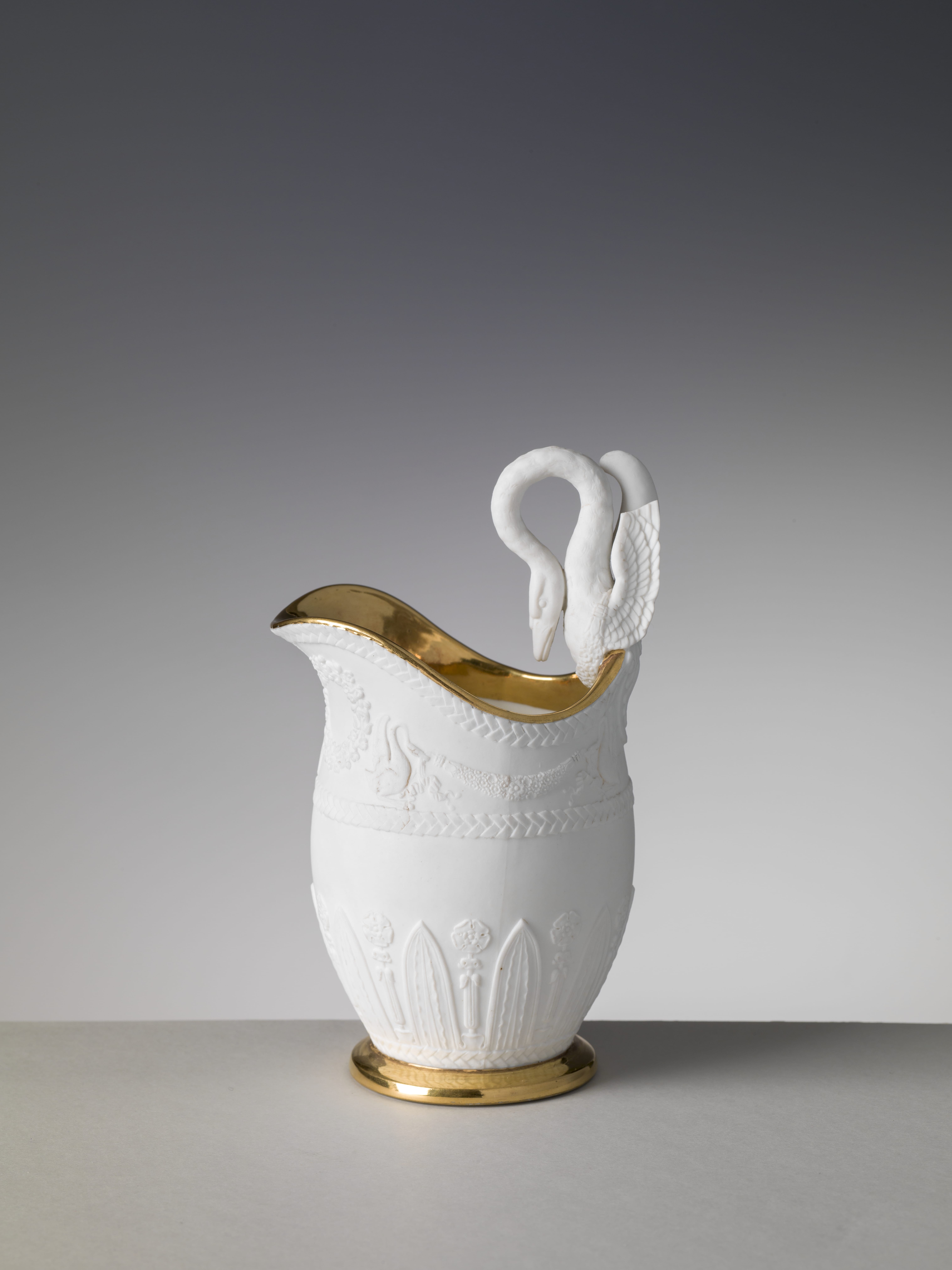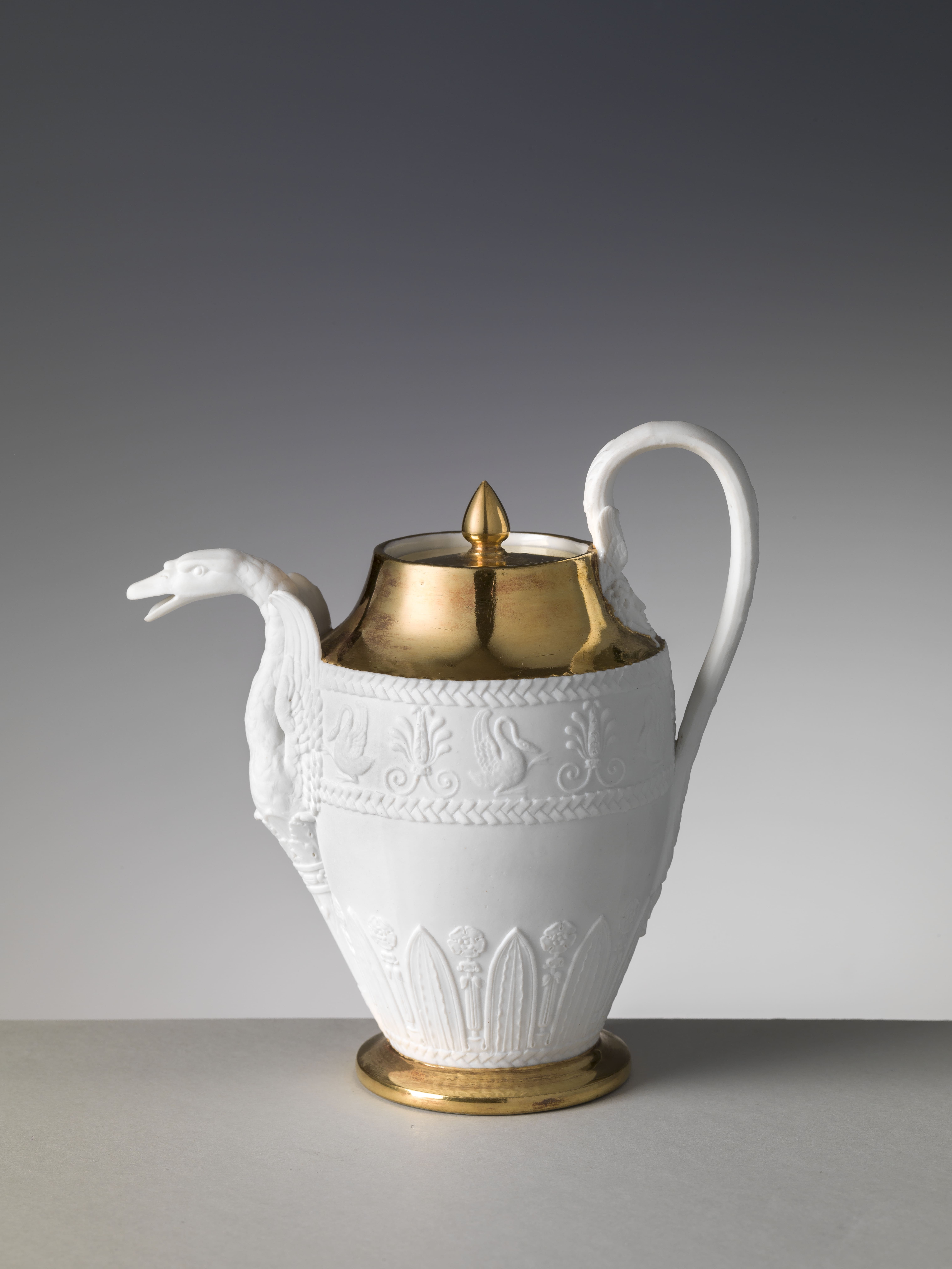 The set was probably complemented by a sugar bowl with a lid, a bowl with claw-shaped feet and a tray. There is no information on its collecting history, but we can hypothesise, given the period of execution and the presence of the swan as the protagonist, that it can be traced back to Elisa Baciocchi, who came to live in the Royal Pitti Palace after her appointment as Grand Duchess of Tuscany in 1809.