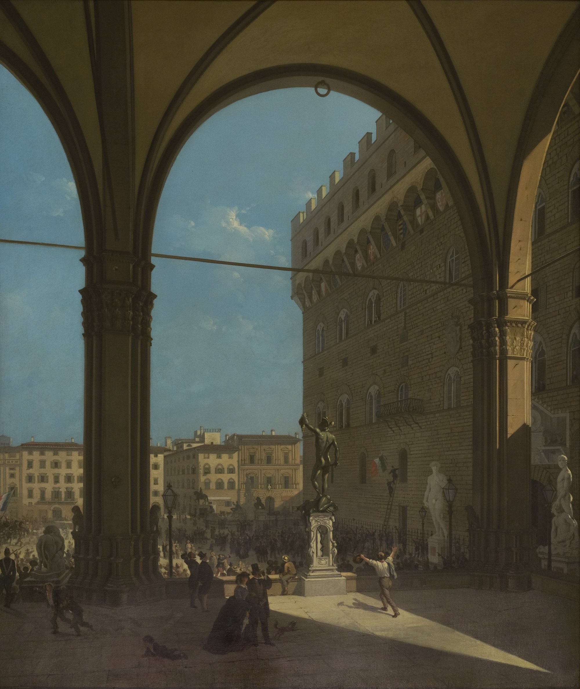 In this piece, Enrico Fanfani has been able to capture a crucial moment in Florentine history: the peaceful expulsion of the Habsburg-Lorraine family from Florence, and the creation of a provisional, independent government that marked the prelude to its voluntary annexing to the Kingdom of Italy. In a kind of diary, Guido Nobili, future Florentine lawyer who, at the time was just eight years of age, described the events of that crucially important day - remembered as the “velvet revolution” since it was completed without the use of violence. His precious descriptions tell us of Leopold II of Lorraine leaving Florence with his family, in a carriage directed towards Vienna. In the city, a provisional government was elected and the Italian tricolour flag was immediately adopted: “the stripes will be vertical... green at the post, white in the middle, and red on the outside.” Our painting shows a moment of jubilation inside the Loggia de’ Lanzi: some are celebrating the grand duke’s departure, while others are raising the Italian flag; people are embracing or throwing their hats in the air, and some are simply observing the event. In the same year as the painting was exhibited at the Promotrice exhibition of 1860, the then minister, Poggi, proclaimed the result of the plebiscite, which saw the victory of the “union with the constitutional monarchy of King Victor Emmanuel”.