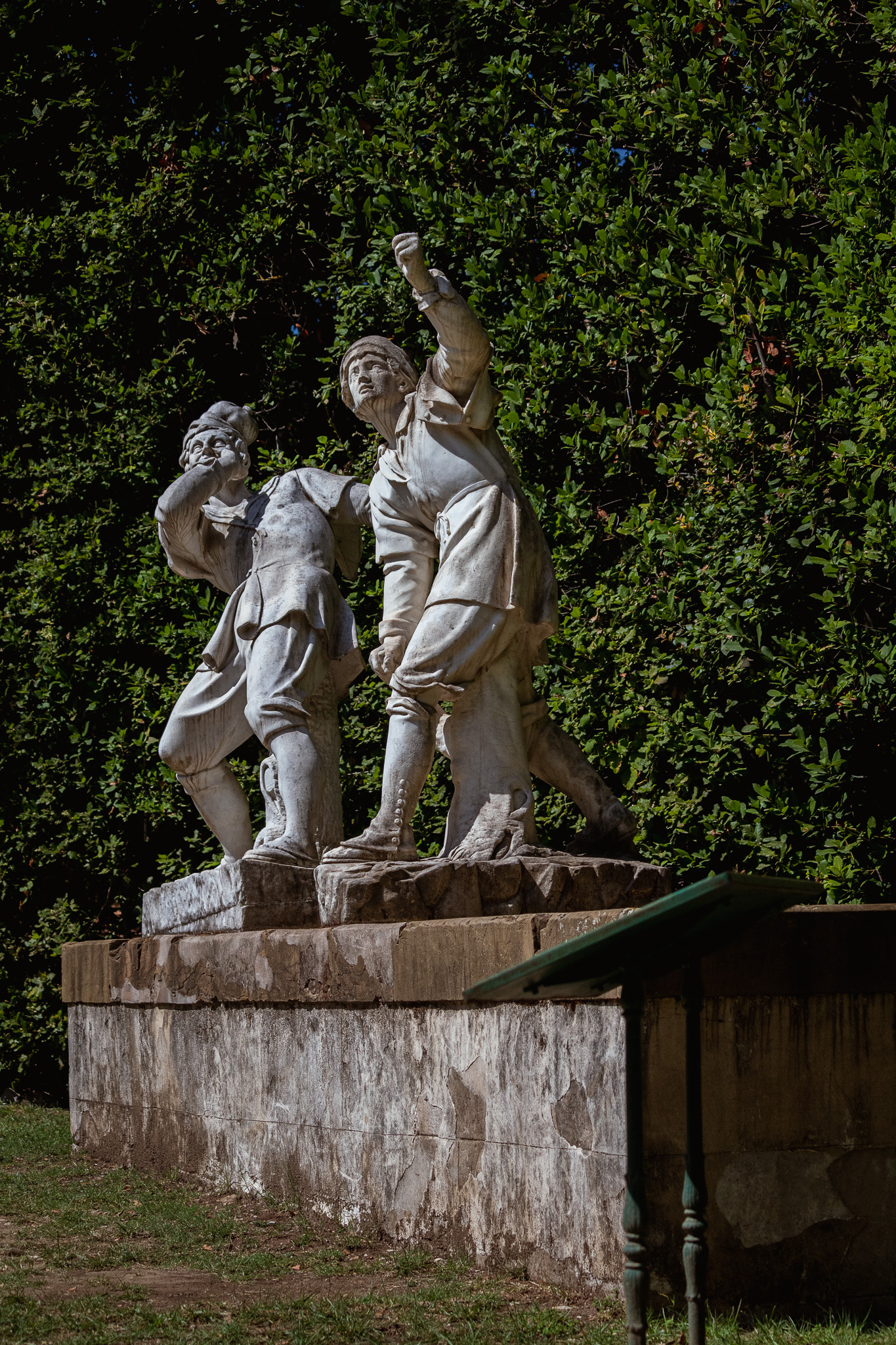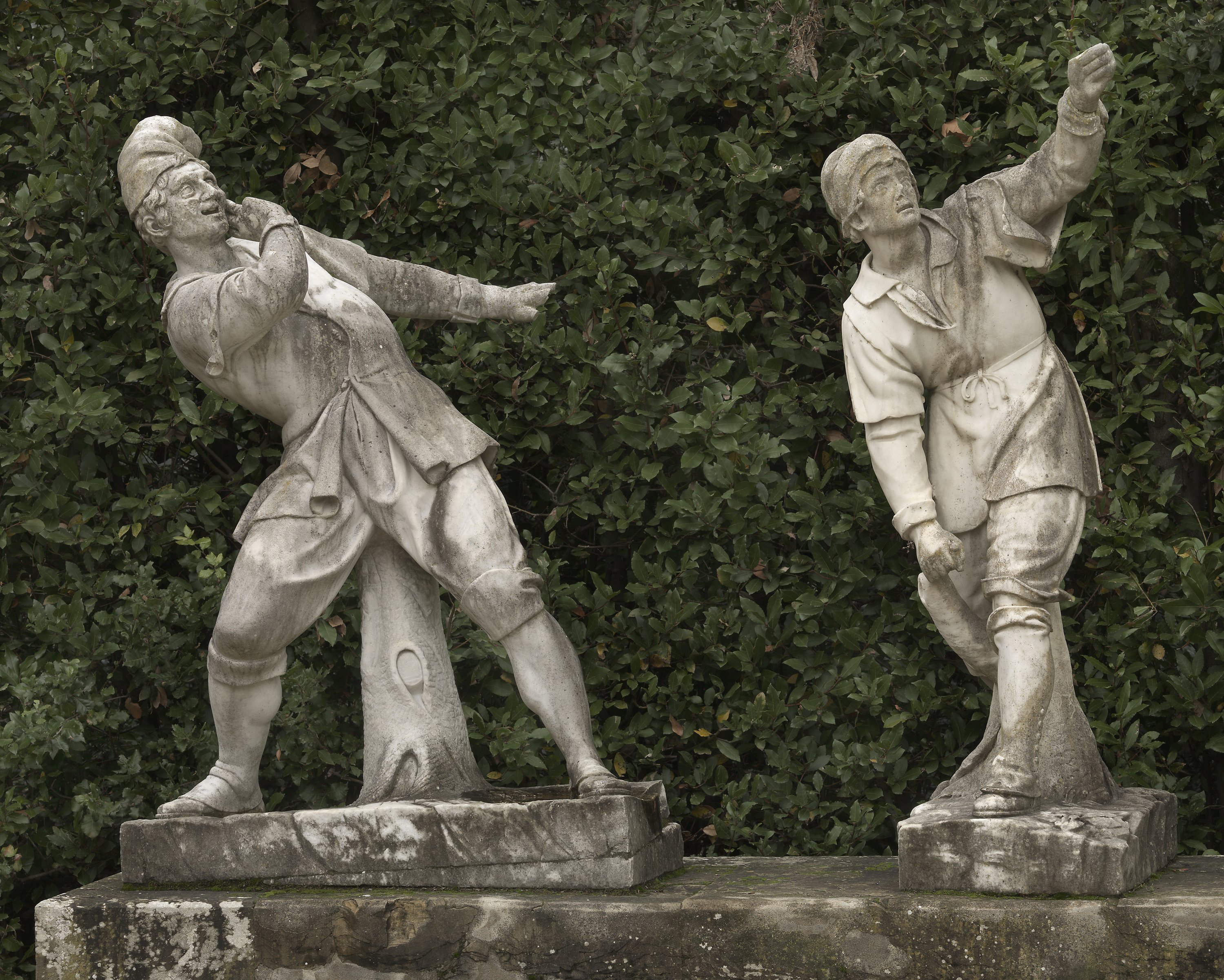 The sculptural group of the The Owl Game (Gioco della Civetta) is located in the Boboli Gardens in front of the Caramogi group by Romolo Ferrucci del Tadda, and consists of two white marble statues depicting two youngsters while playing. The aim of this game was to take the hat off to the other player who, in order to try to escape, had to bend over continuously (in Italian 'fare civetta'). Therefore, one character is outstretched to grab the hat, while the other is attempting to deftly dodge the opponent's move. The jacket of one of the two players is unbuttoned, precisely because of the abrupt movement that he makes by throwing himself backwards, and both figures are supported by tree stumps. The Owl Game was originally commissioned to a sculptor known as 'Matteo scultore' in 1618 and its execution, which lasted for several years, was completed by different artists. The modelling was probably done by Orazio Mochi, who took inspiration from Giambologna's Uccellatori. The statues were then sculpted by Romolo Ferrucci del Tadda, who left the group unfinished at his death, missing one figure. After various assignments, the work was finally completed by Bartolomeo Rossi in 1622. Unfortunately, The Owl Game in stone deteriorated quickly and got destroyed.