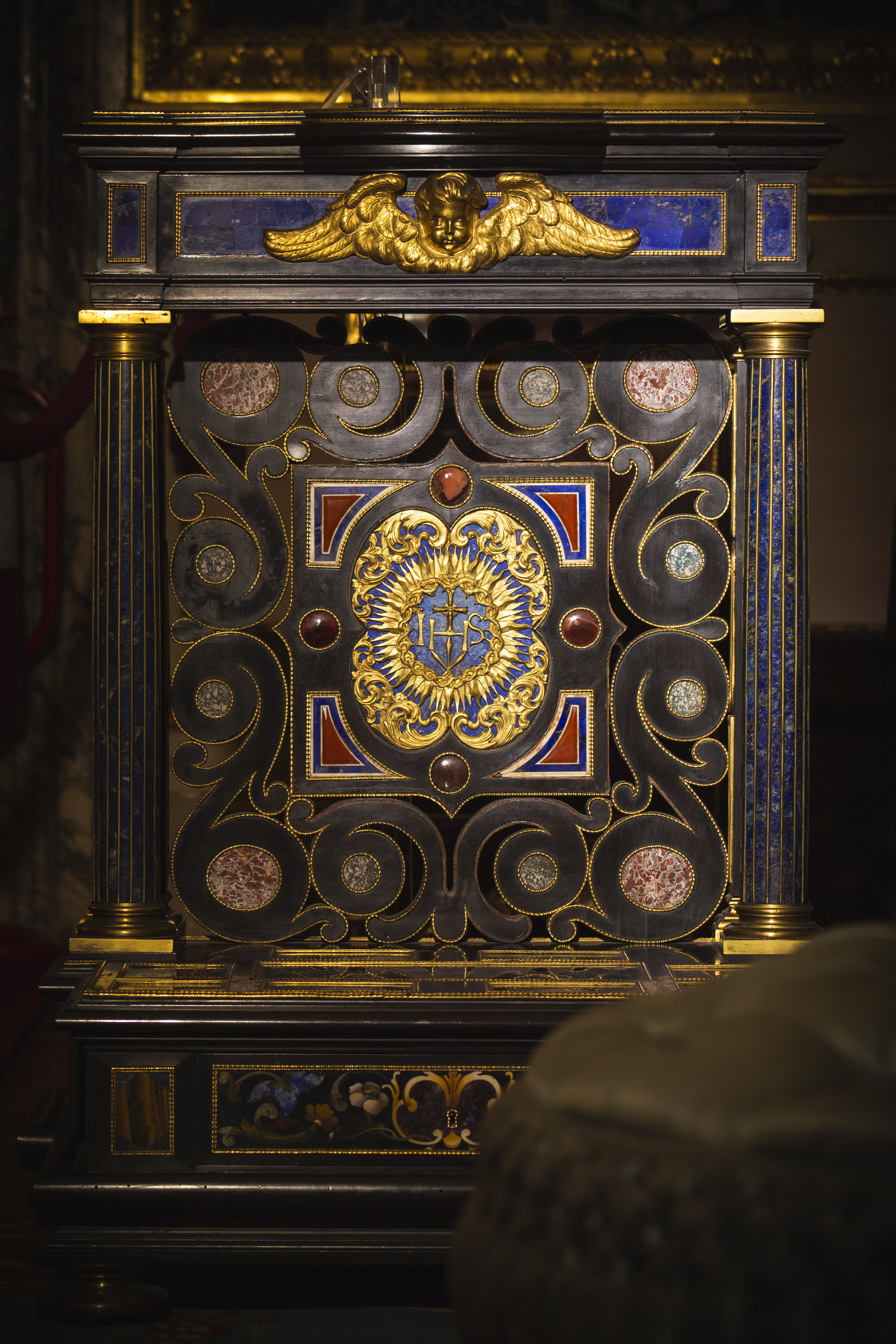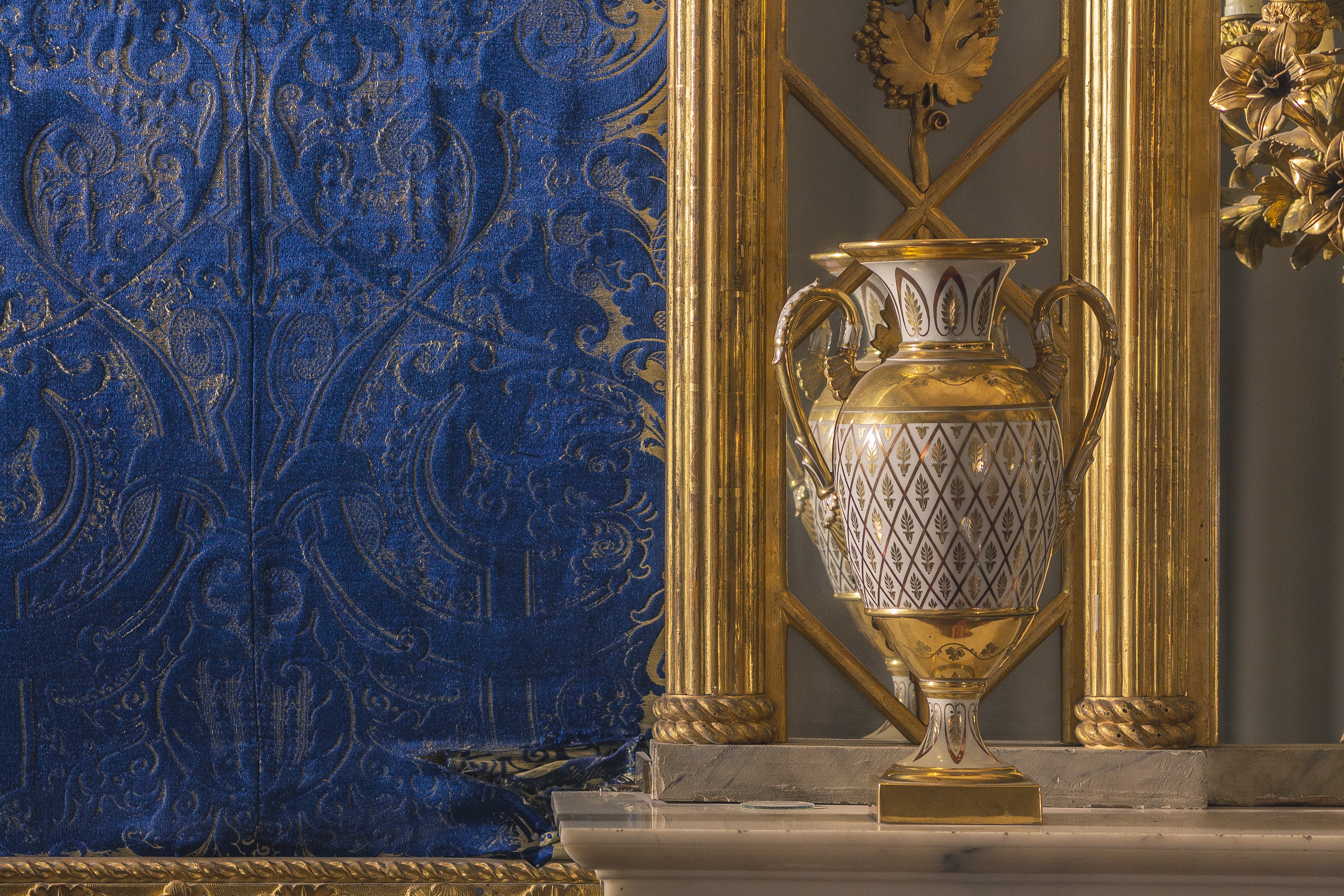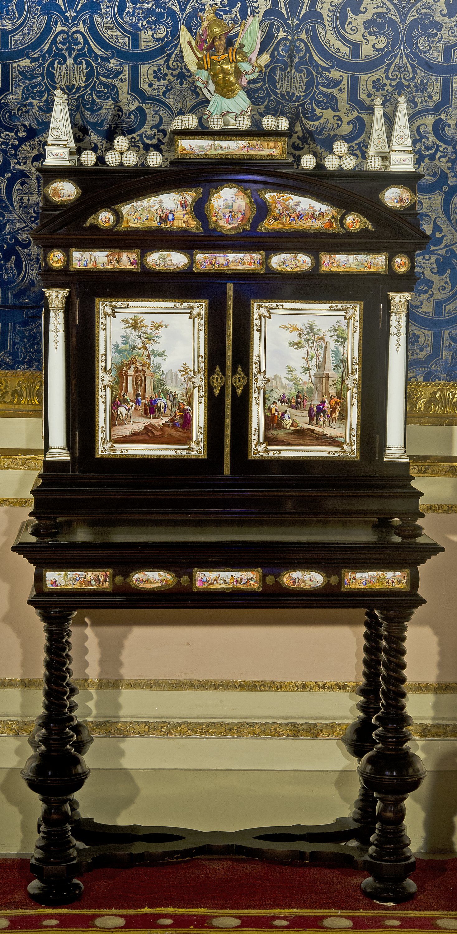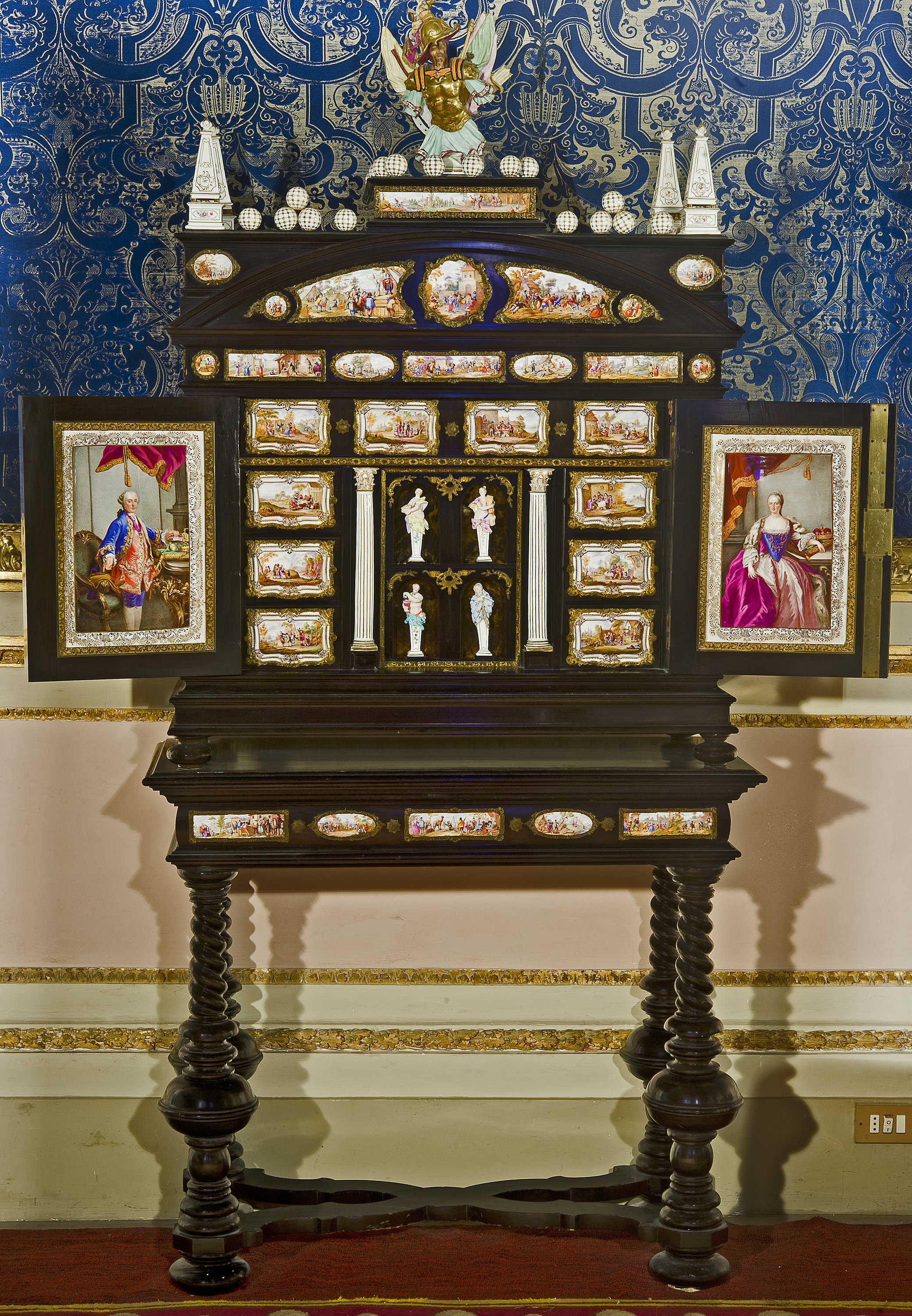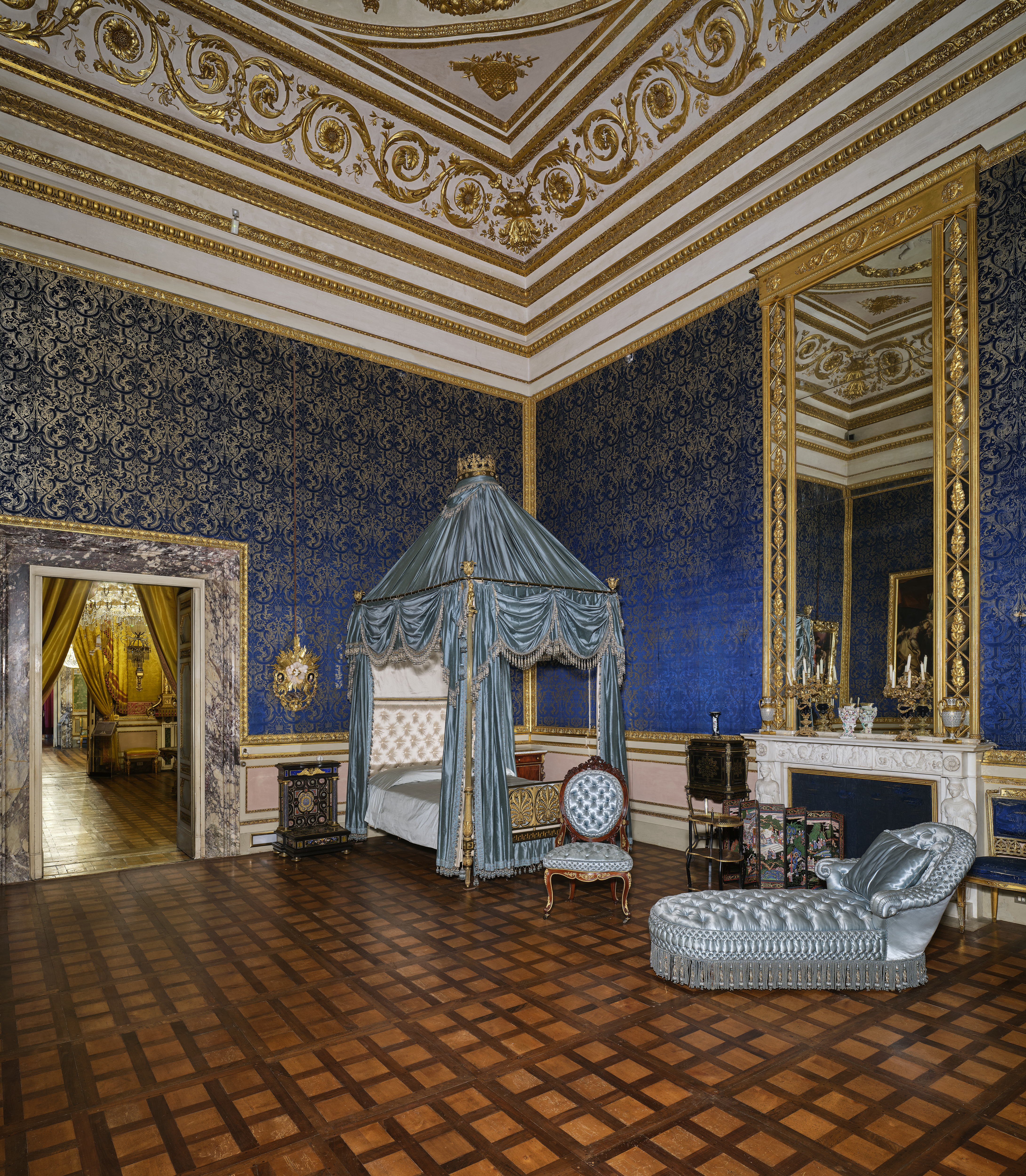 The holy water stoup on the wall and the kneeling stool in pietra dura, were made in the Grand Ducal workshops in the period between the late 17th and early 18th centuries, are companion pieces to the Chinese carved and lacquered wooden screen from the early 19th century. The delicate seating in neo-classical style forms a setting for the brand new - for the period - table in metal with scagliola top, used as a stand for a Meissen porcelain tray, mounted in bronze with a delicate detail of birds drinking. The furniture includes a writing desk in holly, signed and dated Giuseppe Cantieri 1942, decorated with elegant carved design in Etruscan style; a small medal display case by Milanese cabinet makers specialised in gild bronze inlays, known as “alla Boulle” (from the name of famous French cabinet maker, André-Charles Boulle, who worked at the court of Louis XV); the ebony, ivory and porcelain cabinet from Dresden, made by J. A. Turpe some time around 1850. The items stand in a muffled, subdued and softly relaxed atmosphere, which rather than from the canopy bed, comes from the surroundings, covered in deep blue French wallpaper, with an 18th-century rest armchair and a dormeuse, made especially for Queen Margherita in 1885.