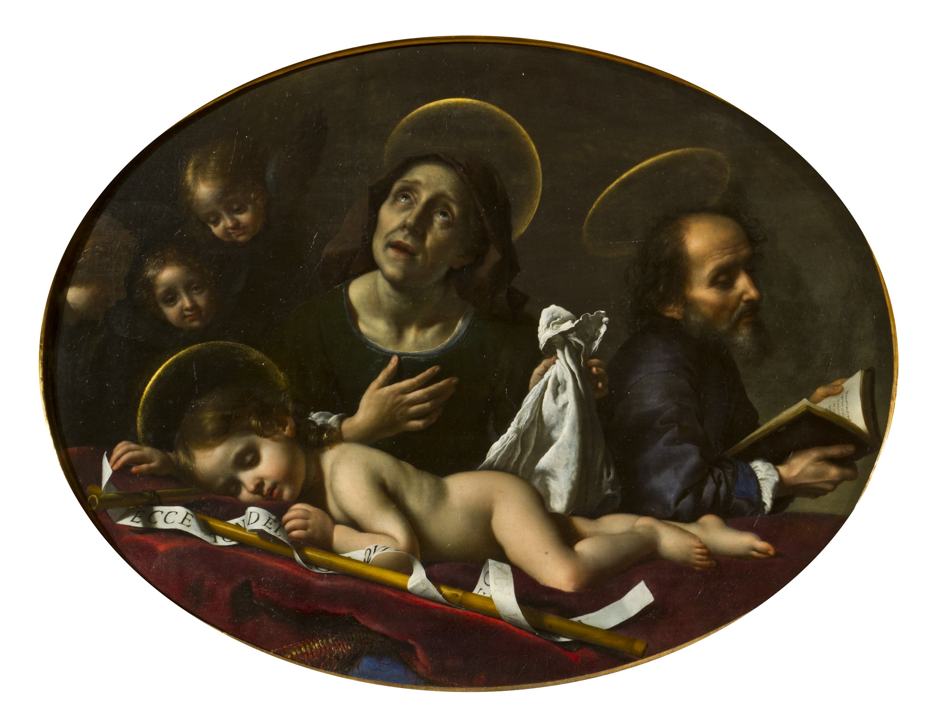 This oval piece, with its exceptional pictorial quality, was painted for Vittoria della Rovere, wife of Ferdinando II de’ Medici. The Grand Duchess was a great admirer of the painter and owned more than thirty of his works, which she continued to purchase after his death. Filippo Baldinucci mentions that the painting was intended for the Villa of Poggio Imperiale, her favorite home, where it was placed in the “room of paintings with windows overlooking the secret garden,” or rather, in a room that once contained fifty or so paintings by the most important artists of the early 16th century and by Florentine painters who were Dolci’s contemporaries. The iconographic subject of the naked child, resting on a red velvet blanket in the foreground is taken from the ancient statues of Eros sleeping and of Hermaphrodite, a subject interpreted here in a religious context. St Elisabeth, shown behind her child, is looking to the heavens, while Zechariah is immersed in reading a holy text. Their positions allude to the story of the Baptist and his dramatic end, foreshadowed from the time of his birth. The blood red velvet evokes the beheading of John, while the rush cross with phylactery and the inscription, “ecce agnus dei” are symbols of his role as the precursor of Christ. The subject has also been linked to the late motherhood of Vittoria, who gave birth to Francesco Maria, future cardinal and passionate art collector, in 1660.