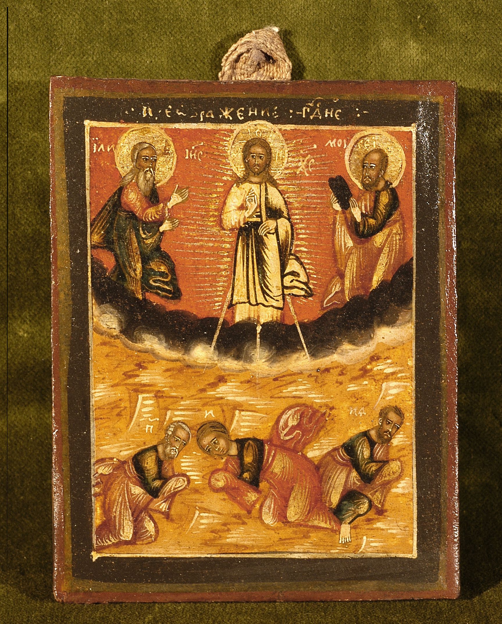 This icon depicts the Gospel story of the Transfiguration in which Christ, in the presence of the apostles Peter, John and James, revealed his divine nature on Mount Tabor, becoming radiant and appearing before the prophets Moses and Elijah.