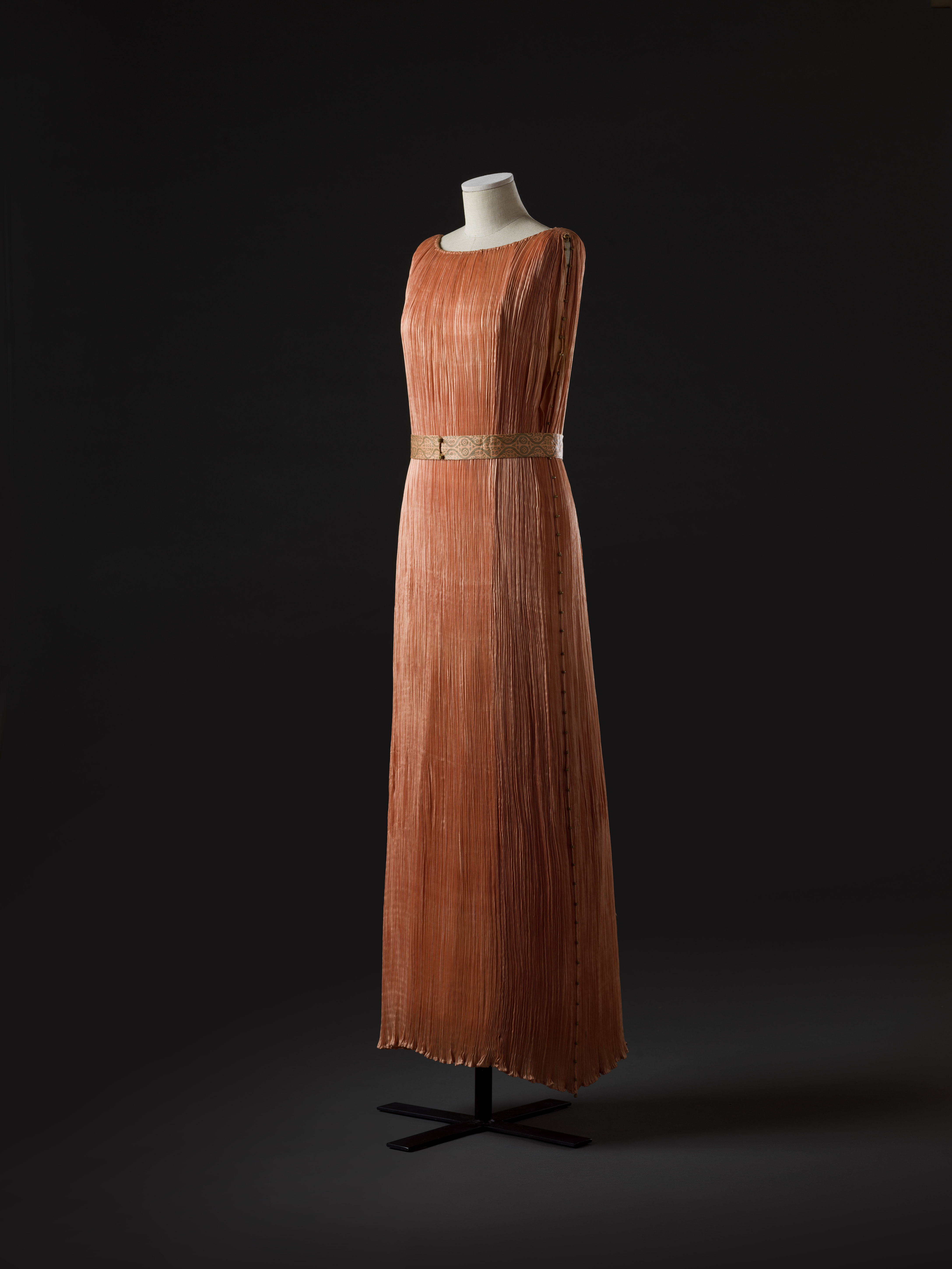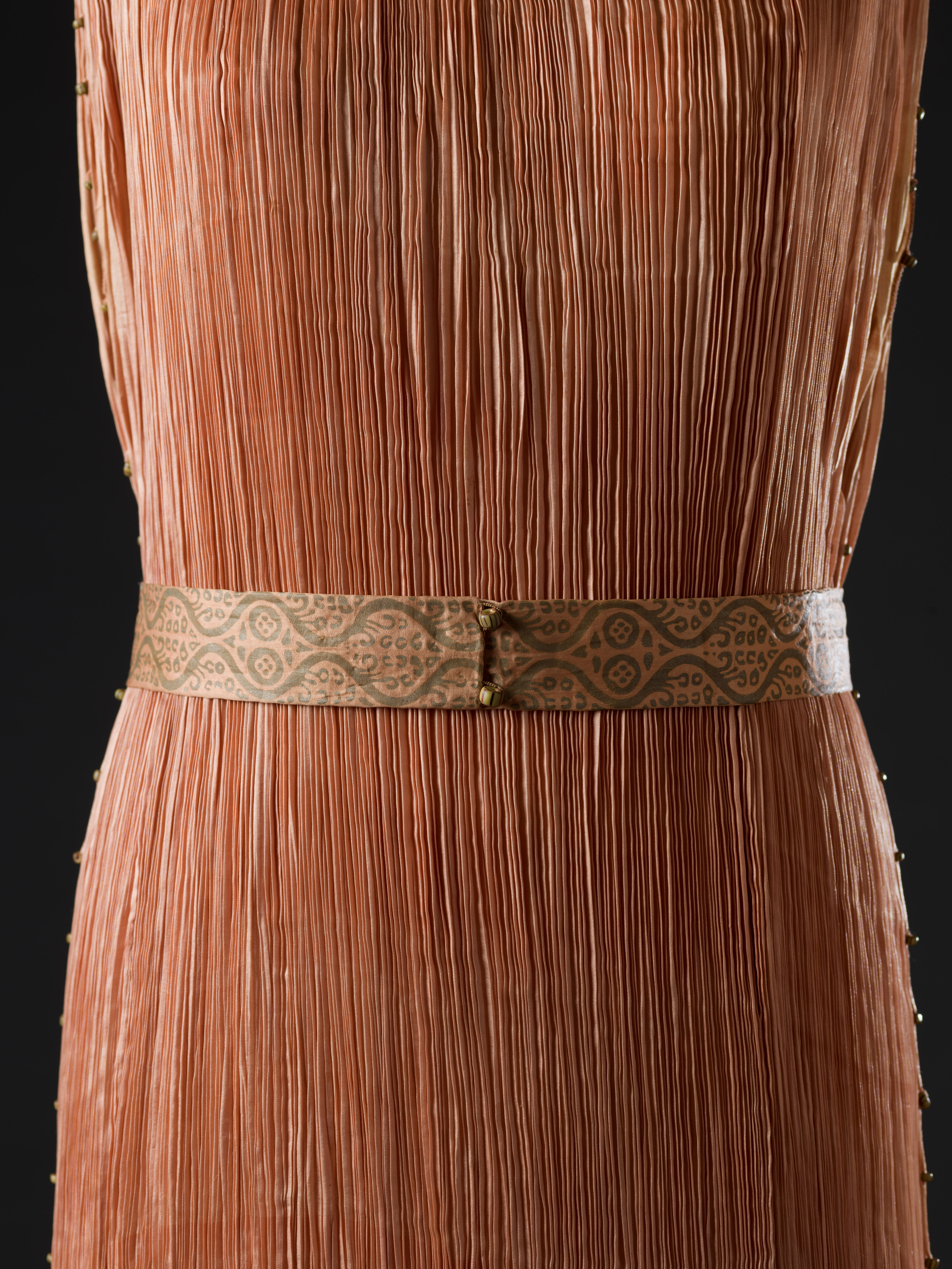 Long shift dress with extremely fine sunray pleating (thus named because the pleats of the fabric are arranged in the form of a grad- uated accordion) and a broad Sabrina neckline in salmon silk. The dress is taken in at the shoulders, with tiny Murano glass beads strung on an overcolour silk cord along each side seam running the full length of the shift. The dress has a silk ribbon belt with grey ramage motifs on a salmon base. This exemplar is a variant on the famous Delphos Tunic that Mariano Fortuny designed in 1907, draw- ing his inspiration – as the name suggests – from a celebrated Greek statue known as the Charioteer of Delphi. The dress was owned by Cavalier Zuliani of Padua’s second wife, Beatrice Bandinelli.