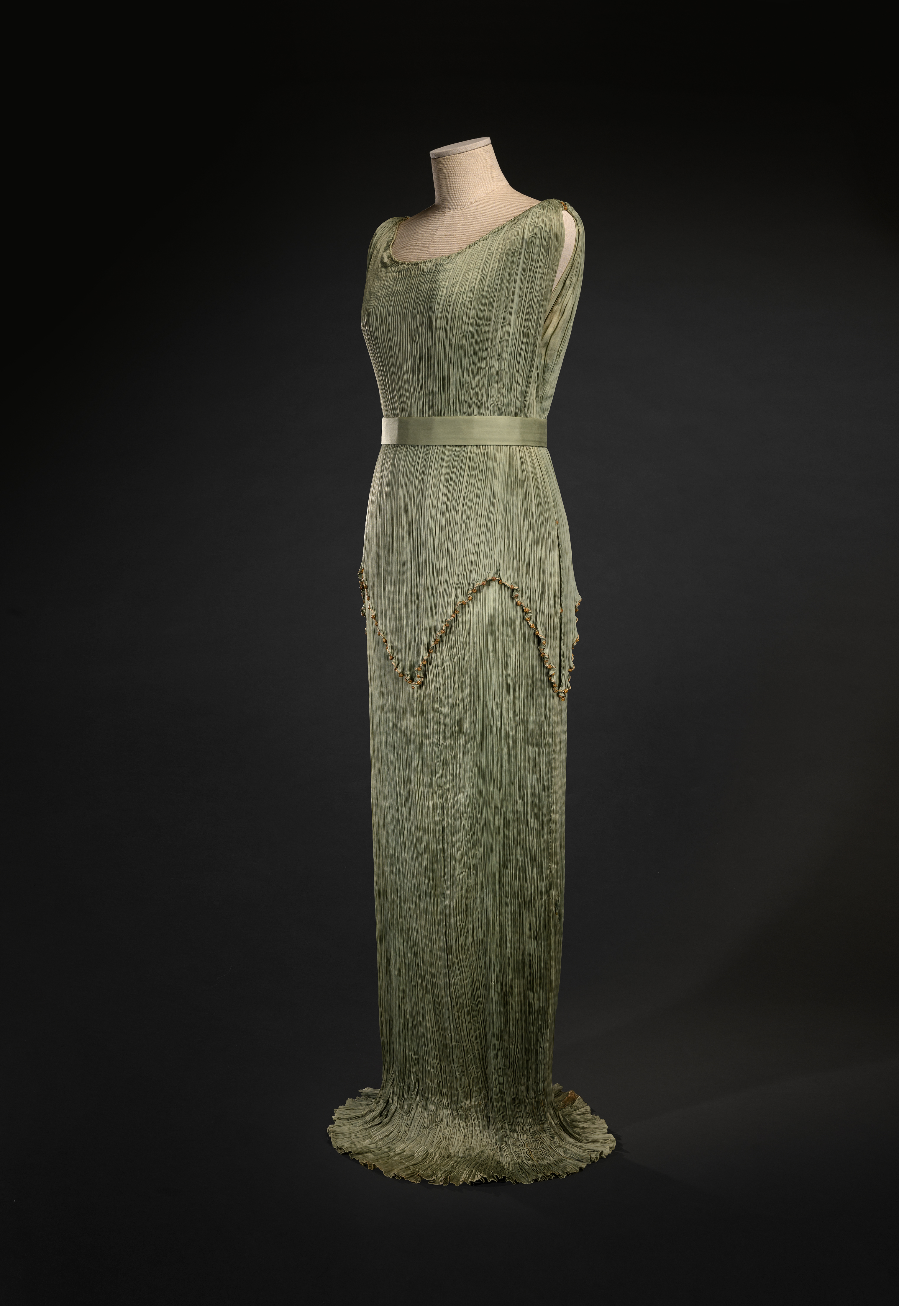 The dress has a silk ribbon belt. This exemplar is a variant on the famous “Delphos tunic” that Mariano Fortuny designed in 1907, taking his inspiration – as the name suggests – from a celebrated Greek statue known as the Charioteer of Delphi.