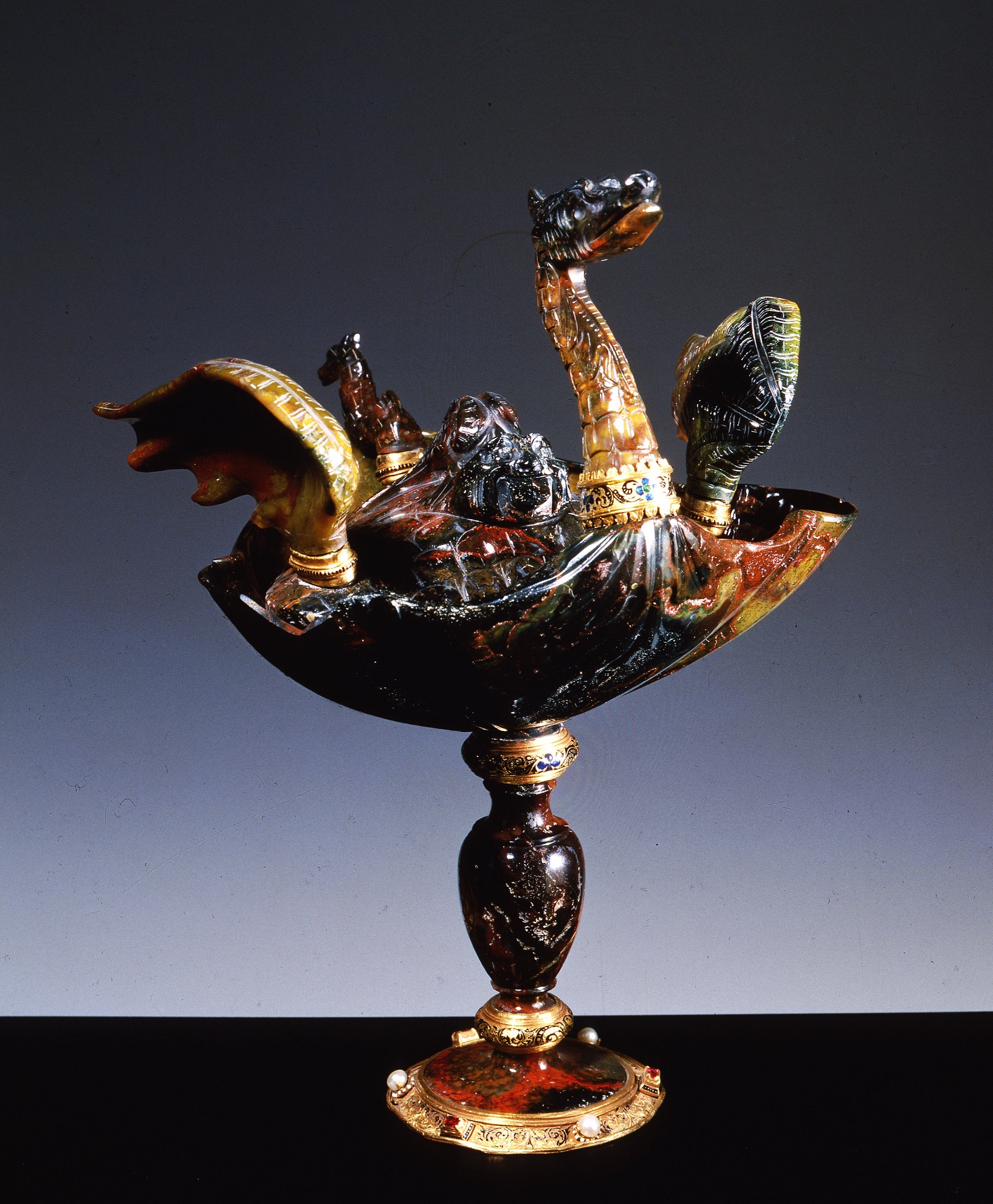 This elegant piece is thought to be the work of the Saracchi workshop in Milan. Expert crystal cutters and goldsmiths, the Saracchi brothers (Giovanni Ambrogio, Simone, Stefano, Michele, and Raffaello) were engaged in creating elaborate vases with extravagant shapes of birds, fish and fantastic animals that were greatly appreciated at the elegant Italian courts of the Gonzaga, Medici and Savoy families. As well as this piece, the treasury of the Grand Dukes contain other examples that can be traced back to the same workshop, many of which were probably made on the occasion of the wedding of Ferdinand I and Christina of Lorraine.